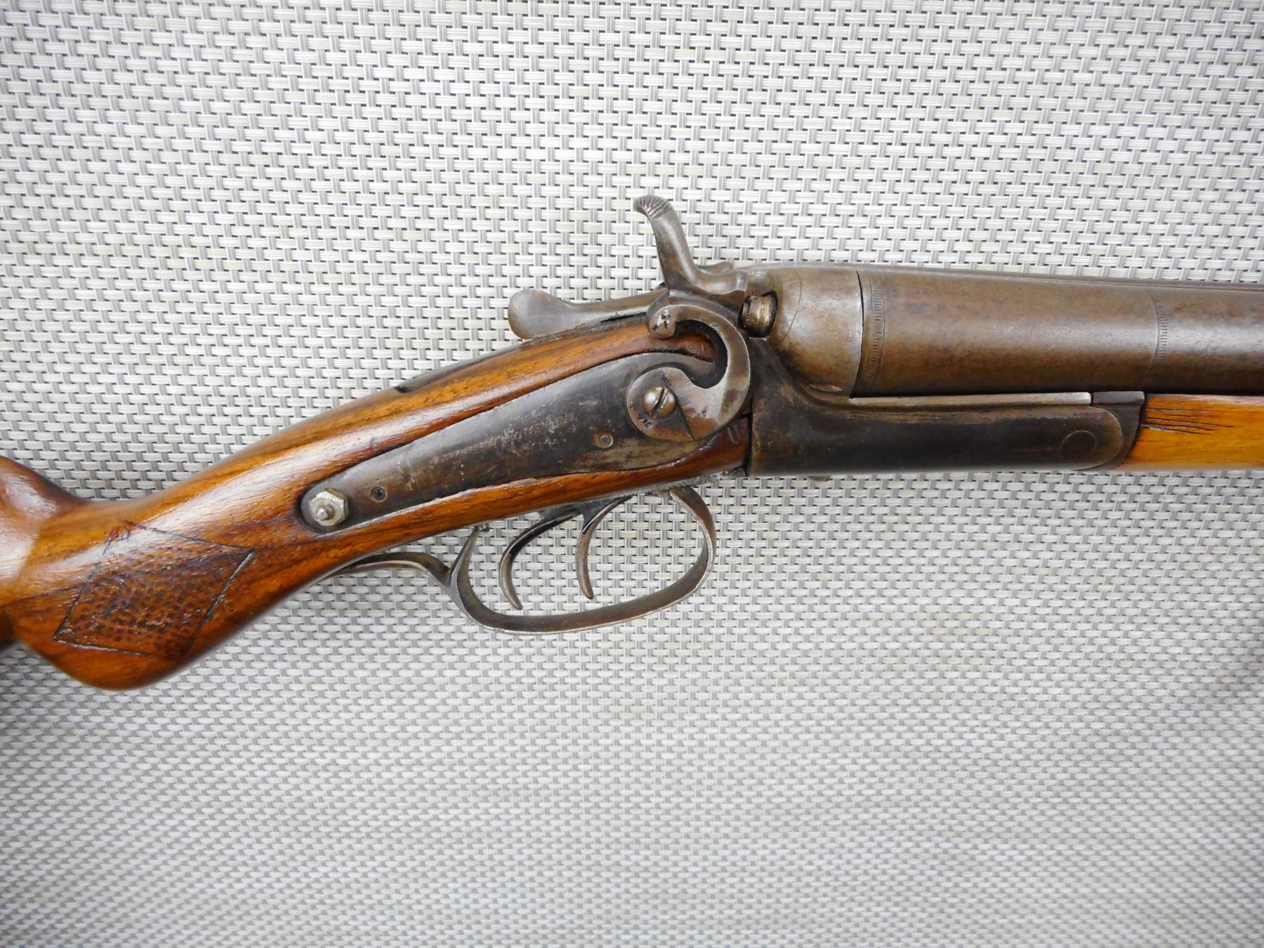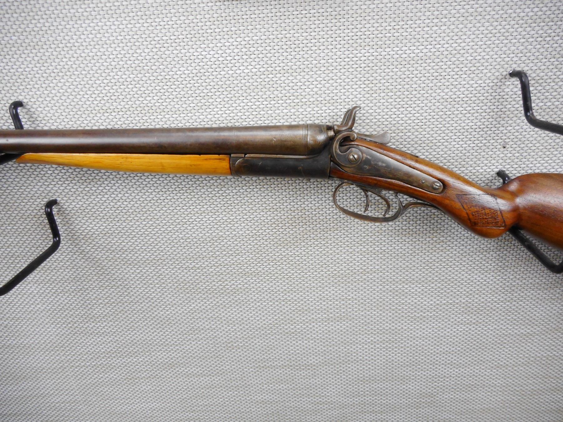 JANSON & SONS , MODEL: SIDE BY SIDE , CALIBER: 12GA X 2 1/2" , FIXED FULL AND MODIFIED CHOKES, BORES ARE GOOD, SIDE LOCK RETAINING SCREW HAS BEEN REPLACED, SHOWS EXTENSIVE HANDLING MARKS, REPLACED STEEL BUTT PLATE, ACTION IS LOOSE , SERIAL # 11455 , ACTION: SIDE BY SIDE BREAK ACTION SHOTGUN , BARREL LENGTH: 30" , CONDITION: 4/10 , STOCK # 8674 , CLASS: CANADIAN NON RESTRICTED CLASS