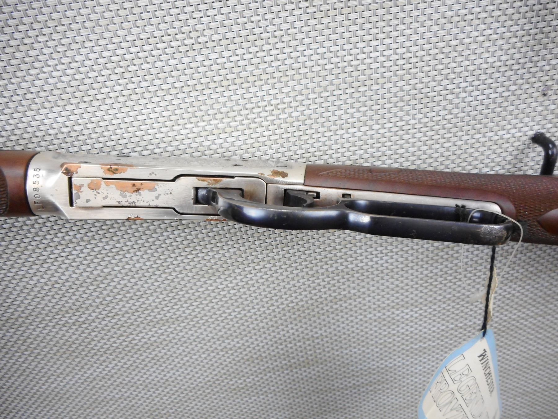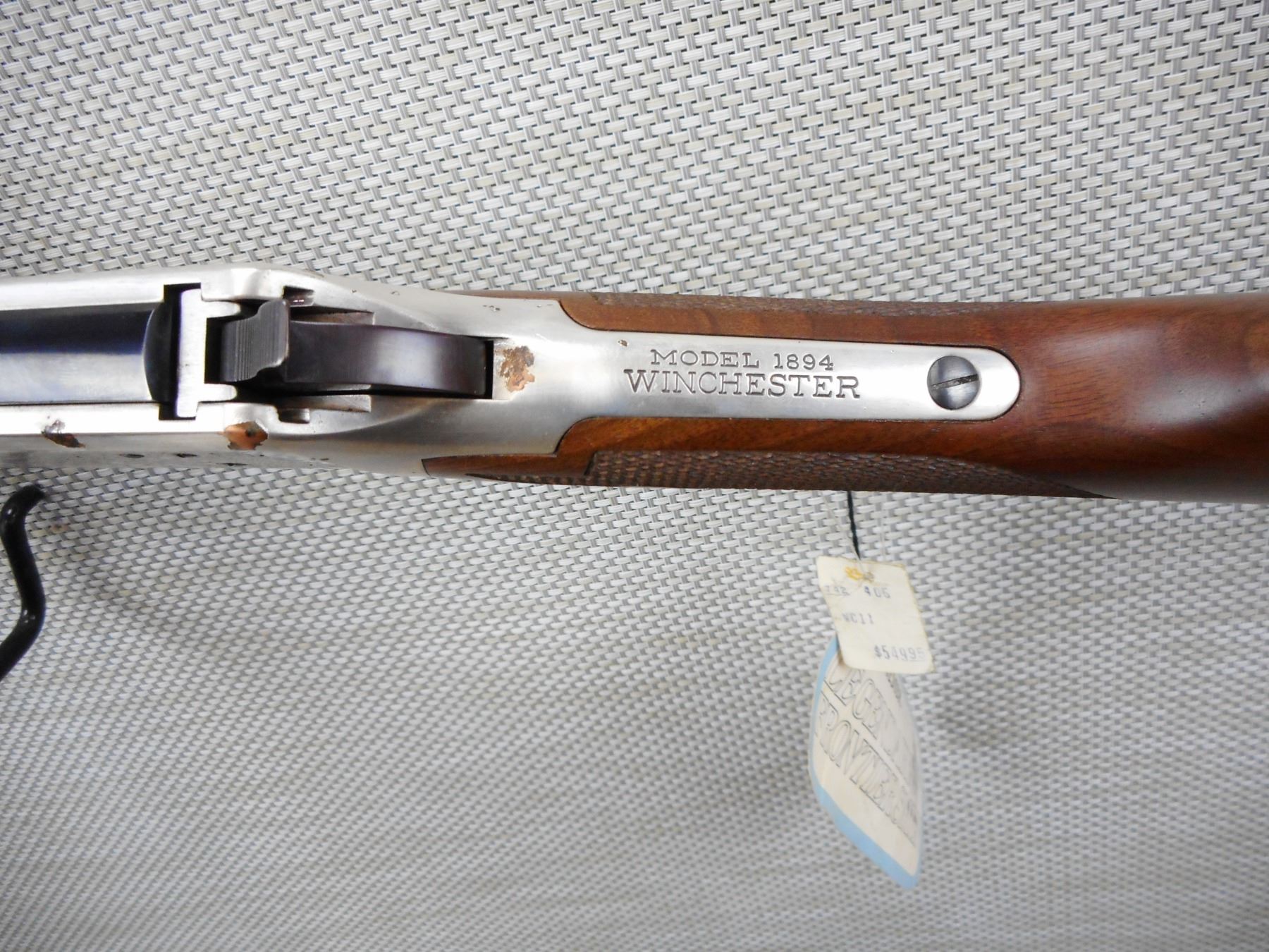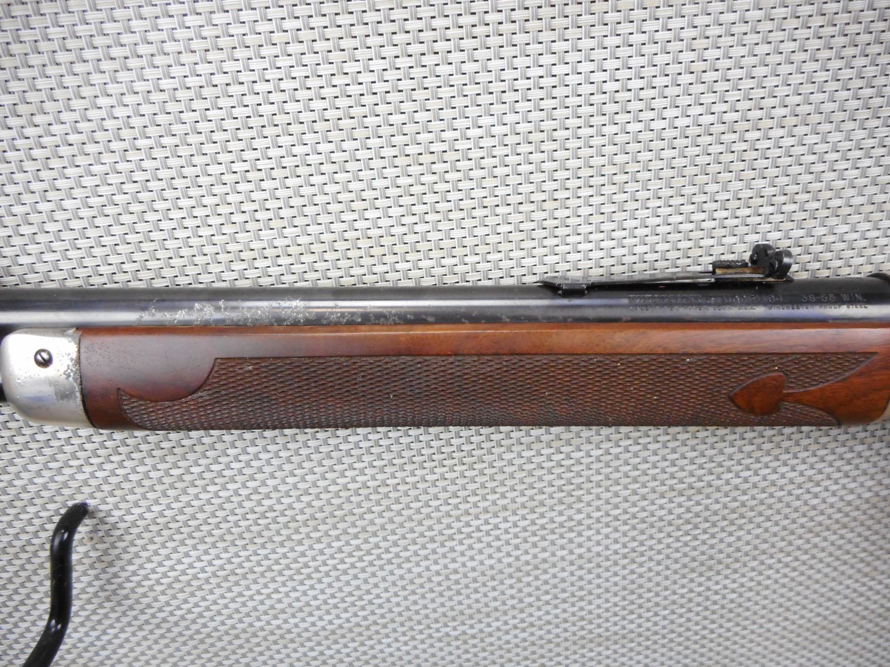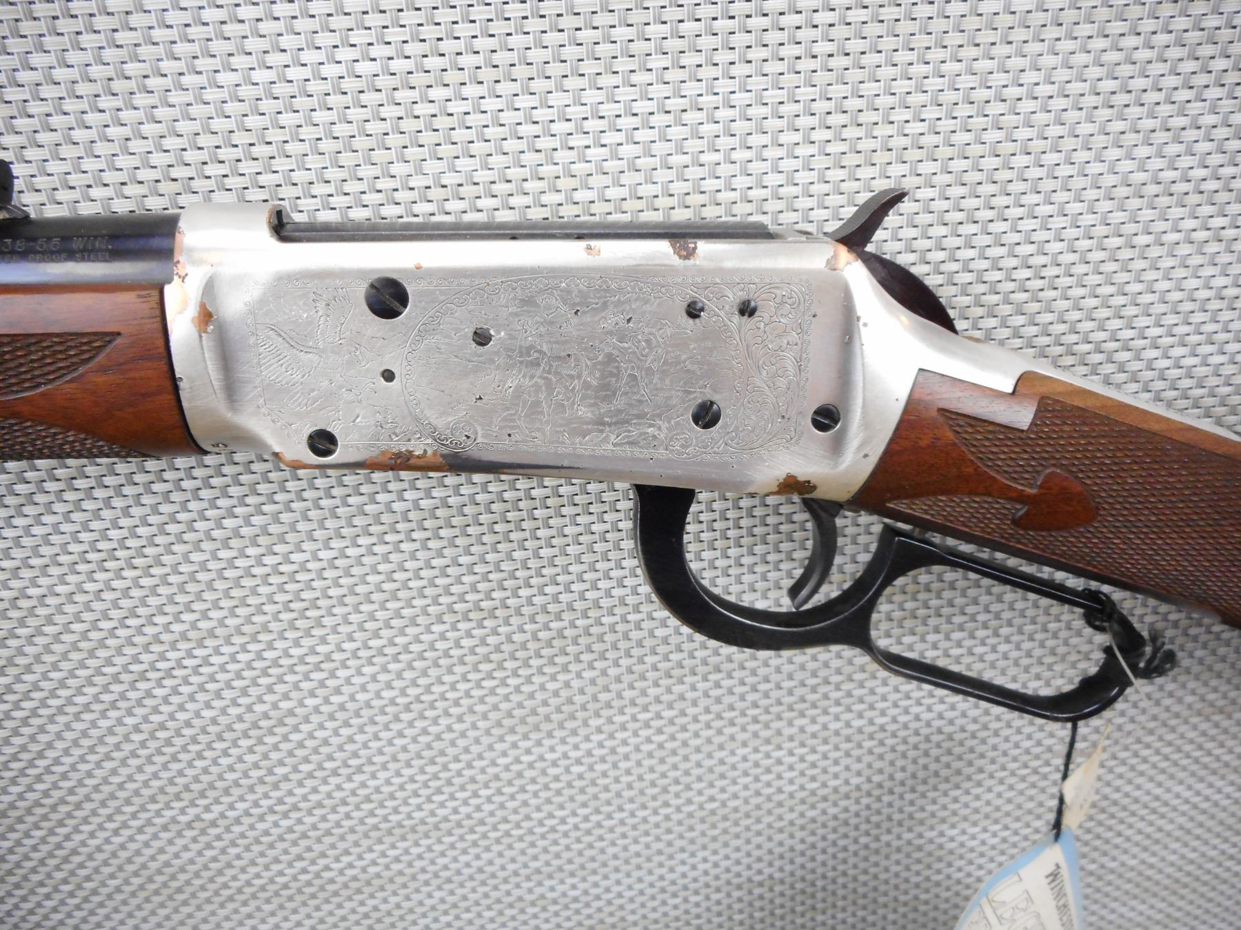 WINCHESTER , MODEL: 1894, COMMEMORATIVE 94 LEGENDARY FRONTIERSMAN CARBINE , CALIBER: 38-55 WIN , EXCELLENT BORE, SCATTERED PITTING AND PLATING LOSS OVERALL, BLADE FRONT AND ADJUSTABLE REAR SIGHT, CHECKERED FOREND AND STRAIGHT GRIP BUTT STOCK WITH STEEL BUTT PLATE, SHOWS SOME HANDLING MARKS TO THE WOOD , SERIAL # LF38530 , ACTION: LEVER ACTION RIFLE , BARREL LENGTH: 24" , CONDITION: 5/10 , STOCK # 8678 , CLASS: CANADIAN NON RESTRICTED CLASS