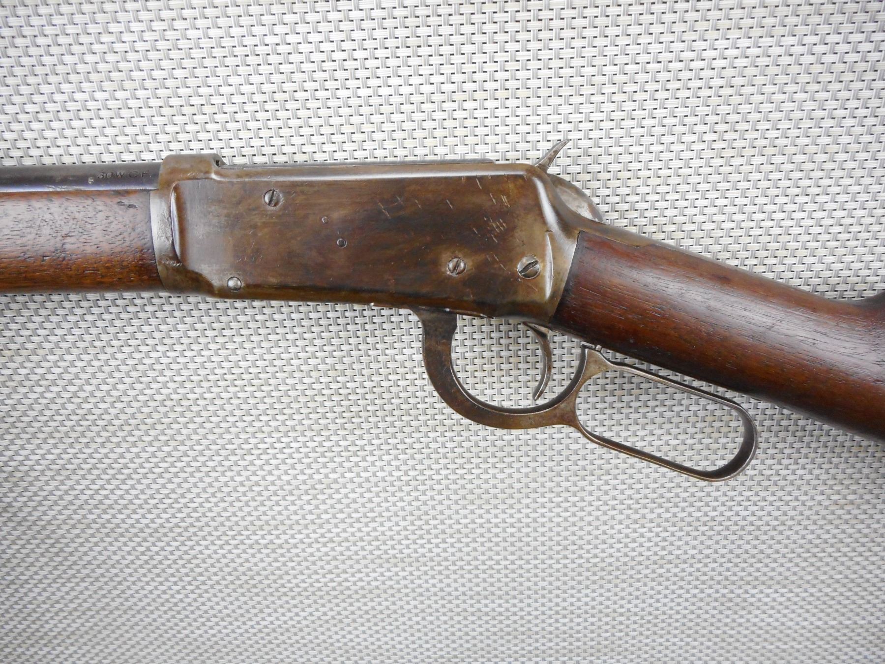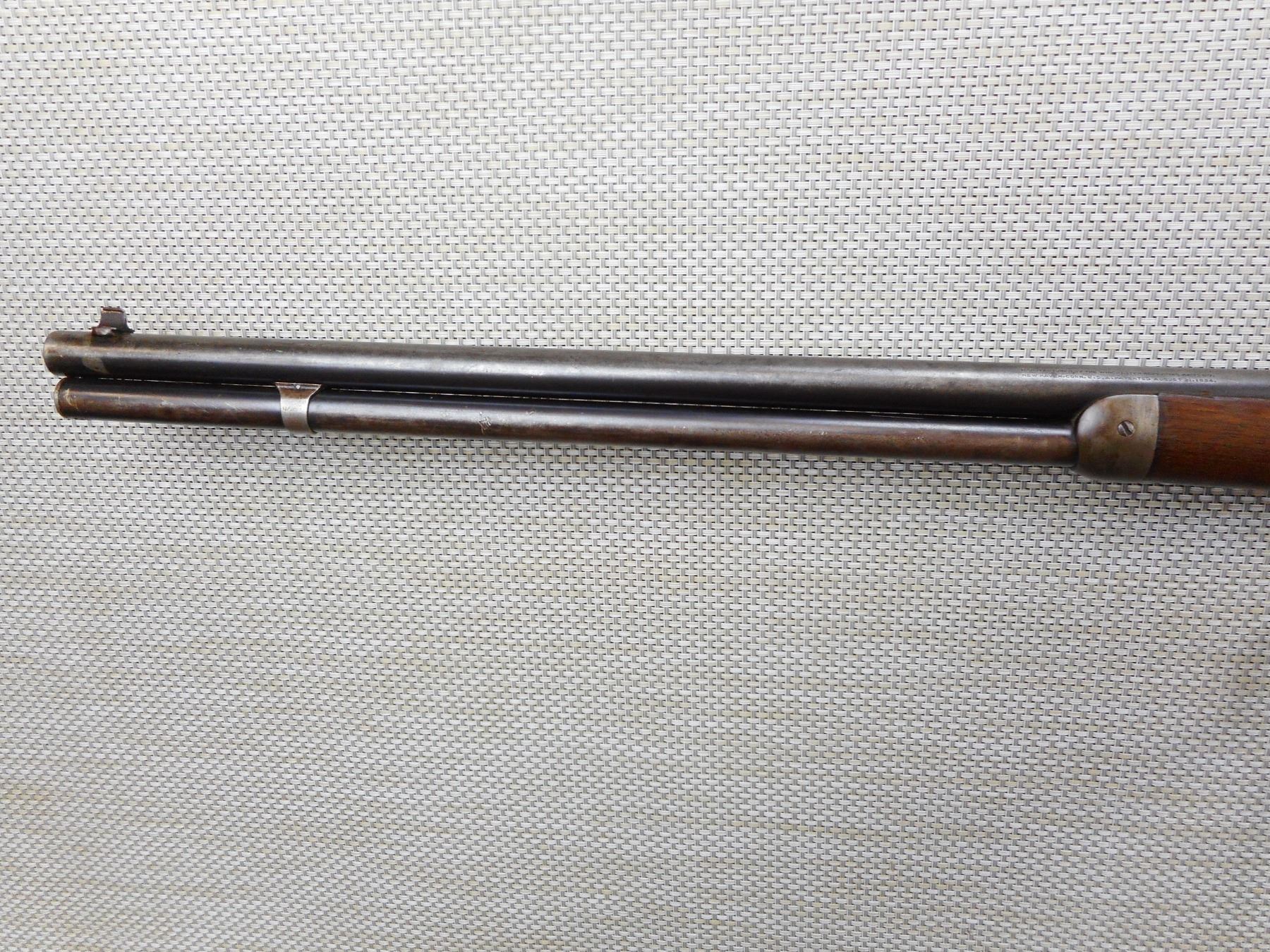 WINCHESTER , MODEL: 94 , CALIBER: 30 WCF , MANUFACTURED IN 1912, STRONG RIFLING WITH MINOR GROOVE PITTING IN THE BORE, BLADE FRONT AND ADJUSTABLE REAR SIGHT, SHOWS SOME HANDLING MARKS, CRESCENT BUTT PLATE, MINOR MARING OF SCREWS, RETAINS SOME ORIGINAL BLUEING , SERIAL # 677945 , ACTION: LEVER ACTION RIFLE , BARREL LENGTH: 26" , CONDITION: 5/10 , STOCK # 8681 , CLASS: CANADIAN NON RESTRICTED CLASS