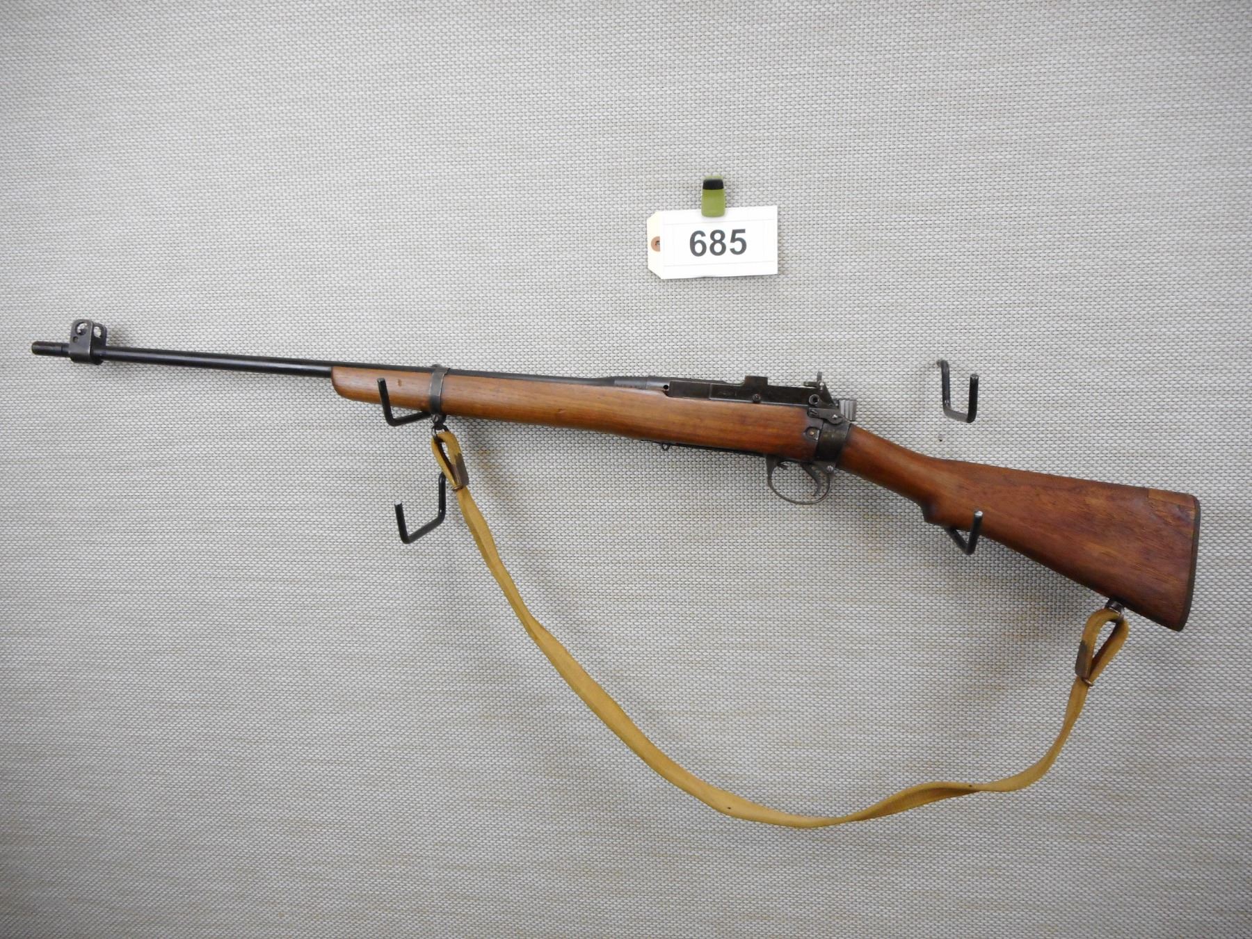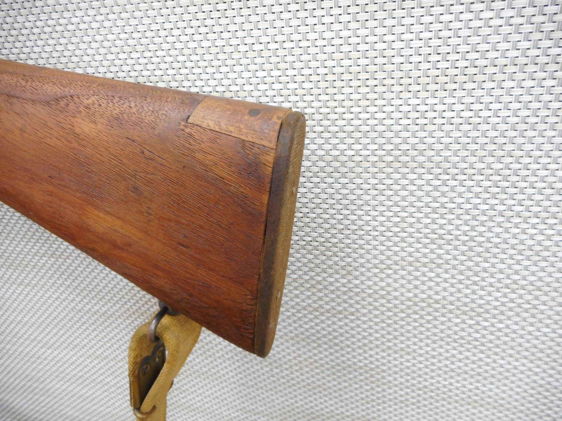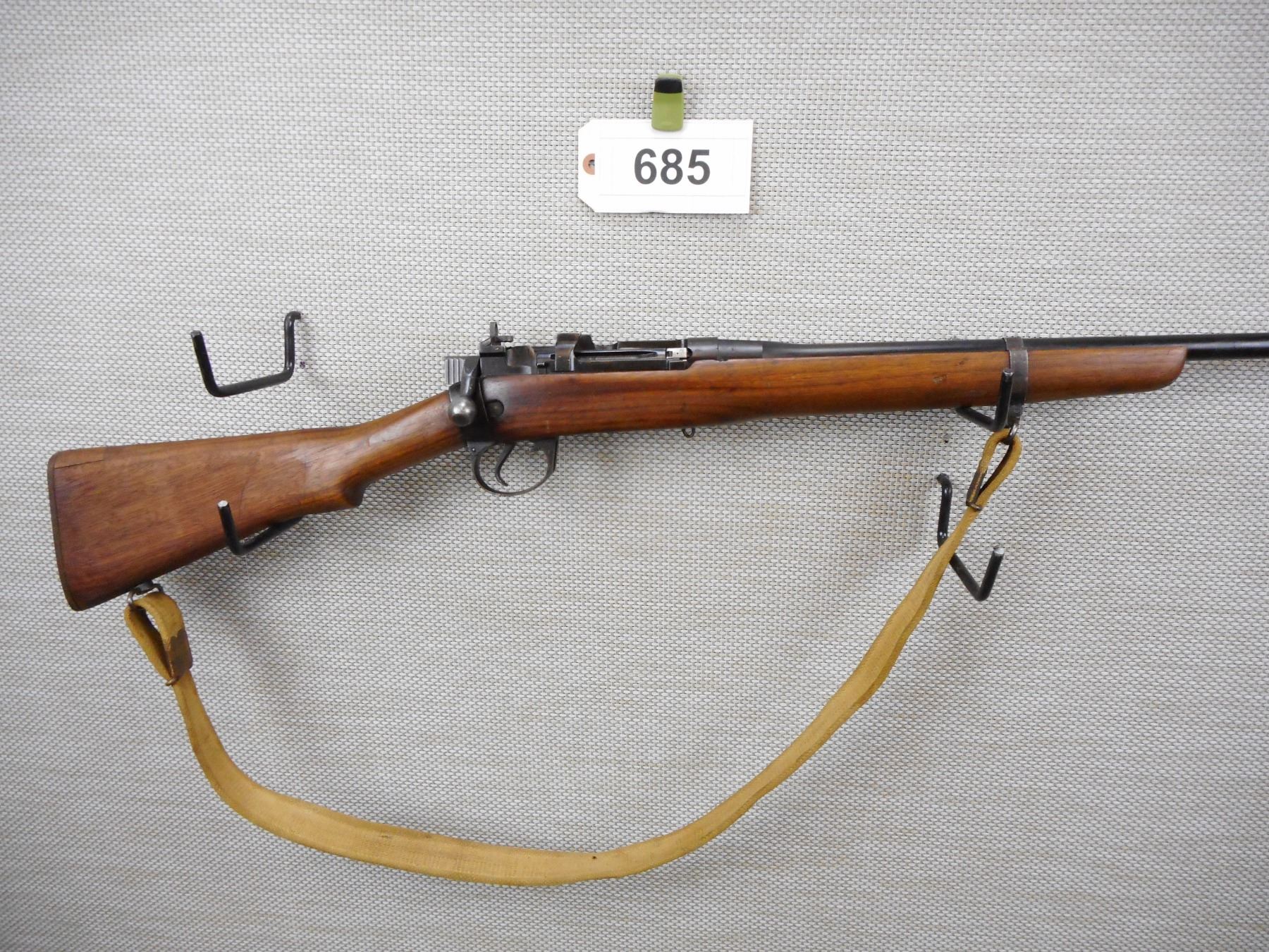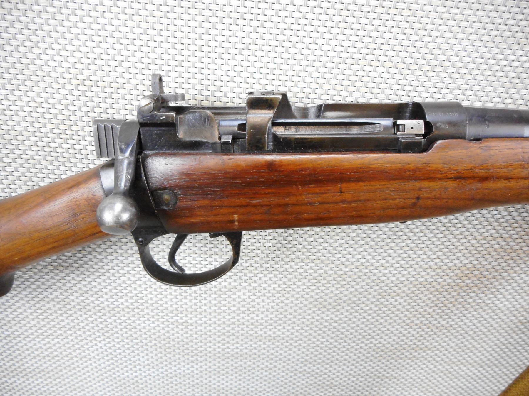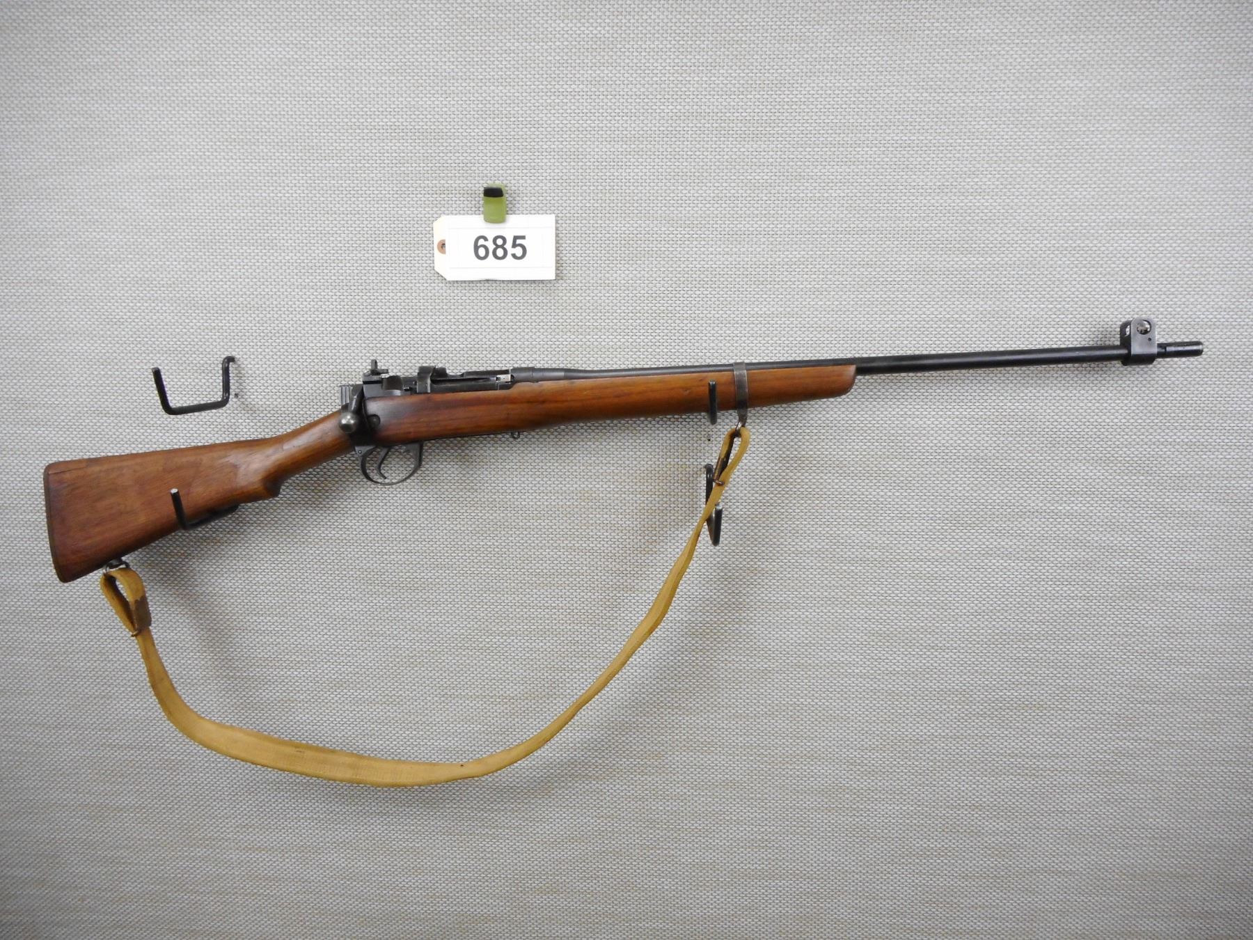 LEE ENFIELD , MODEL: NO4 MARK I SPORTER , CALIBER: 303 BR , DOES NOT HAVE A MAGAZINE, BRD ARROW MARKED, BOLT AND RECEIVER DON'T MATCH BY SERIAL #, BARLEY CORN FRONT AND PEEP APERTURE REAR SIGHT, VERY GOOD BORE, ORIGINAL MILITARY CANVAS SLING, REPLACED BUTT PLATE, SHOWS SOME HANDLING MARKS , SERIAL # S12735A , ACTION: BOLT ACTION RIFLE , BARREL LENGTH: 25 1/2" , CONDITION: 5/10 , STOCK # 8690 , CLASS: CANADIAN NON RESTRICTED CLASS
