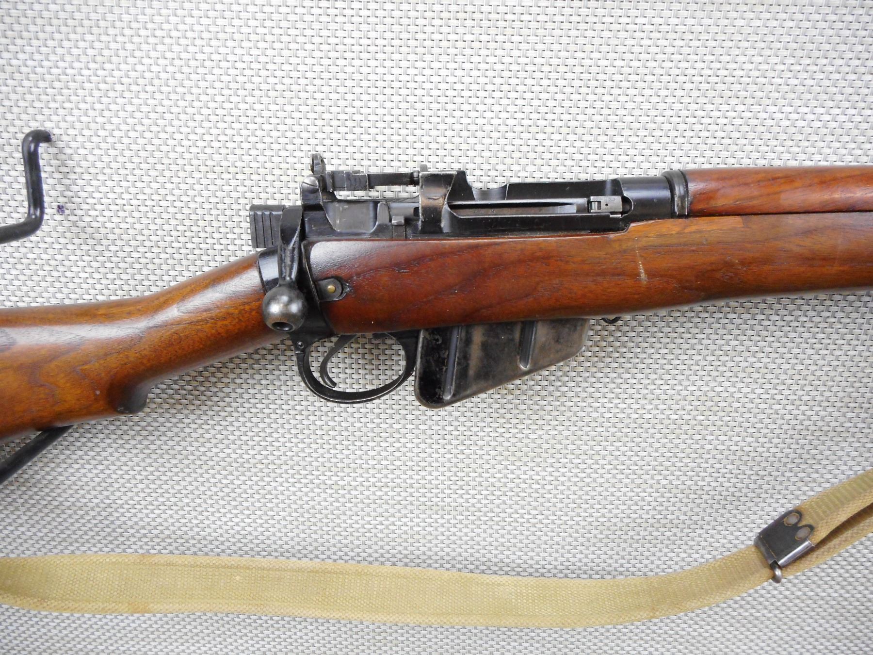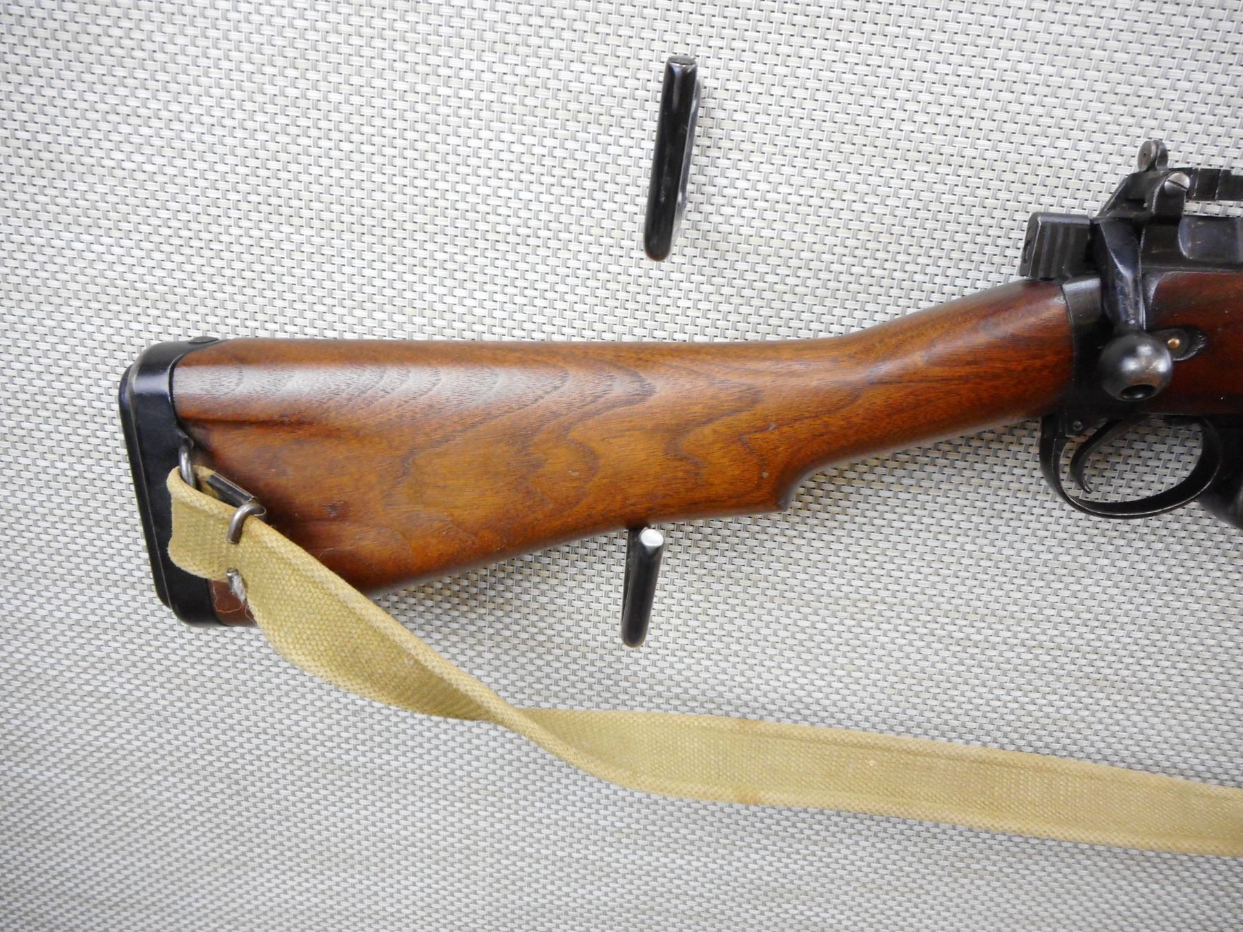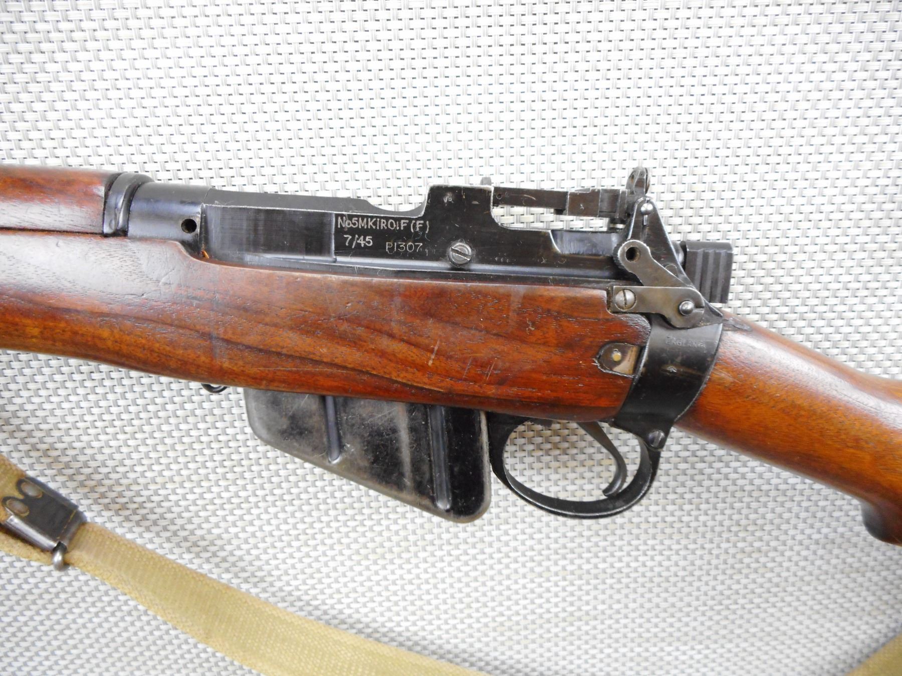 WWII ERA, LEE ENFIELD , MODEL: NO 5 JUNGLE CARBINE , CALIBER: 303 BR , COMES WITH MAGAZINE, WWII ERA DATED 7/45, WITH BRD ARROW AND MATCHING BOLT AND RECEIVER BY SERIAL NO, HAS CANVAS SLING ATTACHED, MODIFIED FRONT SIGHT (MISSING THE BARLEY CORN PROTECTORS), BAYONET LUG HAS BEEN REMOVED, PEEP APERTURE REAR SIGHT, ORIGINAL STEEL AND RUBBER BUTT PLATE, BORE IS EXCELLENT , SERIAL # P1307 , ACTION: BOLT ACTION RIFLE , BARREL LENGTH: 19" , CONDITION: 5/10 , STOCK # 8699 , CLASS: CANADIAN NON RESTRICTED CLASS