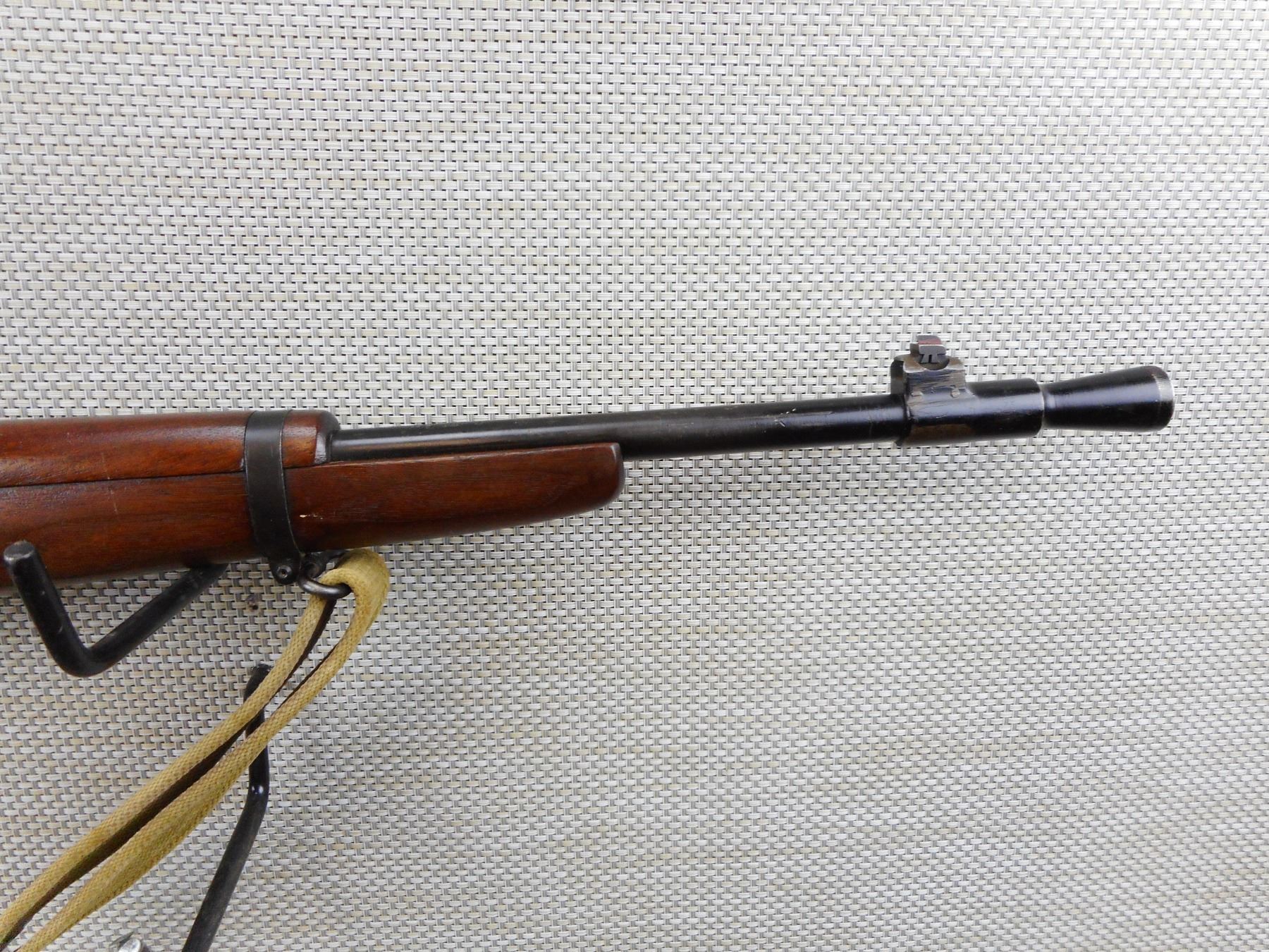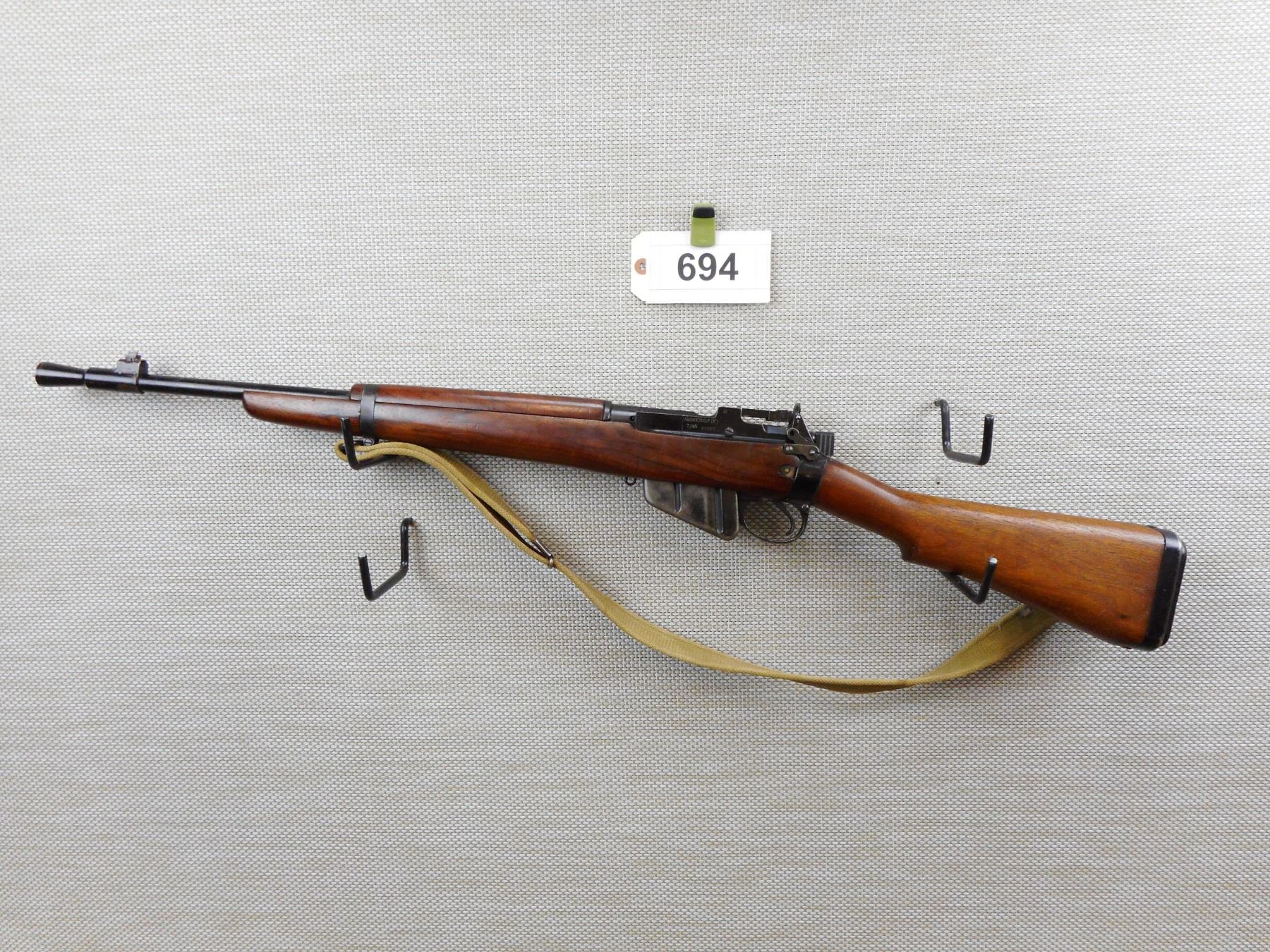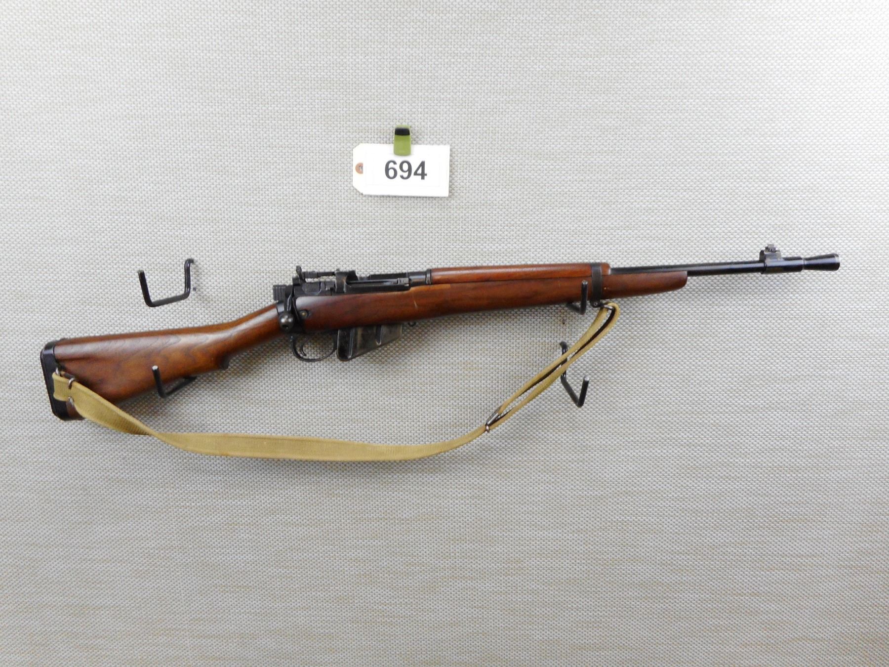 WWII ERA, LEE ENFIELD , MODEL: NO 5 JUNGLE CARBINE , CALIBER: 303 BR , COMES WITH MAGAZINE, WWII ERA DATED 7/45, WITH BRD ARROW AND MATCHING BOLT AND RECEIVER BY SERIAL NO, HAS CANVAS SLING ATTACHED, MODIFIED FRONT SIGHT (MISSING THE BARLEY CORN PROTECTORS), BAYONET LUG HAS BEEN REMOVED, PEEP APERTURE REAR SIGHT, ORIGINAL STEEL AND RUBBER BUTT PLATE, BORE IS EXCELLENT , SERIAL # P1307 , ACTION: BOLT ACTION RIFLE , BARREL LENGTH: 19" , CONDITION: 5/10 , STOCK # 8699 , CLASS: CANADIAN NON RESTRICTED CLASS