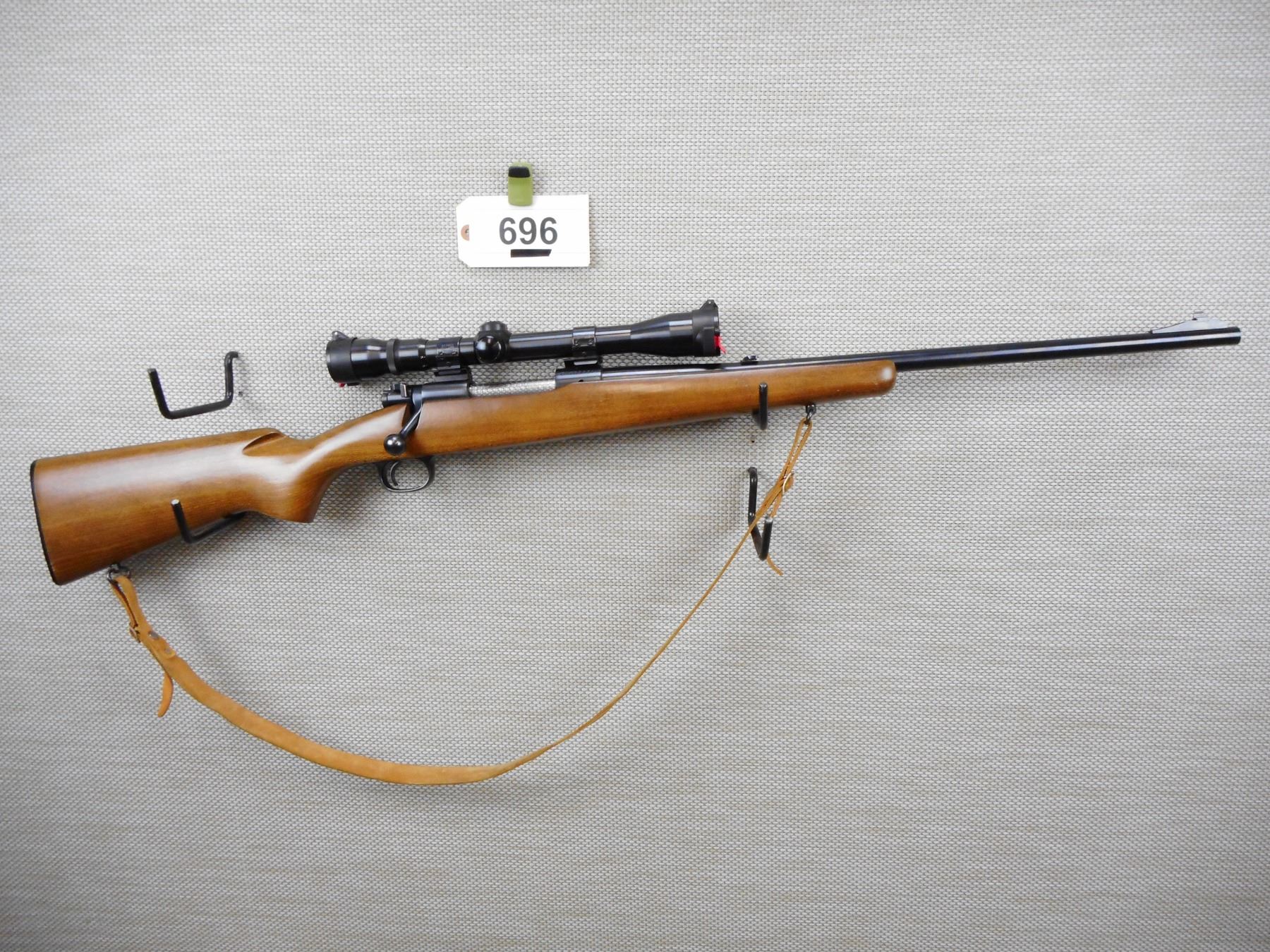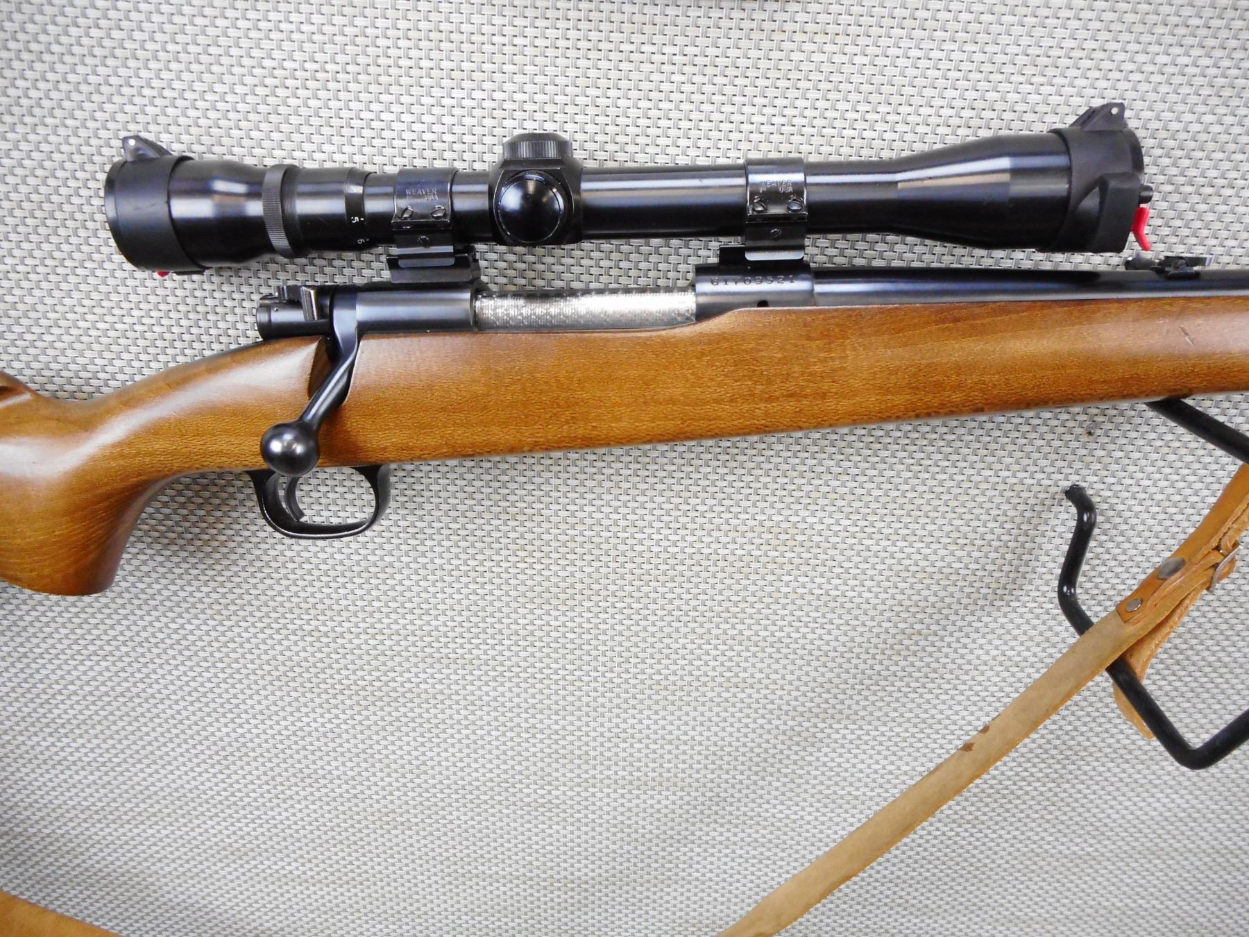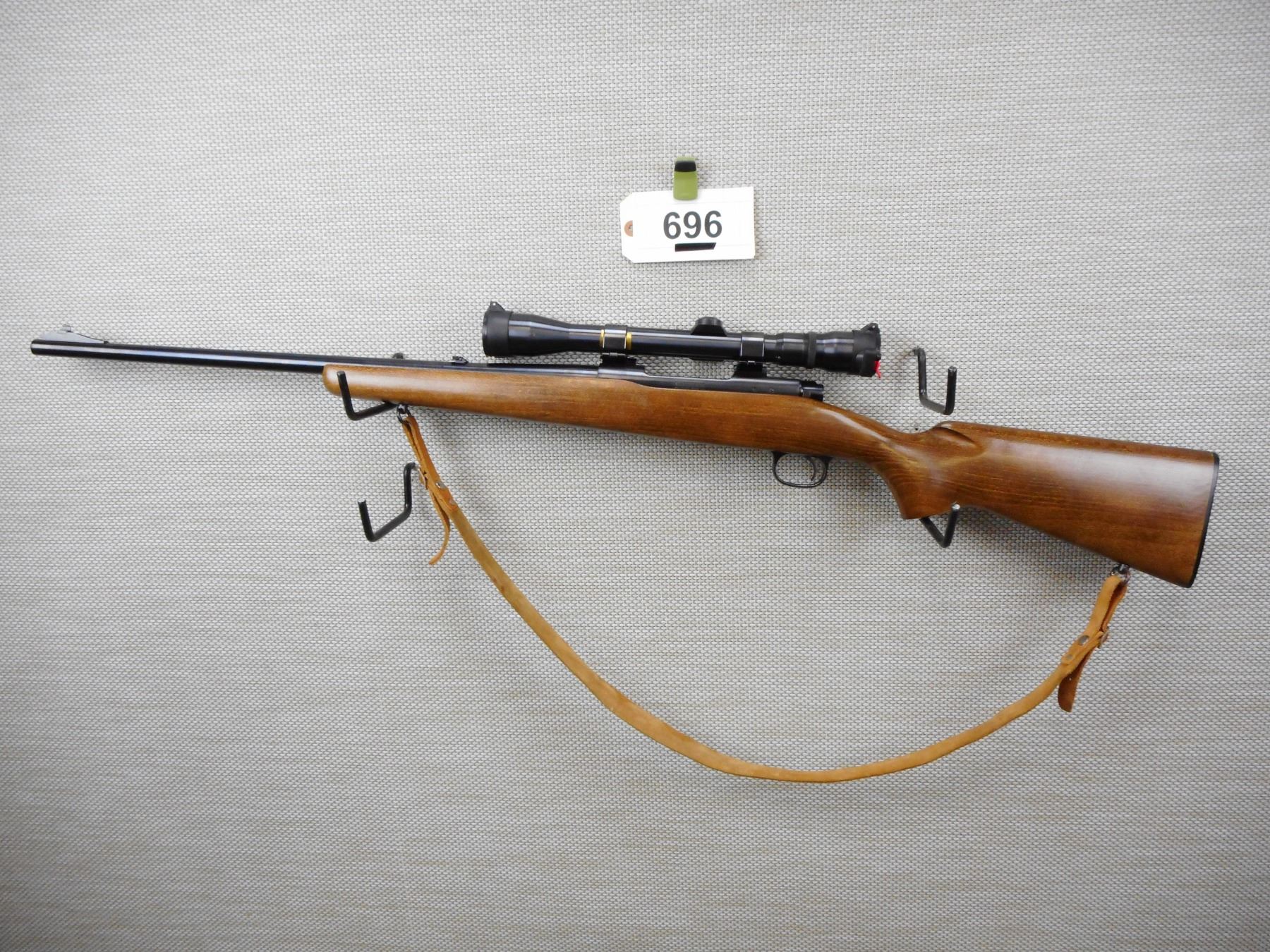 WINCHESTER , MODEL: RANGER , CALIBER: 30-06 SPRG , EXCELLENT BORE, RAMP FRONT AND FLIP ADJUSTABLE REAR SIGHT, FEATURES AN UNKNOWN 3-9 SCOPE ON WEAVER MOUNTS WITH BUTLER CREEK LENS COVERS,ONE PIECE WALNUT STOCK WITH PLASTIC BUTT PLATE, SLING SWIVELS WITH LEATHER SLING, SHOWS VERY LITTLE HANDLING MARKS , SERIAL # G1709521 , ACTION: BOLT ACTION RIFLE , BARREL LENGTH: 22" , CONDITION: 7/10 , STOCK # 8701 , CLASS: CANADIAN NON RESTRICTED CLASS