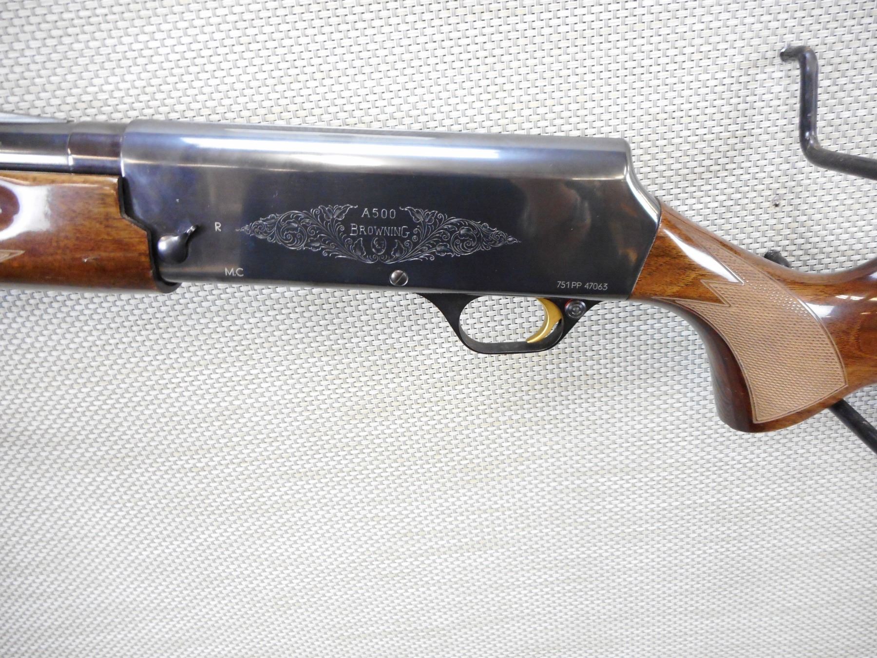 BROWNING , MODEL: A-500 , CALIBER: 12GA X 3" , COMES WITH CHOKES, BORE IS EXCELLENT, BEAD FRONT SIGHT, VENTED RIB BARREL, CHECKERED FOREND AND SEMI PISTOL GRIP BUTT STOCK WITH RUBBER RECOIL PAD, SHOWS VERY LITTLE HANDLING MARKS , SERIAL # 7511PP47063 , ACTION: SEMI AUTOMATIC SHOTGUN , BARREL LENGTH: 30" , CONDITION: 8/10 , STOCK # 8742 , CLASS: CANADIAN NON RESTRICTED CLASS