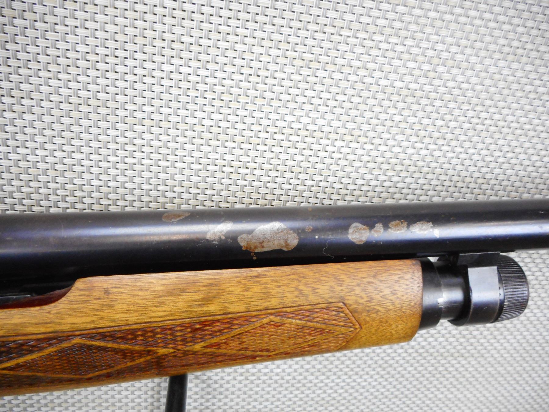 WINCHESTER , MODEL: 2200 , CALIBER: 12GA X 2 3/4" , FIXED FULL CHOKE, BORE IS VERY GOOD, BEAD FRONT SIGHT, CHECKERED FOREND AND PLAIN BUTT STOCK WITH PLASTIC BUTT PLATE, SHOWS SOME HANDLING MARKS, SOME BLUEING MISSING ON THE BARREL , SERIAL # L797210 , ACTION: PUMP ACTION SHOTGUN , BARREL LENGTH: 30" , CONDITION: 5/10 , STOCK # 8752 , CLASS: CANADIAN NON RESTRICTED CLASS