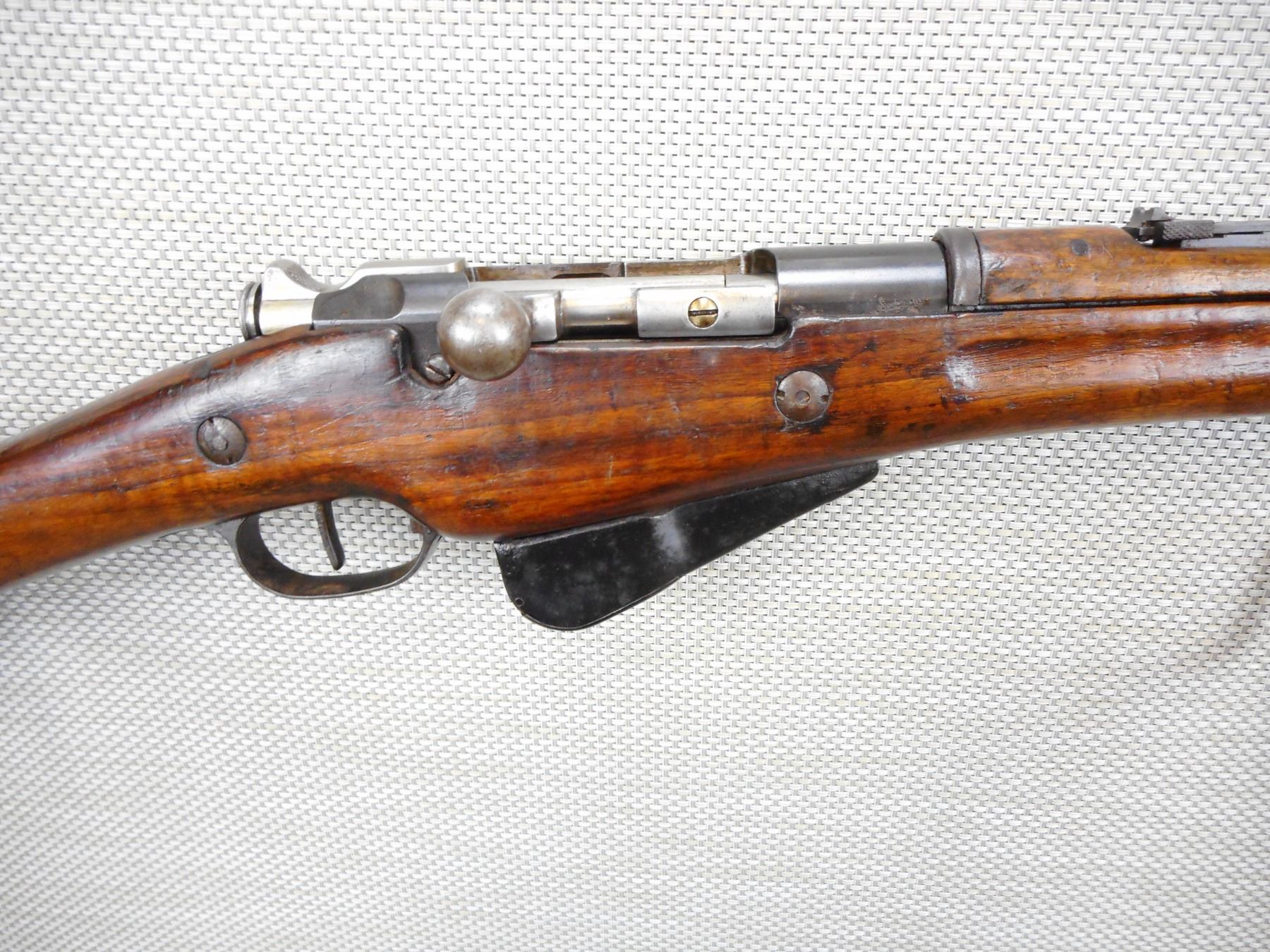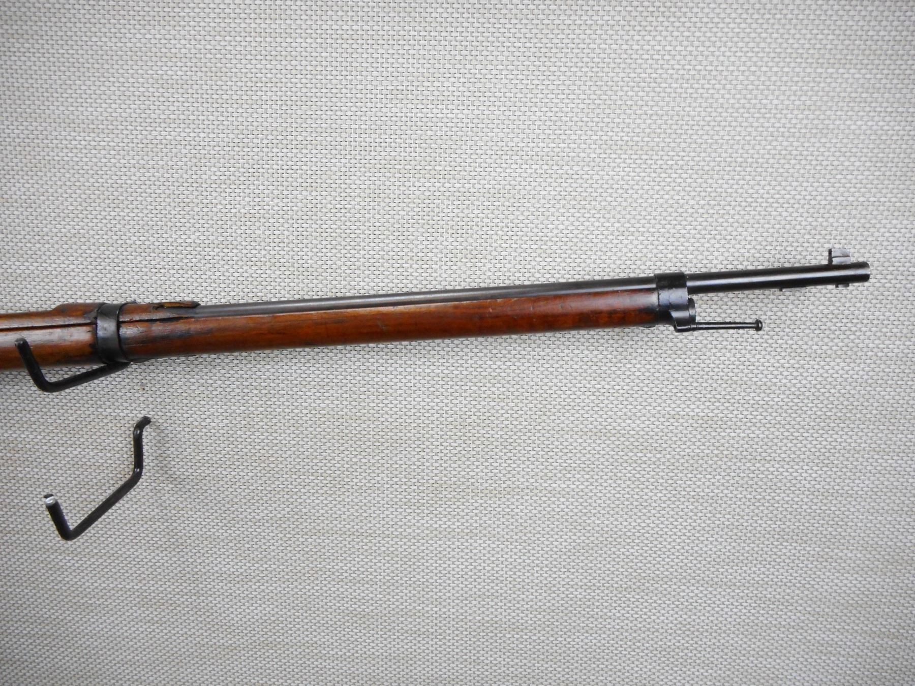 LEBEL , MODEL: 1907/15 , CALIBER: 8MM LEBEL , BORE IS GOOD, NOTCHED BLOCK FRONT SIGHT AND ADJUSTABLE REAR SIGHT, SLING SWIVEL LOOPS, RETAINS FULL MILITARY CONFIGURATION, SHOWS SOME HANDLING MARKS, STEEL BUTT PLATE, LARGE CHIP OUT OF THE TOP WOOD , SERIAL # 78046 , ACTION: BOLT ACTION RIFLE , BARREL LENGTH: 32" , CONDITION: 6/10 , STOCK # 8774 , CLASS: CANADIAN NON RESTRICTED CLASS