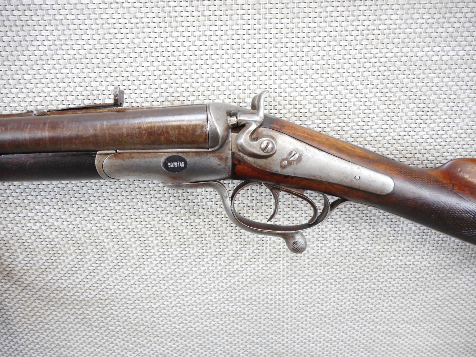 LAMBIN & THEATE , MODEL: CAPE GUN COMBINATION , CALIBER: 44 CAL/ 12GA X 2 1/2" , BELGIAN MADE 1877-1894, DAMASCUS BARRELS, CYLINDER BORE, BORES HAVE SCATTERED PITTING AND STRONG RIFLING, REPLACED BLADE FRONT SIGHT, ADJUSTABLE REAR SIGHT MISSING THE ELEVATOR, SHOWS SOME HANDLING MARKS, CHECKERED FOREND AND STRAIGHT GRIP BUTT STOCK, STEEL BUTT PLATE, DOUBLE HAMMERS, DOUBLE TRIGGERS , SERIAL # N/A , ACTION: BREAK ACTION MULTI BARREL , BARREL LENGTH: 30" , CONDITION: 5/10 , STOCK # 8779 , CLASS: CANADIAN NON RESTRICTED CLASS