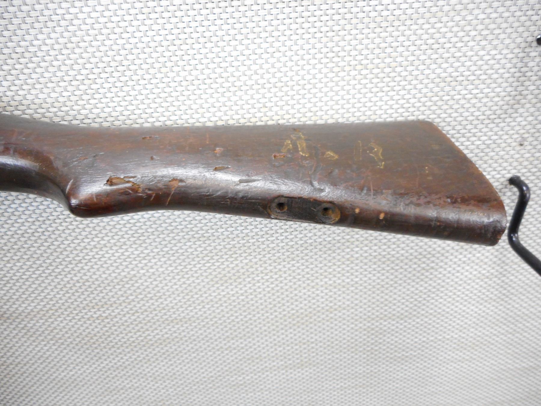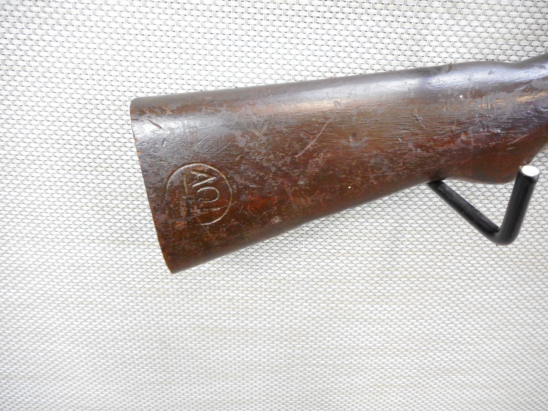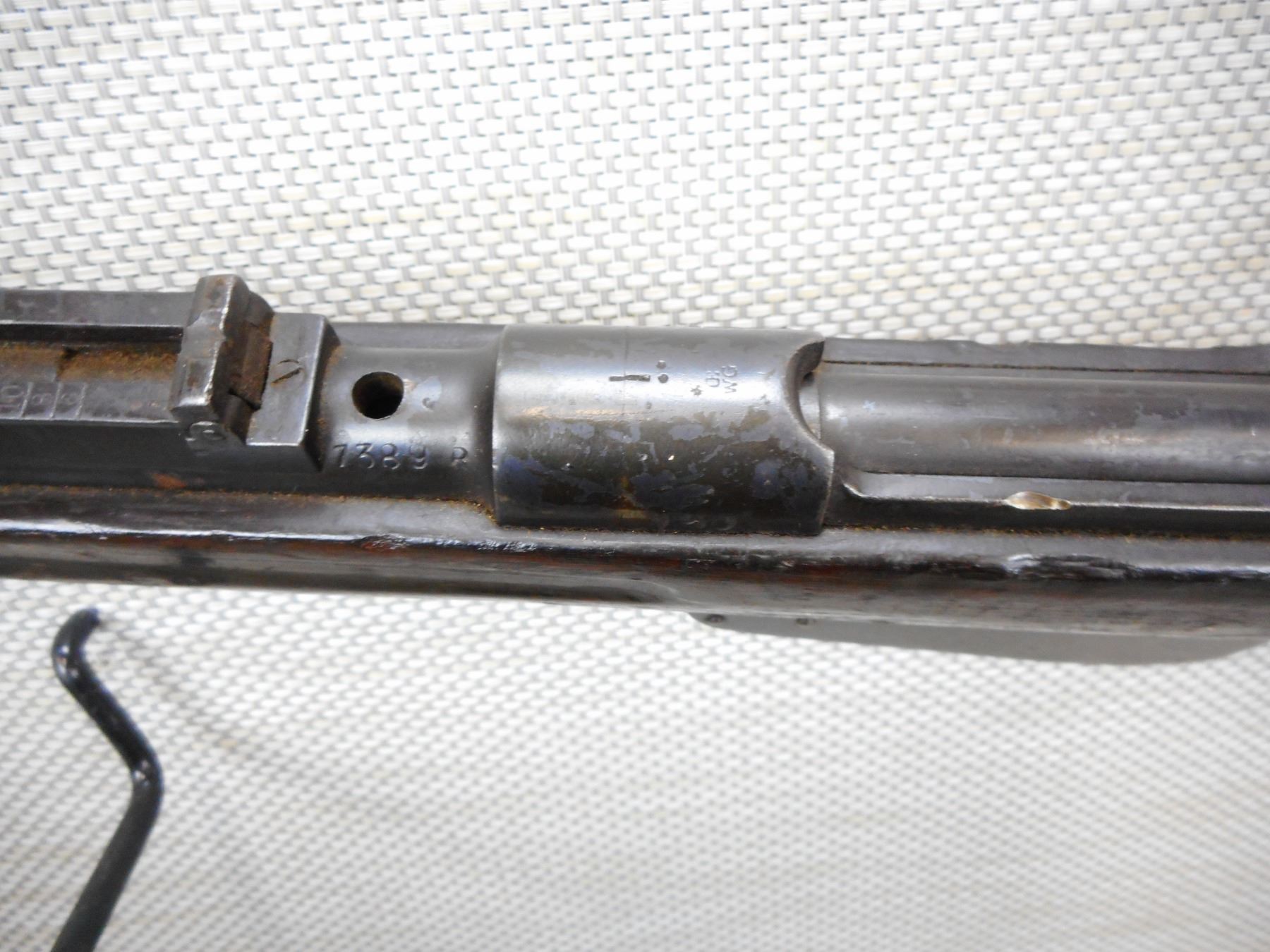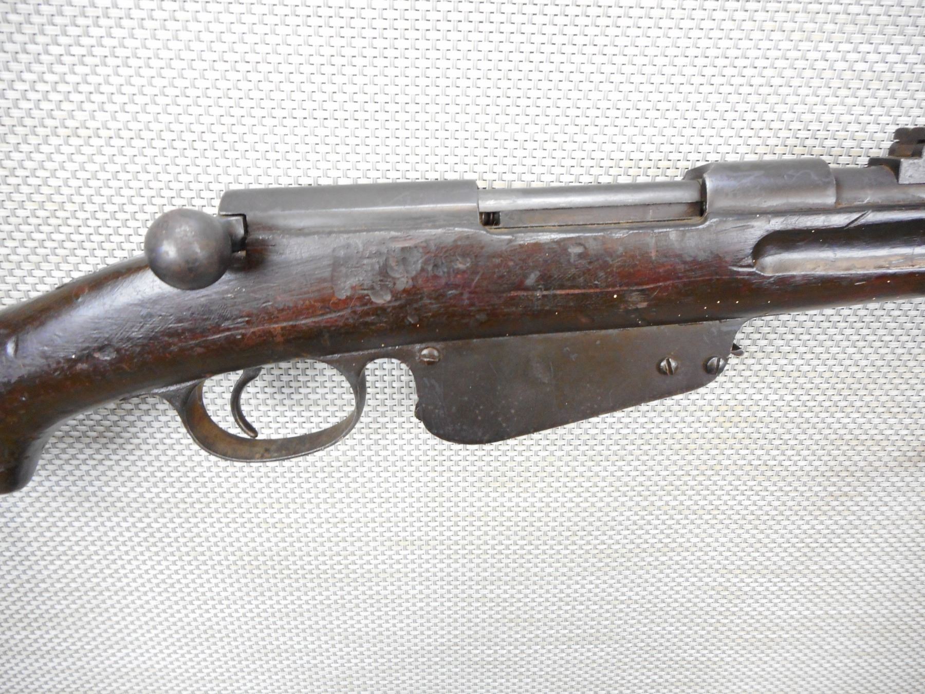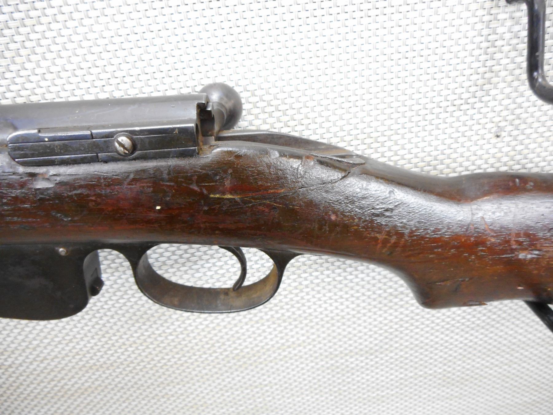 MANNLICHER , MODEL: 1890 , CALIBER: 8 X 50R AUSTRIAN MANNLICHER , MANUFACTURED IN AUSTRIA, BOLT AND RECEIVER MATCH BY SERIAL #, RETAINS FULL MILITARY CONFIGURATION, BORE IS DARK MISSING THE FRONT SIGHT INSERT, ADJUSTABLE REAR SIGHT, FRONT SLING LOOP, MISSING THE REAR SLING LOOP, MISSING THE BUTT PLATE, SHOWS EXTENSIVE HANDLING MARKS, STOCK IS CRACKED AT THE WRIST, BARREL IS DRILLED FOR DRILL PURPOSE SHOULD NOT FIRE , SERIAL # 7389R , ACTION: BOLT ACTION RIFLE , BARREL LENGTH: 29" , CONDITION: 4/10 UNSAFE TO FIRE DUE TO HOLE , STOCK # 8782 , CLASS: CANADIAN NON RESTRICTED CLASS