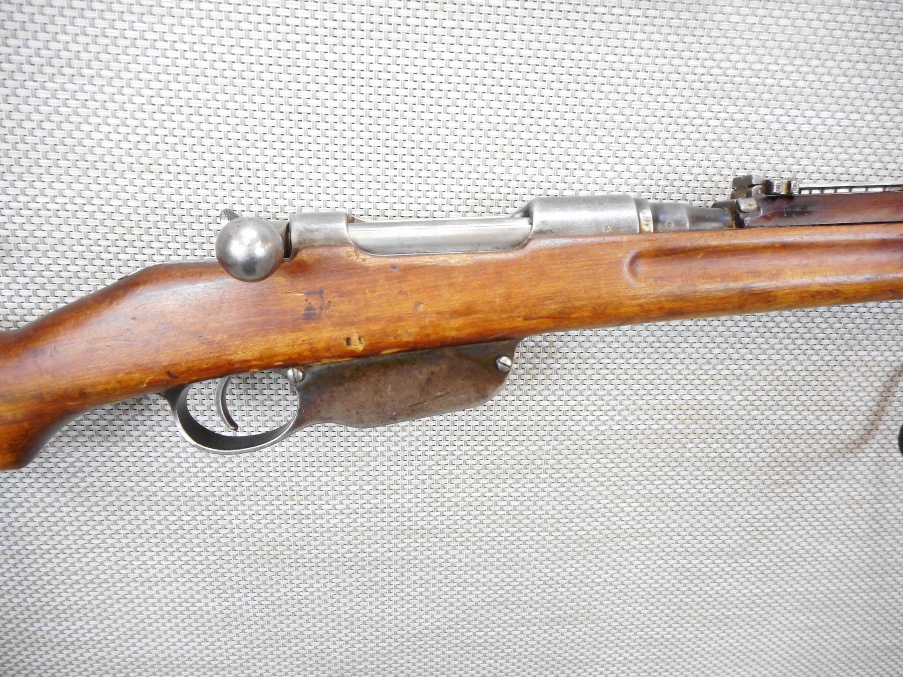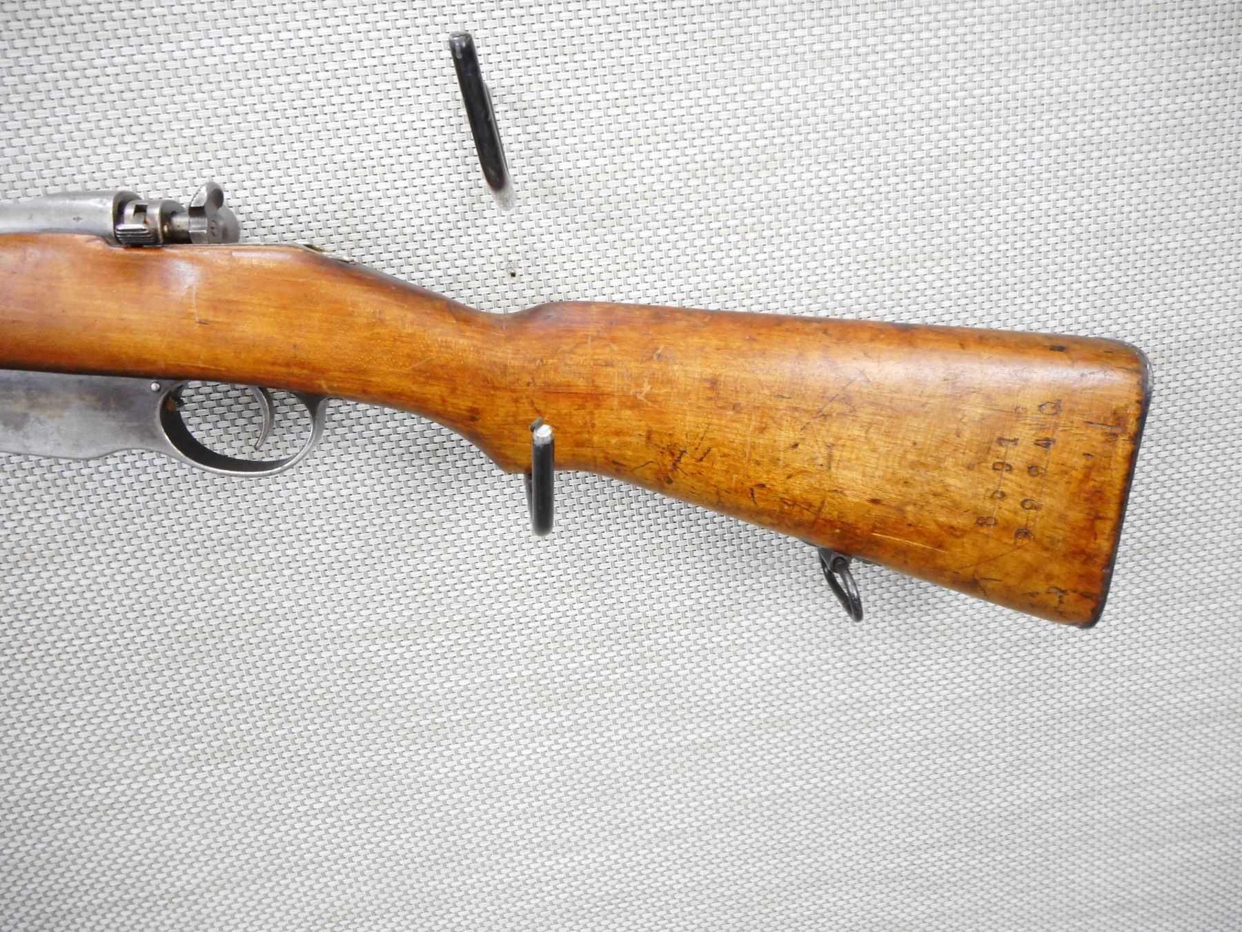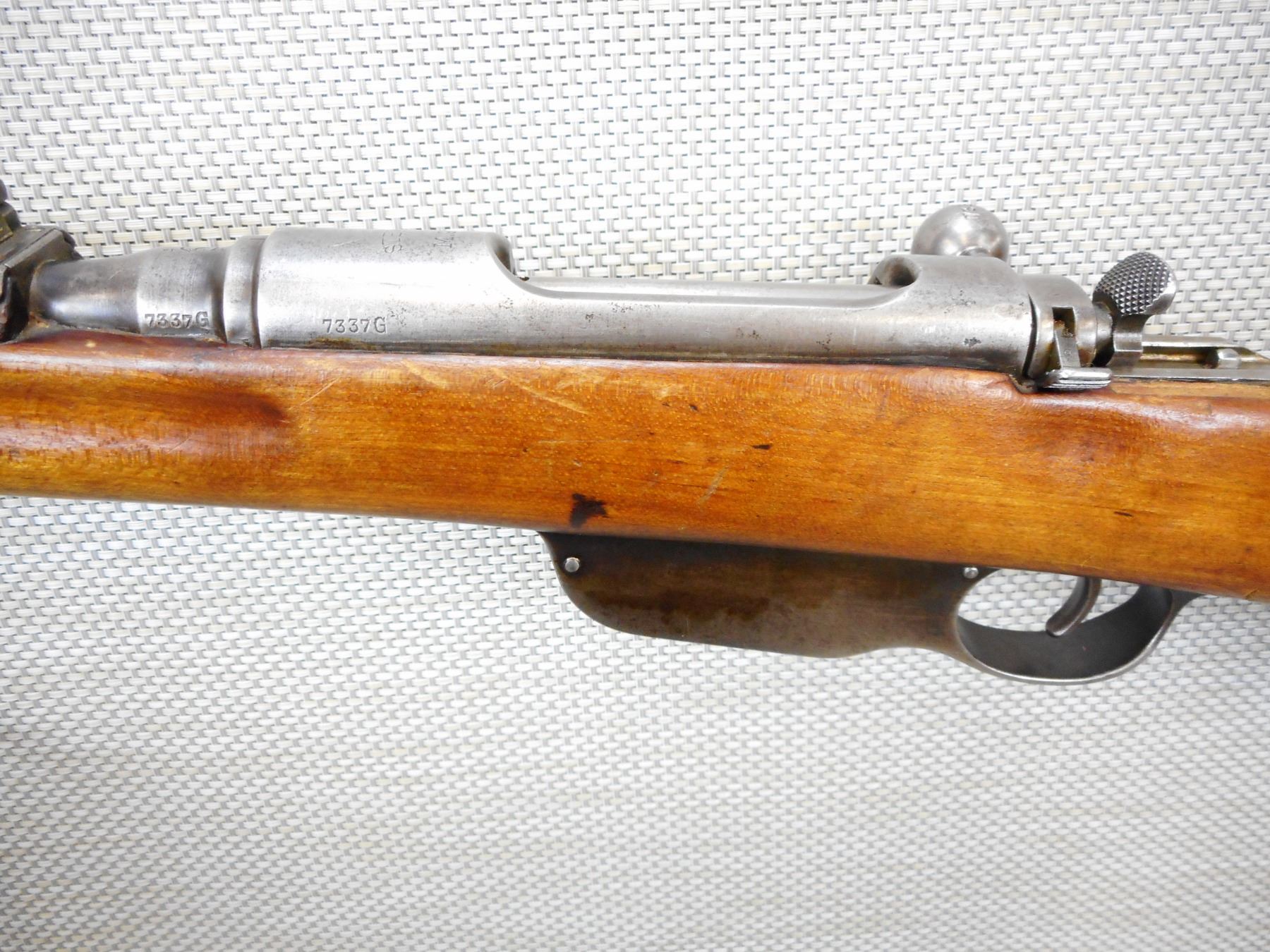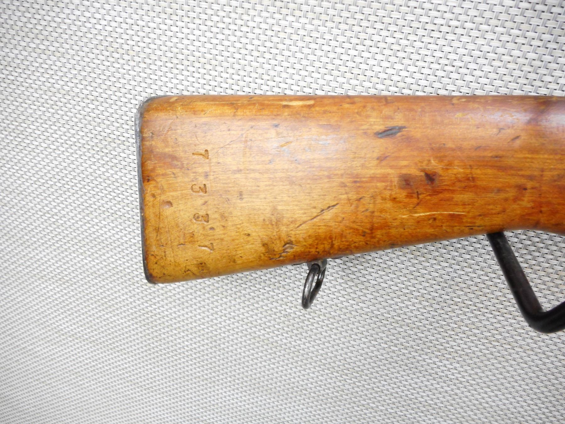 STEYR , MODEL: M95 , CALIBER: 8 X 56R , BOLT AND RECEIVER MATCH BY SERIAL # , RETAINS FULL MILITARY CONFIGURATIONS, BORE IS GOOD, SHOWS SOME HANDLING MARKS, CRACK AT THE WRIST, SHOWS EXTENSIVE HANDLING MARKS, STEEL BUTT PLATE, BLADE FRONT AND ADJUSTABLE REAR SIGHT, SLING SWIVEL LOOPS , SERIAL # 7337G , ACTION: BOLT ACTION RIFLE , BARREL LENGTH: 30" , CONDITION: 5/10 , STOCK # 8783 , CLASS: CANADIAN NON RESTRICTED CLASS