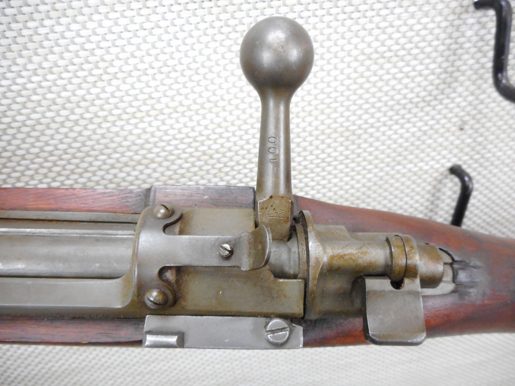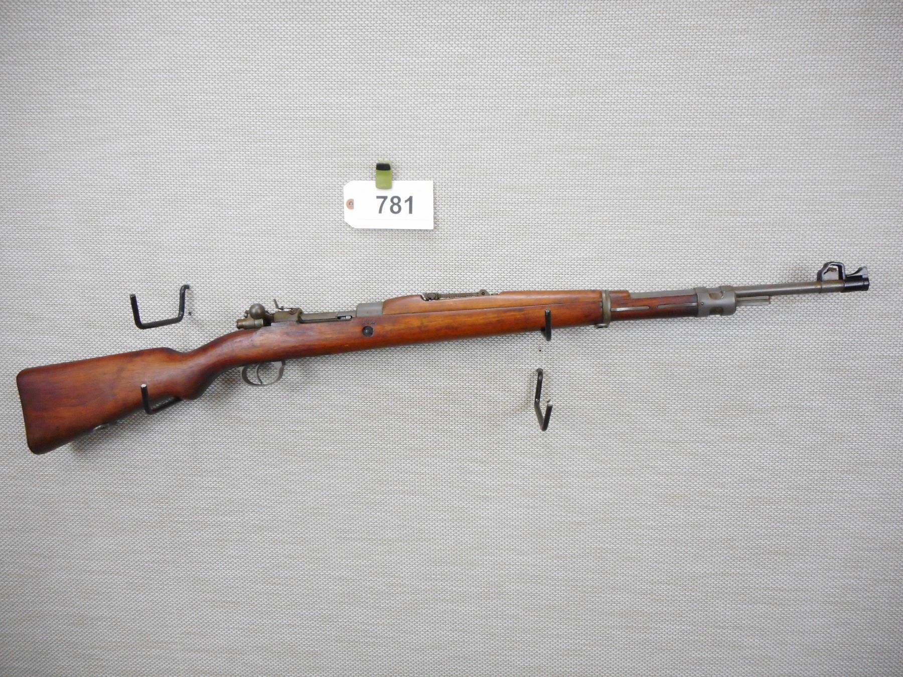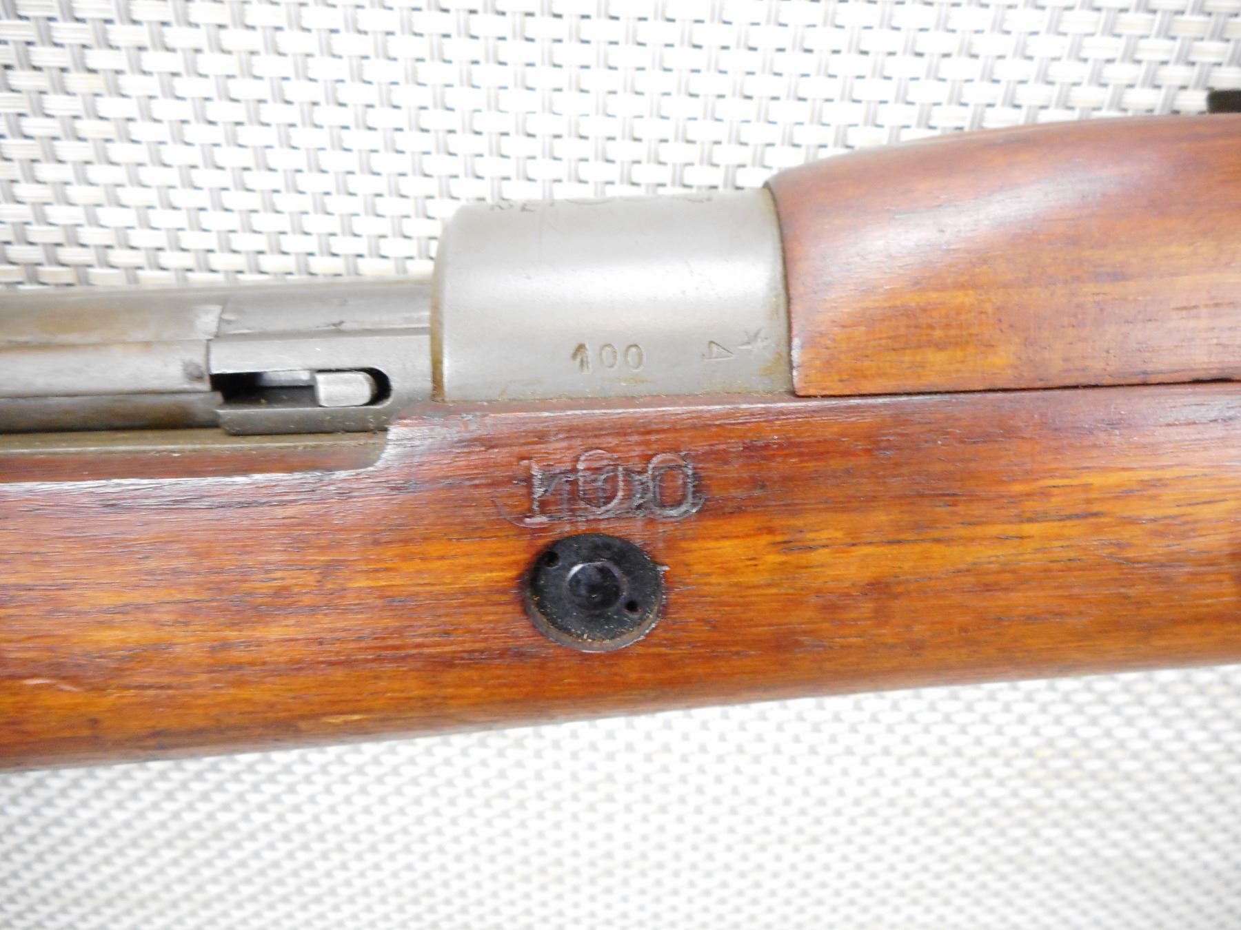 RARE, MAUSER , MODEL: BELGIAN 22 TRAINING RIFLE , CALIBER: 22 LR , BORE IS GOOD, BOLT AND RECEIVER MATCH BY SERIAL #, RETAINS FULL MILITARY CONFIGURATION, BLADE FRONT SIGHT WITH MUZZLE CAP, ADJUSTABLE REAR SIGHT, PEEP APERTURE REAR SIGHT, PARKERIZED FINIHS, SLING SWIVEL LOOPS, STEEL BUTT PLATE, SHOWS SOME HANDLING MARKS , SERIAL # 100 , ACTION: BOLT ACTION SINGLE SHOT RIFLE , BARREL LENGTH: 24" , CONDITION: 7/10 , STOCK # 8786 , CLASS: CANADIAN NON RESTRICTED CLASS