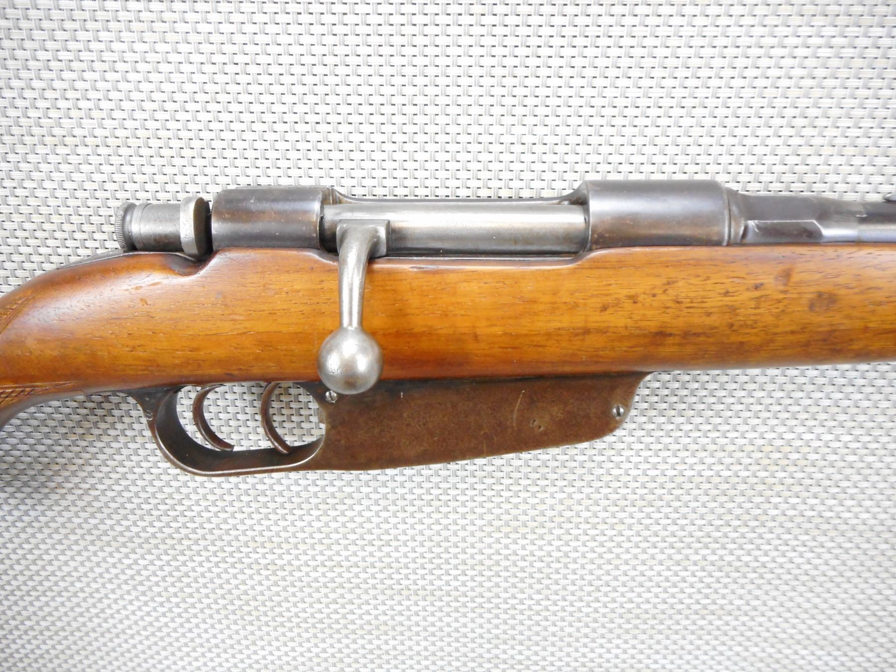 CARCANO , MODEL: 1938 SPORTER , CALIBER: 6.5 X 52 CARCANO , MODEL IS A 1938 CARCANO THAT HAS BEEN SPORTERIZED BY EATONS, WHEN EATONS CONVERTED THESE THEY ADDED A SET TRIGGER, AND A PISTOL GRIP ADDED TO THE STOCK, BORE IS VERY GOOD, SHOWS SOME HANDLING MARKS, LIGHT RUST ON THE RECEIVER AND MAG HOUSING, BLADE FRONT AND FULLY ADJUSTABLE REAR SIGHTS, MISSING THE FRONT SLING SWIVEL , SERIAL # 150840 ON STOCK , ACTION: BOLT ACTION RIFLE , BARREL LENGTH: 21" , CONDITION: 6/10 , STOCK # 8789 , CLASS: CANADIAN NON RESTRICTED CLASS