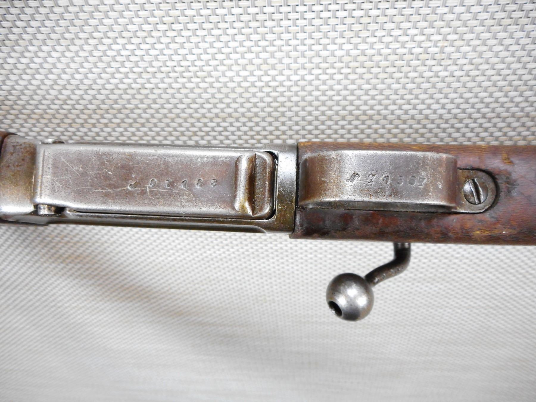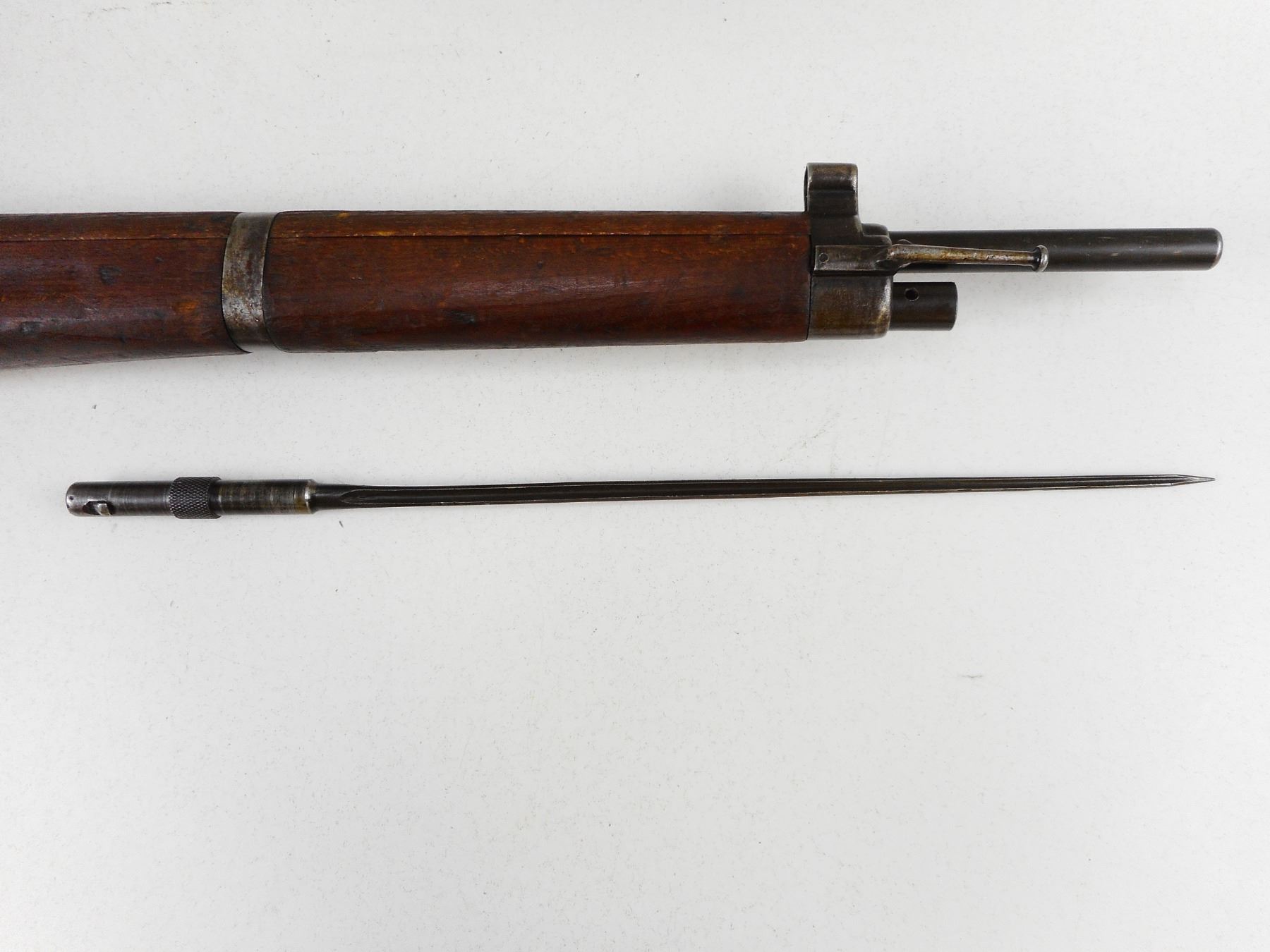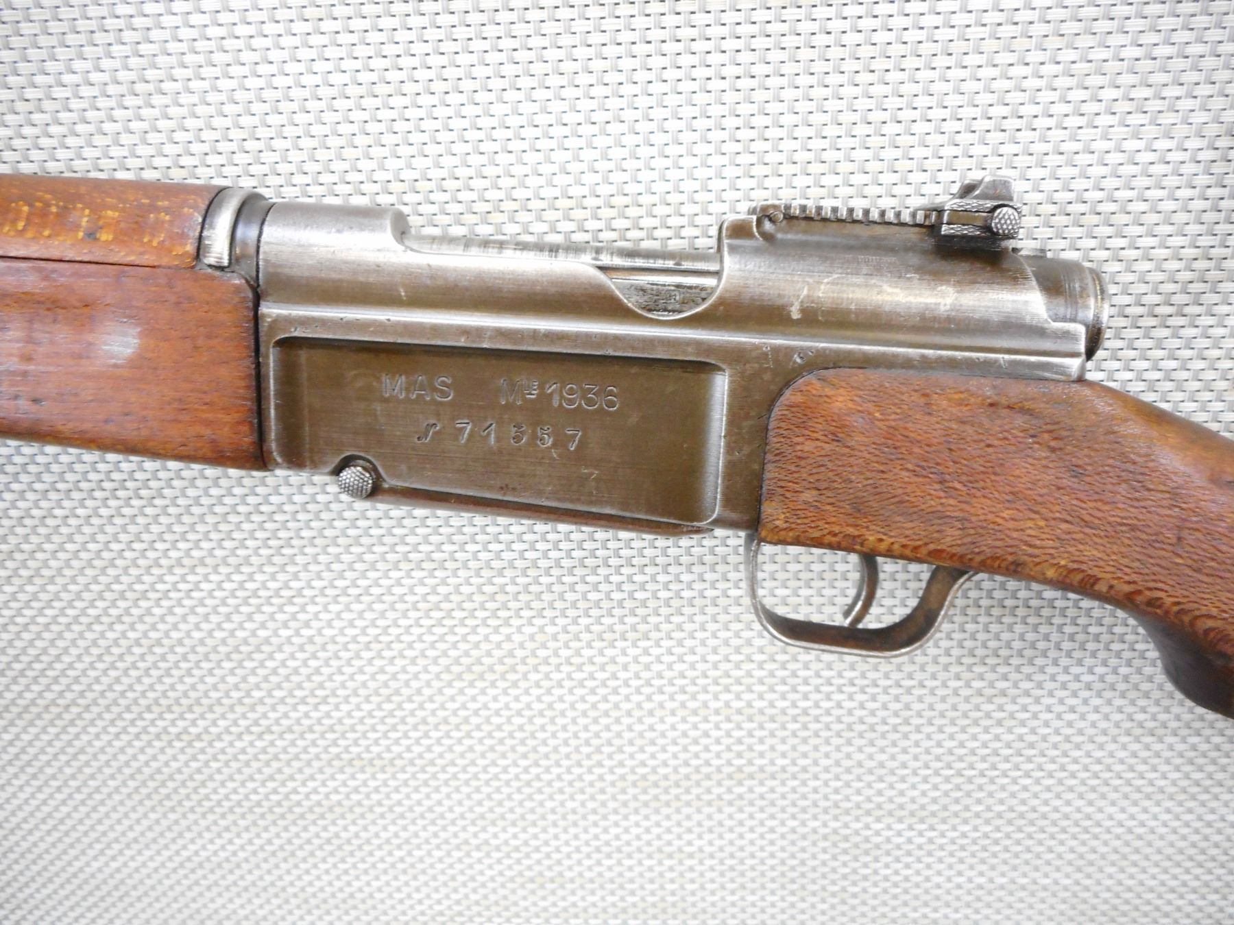 MAS , MODEL: 1936 , CALIBER: 7.5 X 54 FRENCH, EXCELLENT BORE, DETACHABLE FLOOR PLATE, HOODED FRONT AND PEEP REAR SIGHT, RETAINS FULL MILITARY CONFIGURATION, RETAINS ORIGINAL SPIKE BAYONET, SHOWS SOME HANDLING MARKS, ORIGINAL MILITARY SLING SWIVELS, STEEL BUTT PLATE , SERIAL # 71557 , ACTION: BOLT ACTION RIFLE , BARREL LENGTH: 22" , CONDITION: 6/10 , STOCK # 8799 , CLASS: CANADIAN NON RESTRICTED CLASS