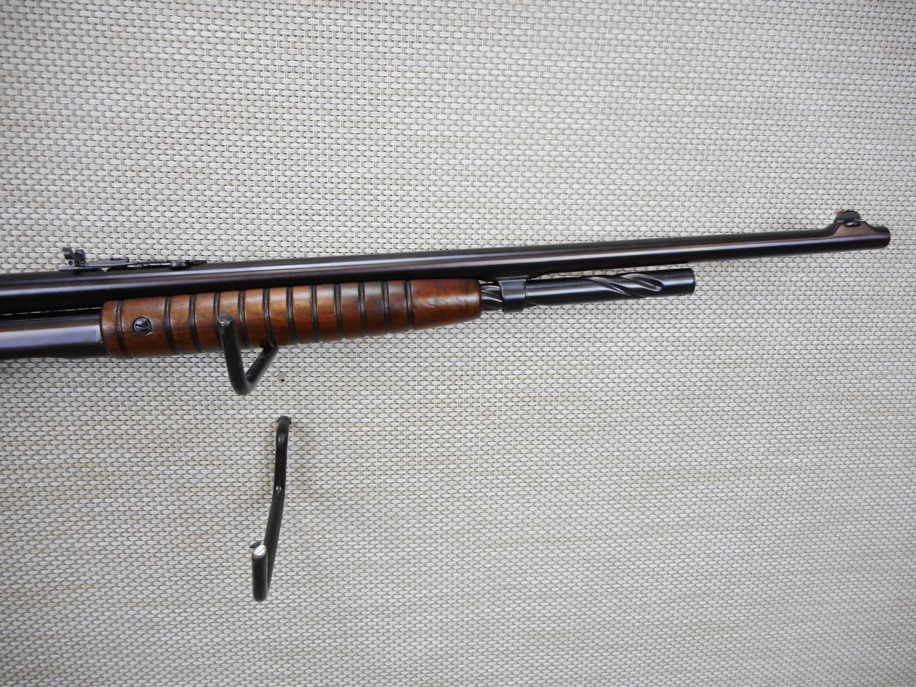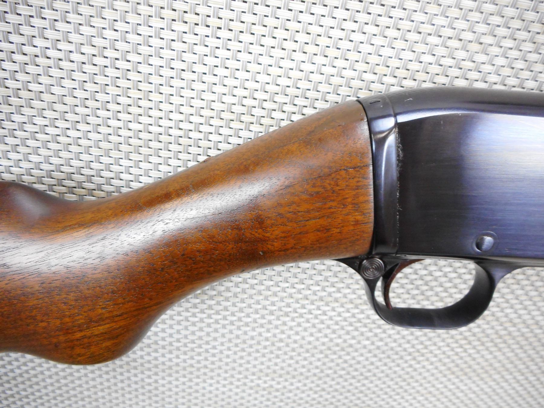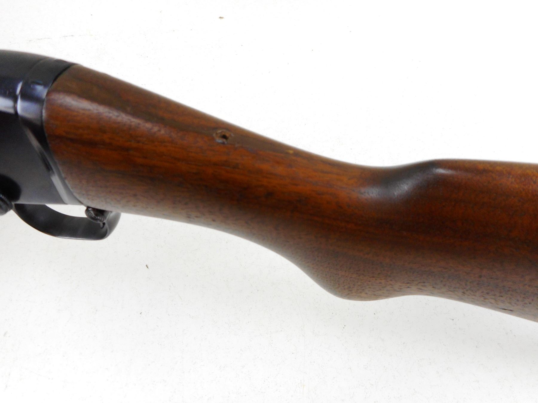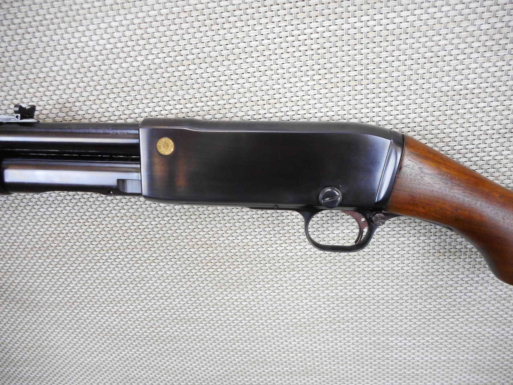 REMINGTON , MODEL: 14 , CALIBER: 30 REM , APPEARS TO HAVE BEEN REBLUED, BORES ARE GOOD, BLADE FRONT AND ADJUSTABLE REAR SIGHT, SHOWS VERY LITTLE HANDLING MARKS, STOCK HAS BEEN REPAIRED AT THE WRIST THERE IS A SMALL HOLE REMAINING, CHIPPED PLASTIC BUTT PLATE, CRACK IN THE BUTT STOCK AT THE TOE , SERIAL # 18023 , ACTION: PUMP ACTION RIFLE , BARREL LENGTH: 22" , CONDITION: 6/10 , STOCK # 8814 , CLASS: CANADIAN NON RESTRICTED CLASS