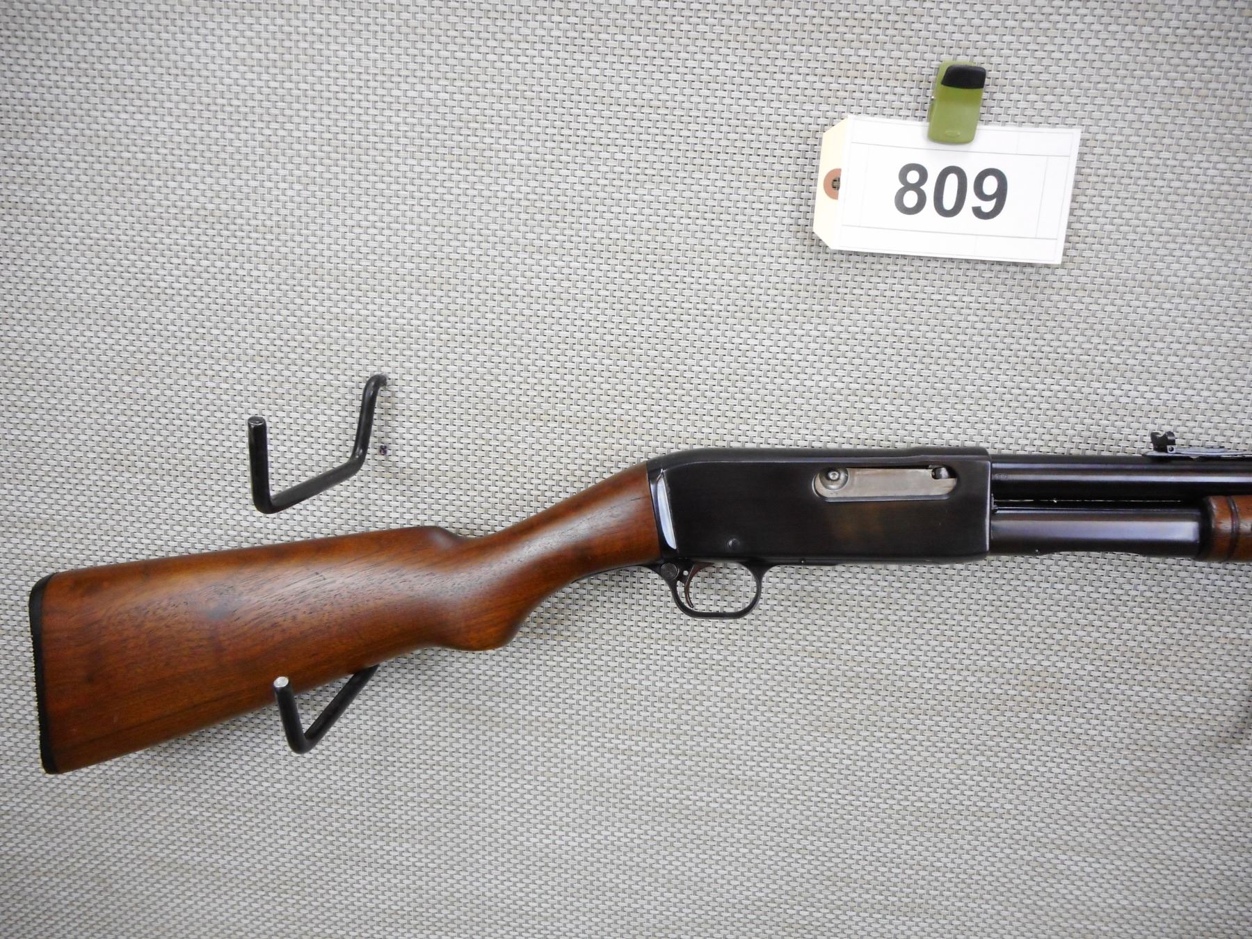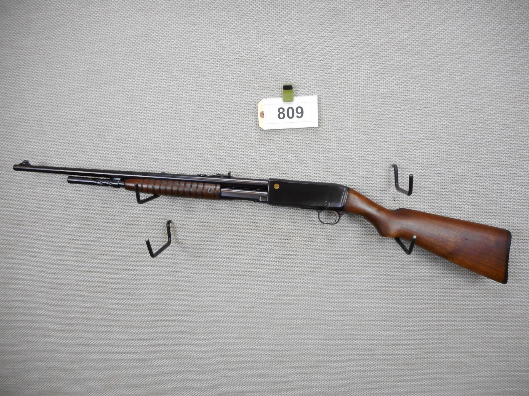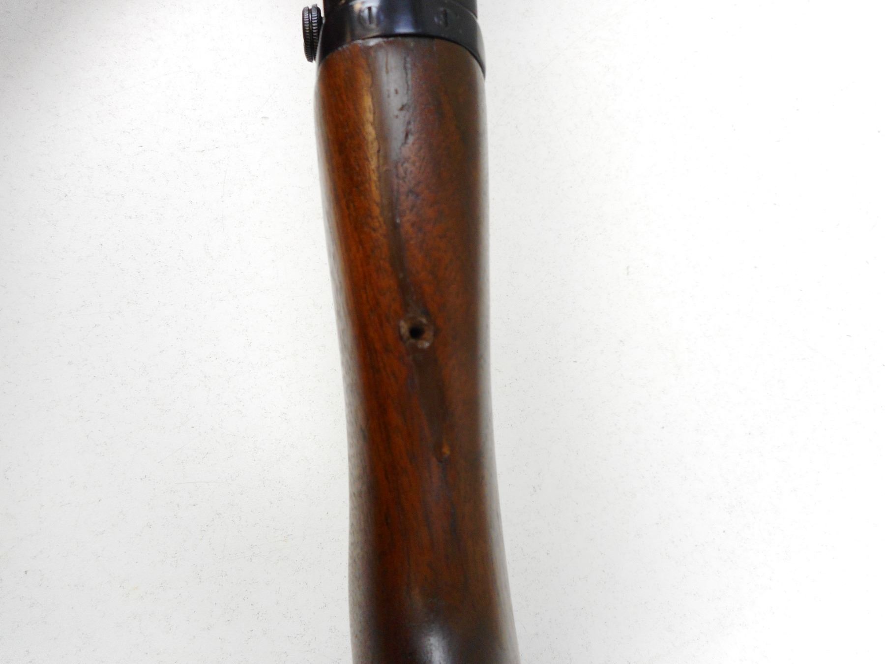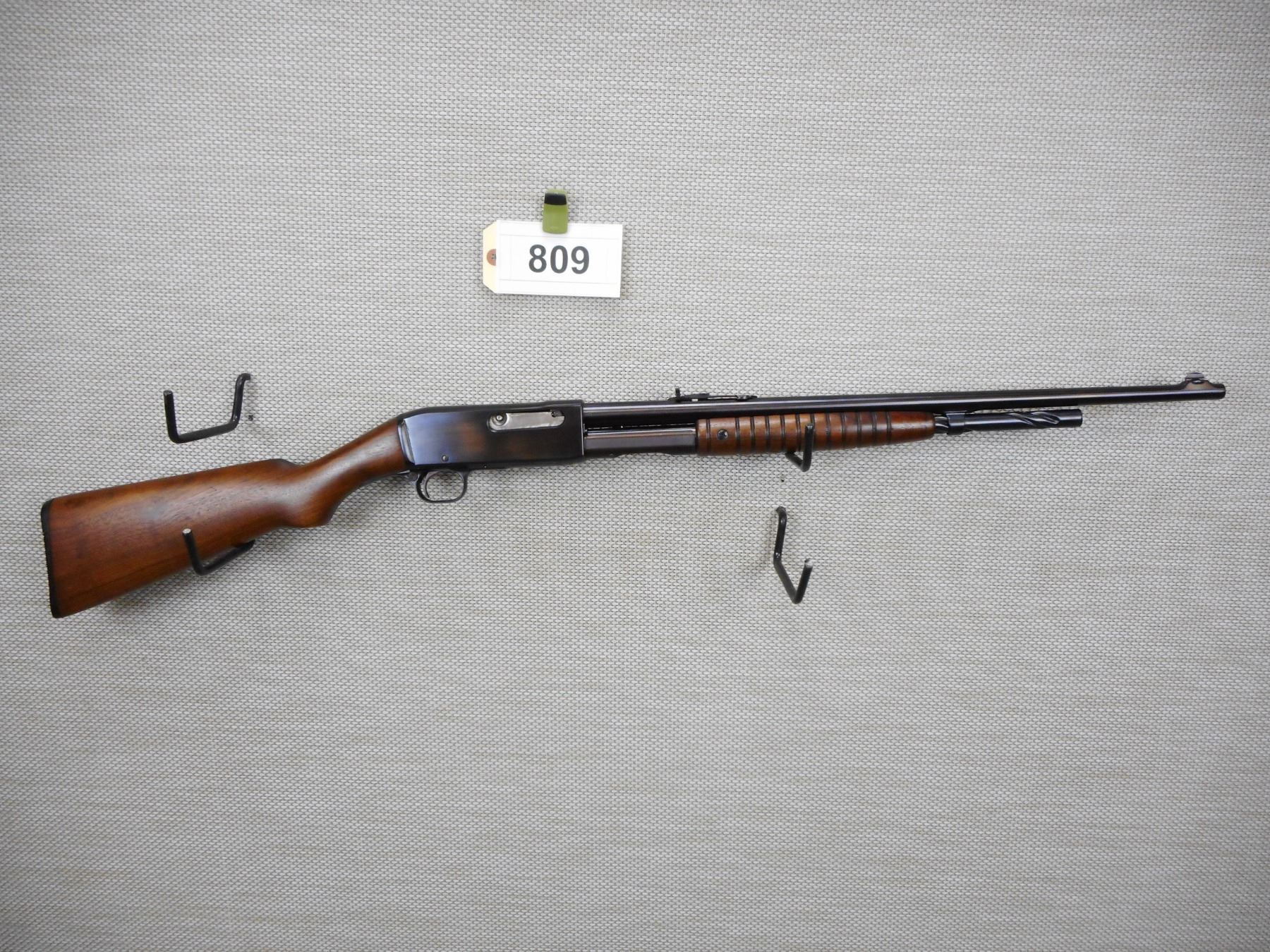 REMINGTON , MODEL: 14 , CALIBER: 30 REM , APPEARS TO HAVE BEEN REBLUED, BORES ARE GOOD, BLADE FRONT AND ADJUSTABLE REAR SIGHT, SHOWS VERY LITTLE HANDLING MARKS, STOCK HAS BEEN REPAIRED AT THE WRIST THERE IS A SMALL HOLE REMAINING, CHIPPED PLASTIC BUTT PLATE, CRACK IN THE BUTT STOCK AT THE TOE , SERIAL # 18023 , ACTION: PUMP ACTION RIFLE , BARREL LENGTH: 22" , CONDITION: 6/10 , STOCK # 8814 , CLASS: CANADIAN NON RESTRICTED CLASS