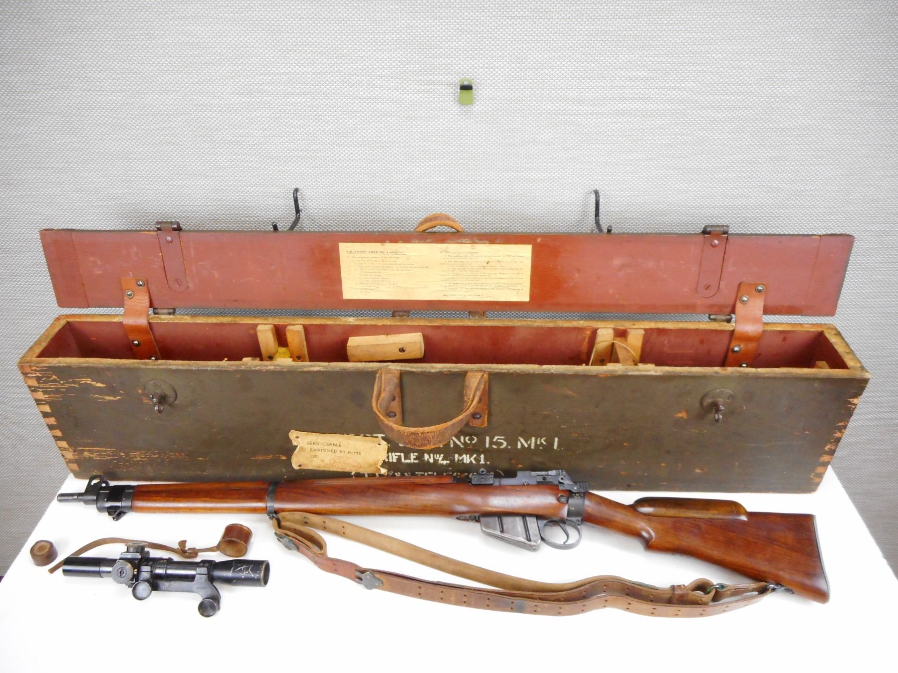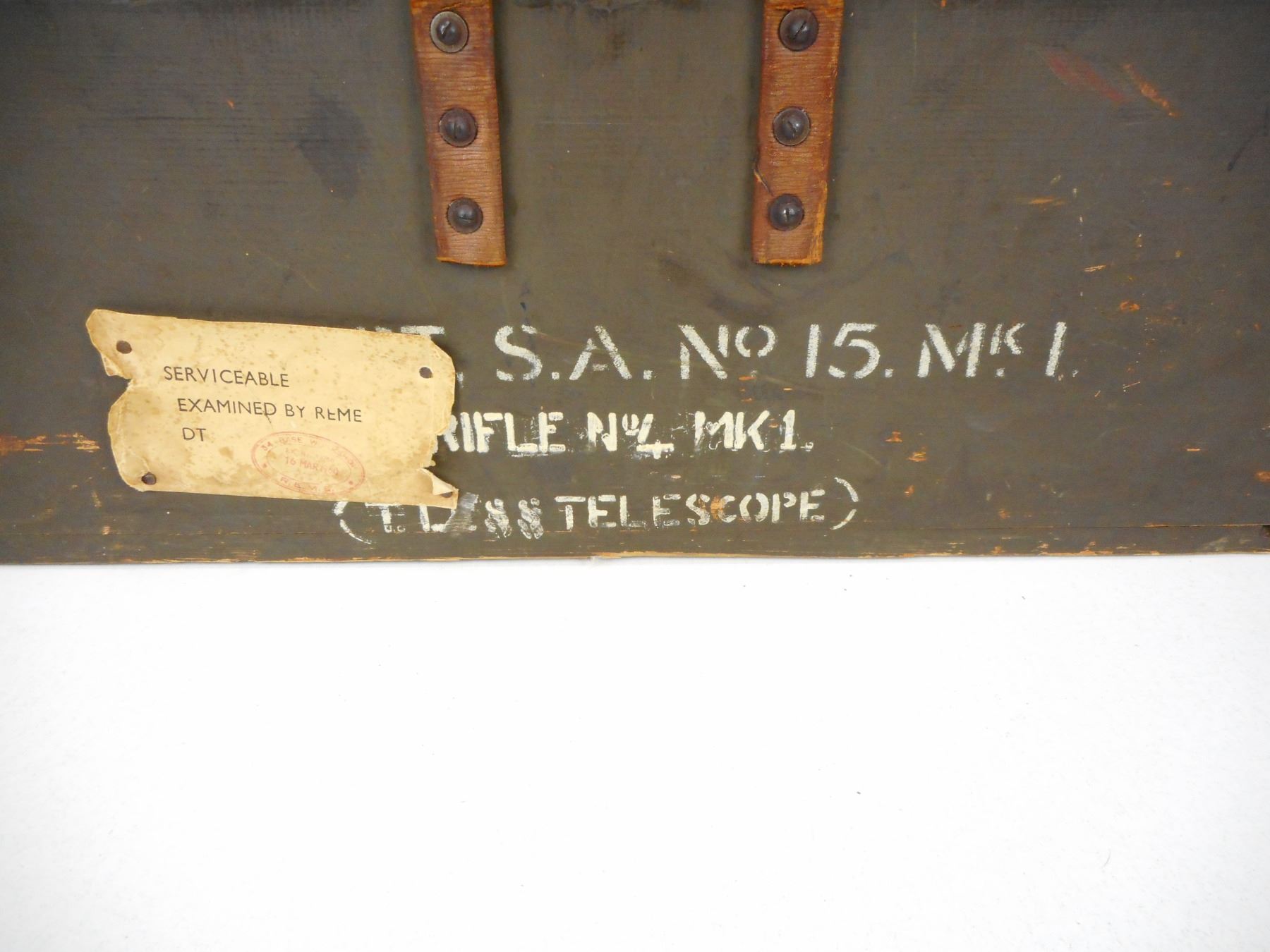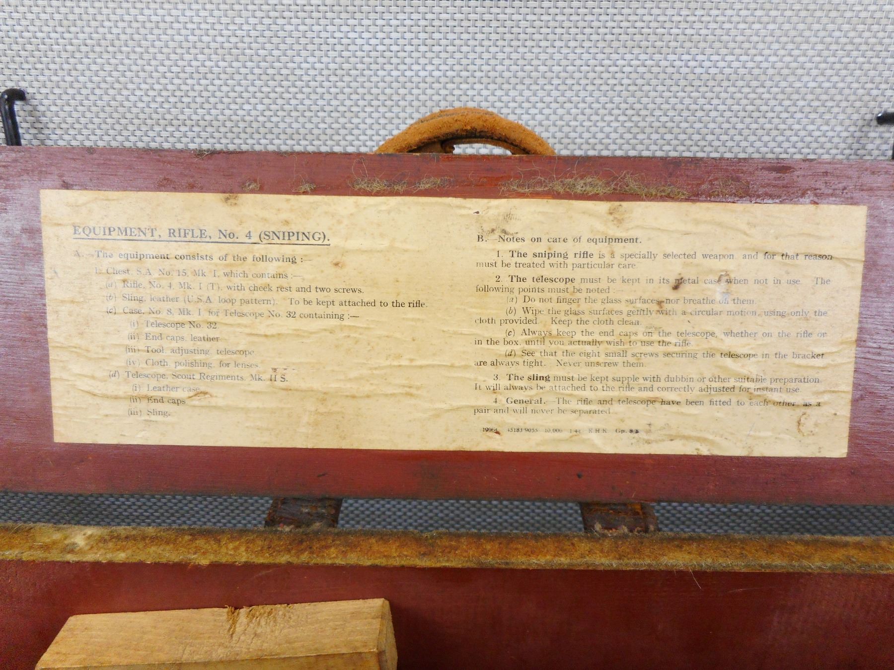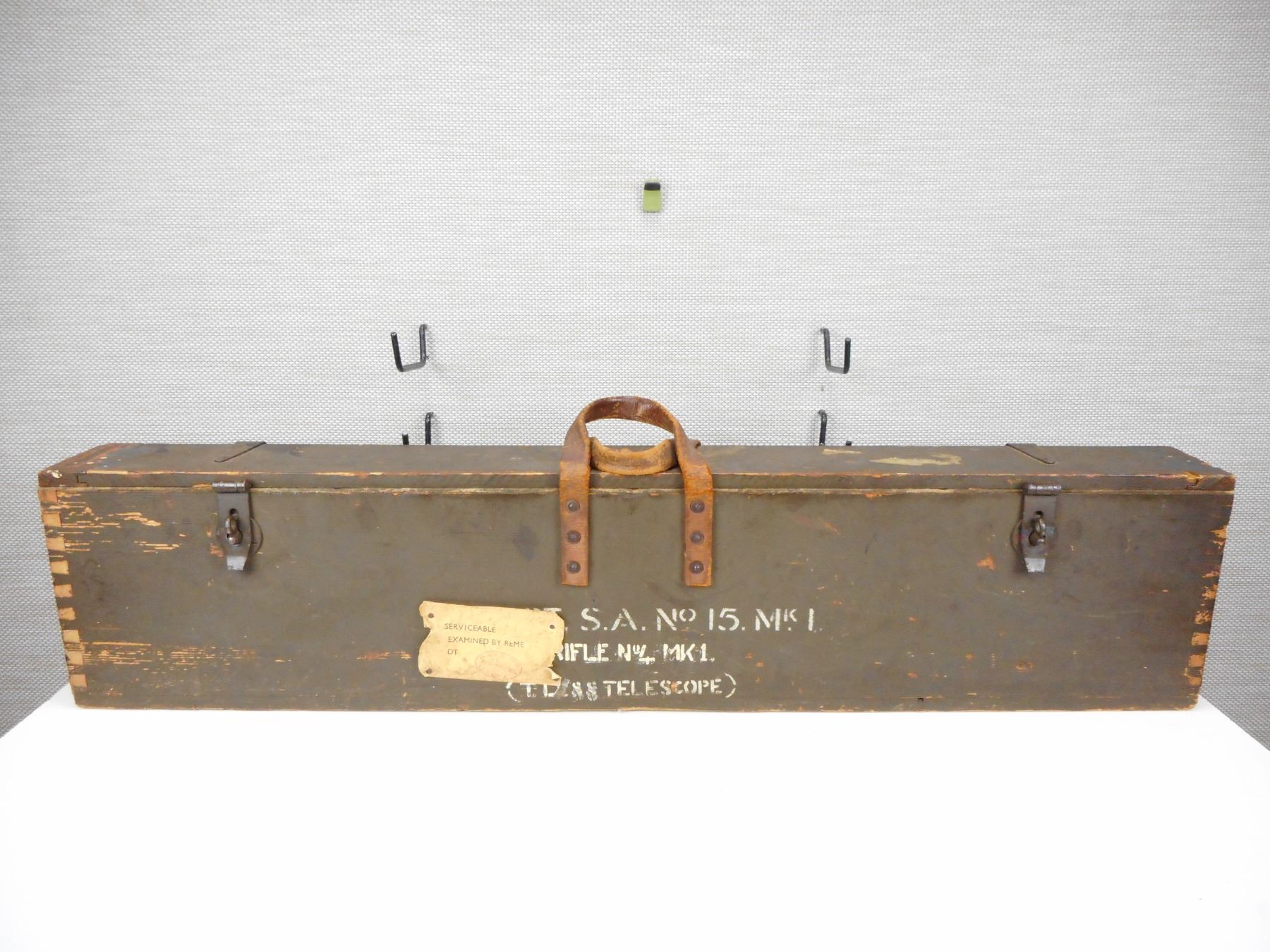 RARE, WWII ERA, LEE ENFIELD , MODEL: NO 4 MKI T SNIPER , CALIBER: 303 BR , COMES WITH WOODEN TRANSIT CHEST, AND SAVAGE MARK MAGAZINE, MATCHING BOLT AND RECEIVER BY SERIAL #, DATED 1944 WWII ERA, STOCK NUMBERED TO RIFLE, BSA SHIRLEY IS THE MANUFACTURER, HAS A NO 32 MK3 SCOPE WITH LEATHER COVER, VERY GOOD BORE, RECEIVER HAS T4 STAMP, STEEL BUTT PLATE, BARLEY CORN FRONT AND PEEP APERTURE REAR SIGHT, SHOWS VERY LITTLE HANDLING MARKS , SERIAL # H38837 , ACTION: BOLT ACTION RIFLE , BARREL LENGTH: 26" , CONDITION: 8/10 , STOCK # 8820 , CLASS: CANADIAN NON RESTRICTED CLASS