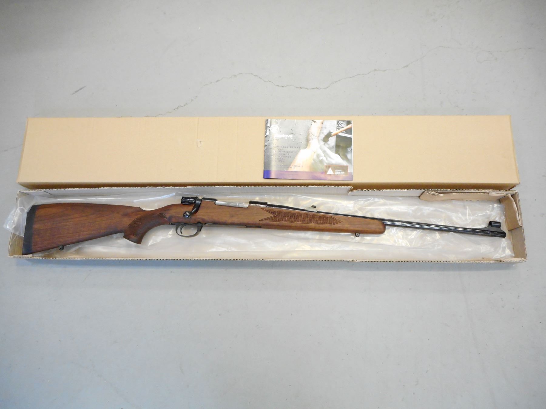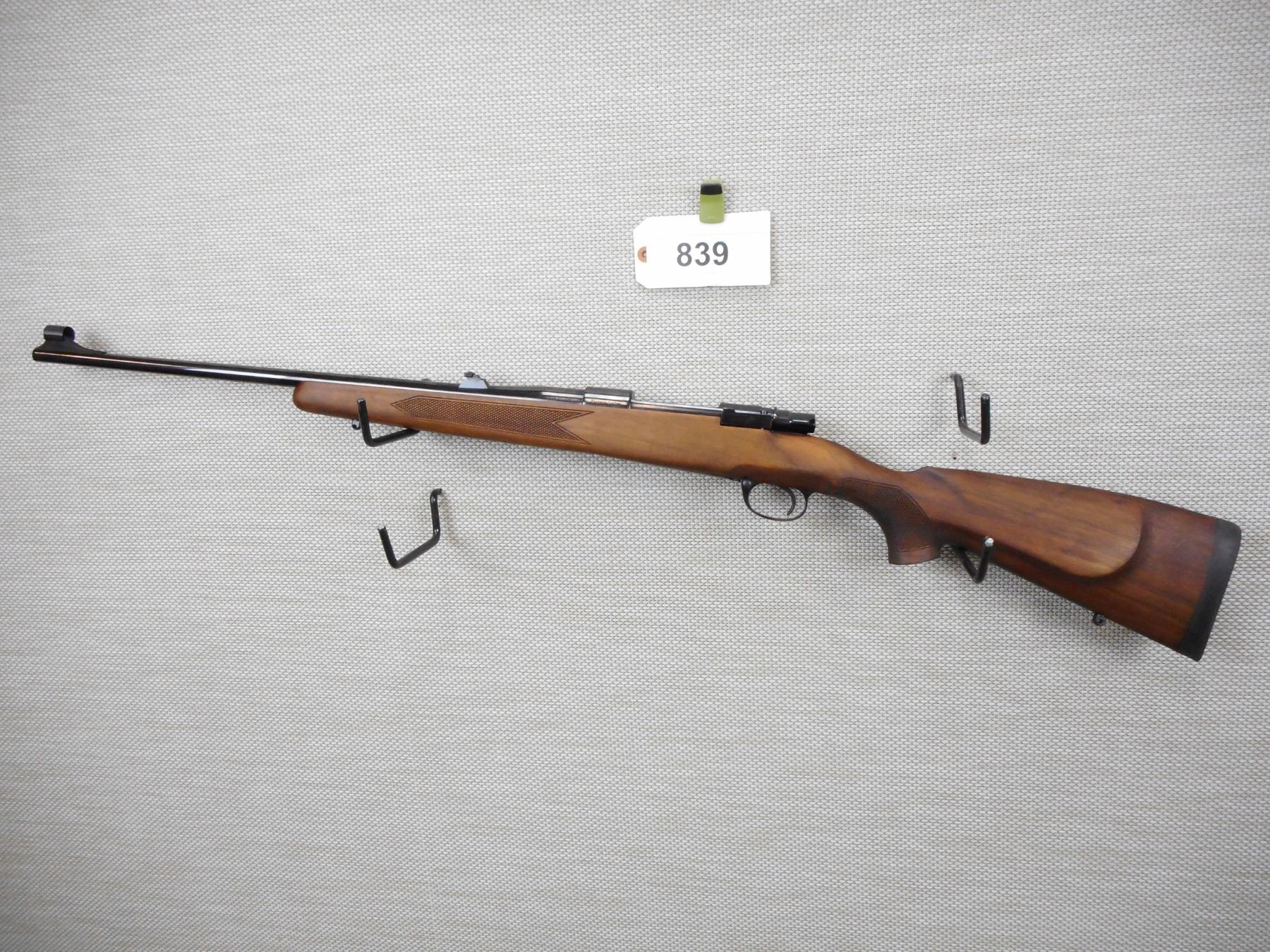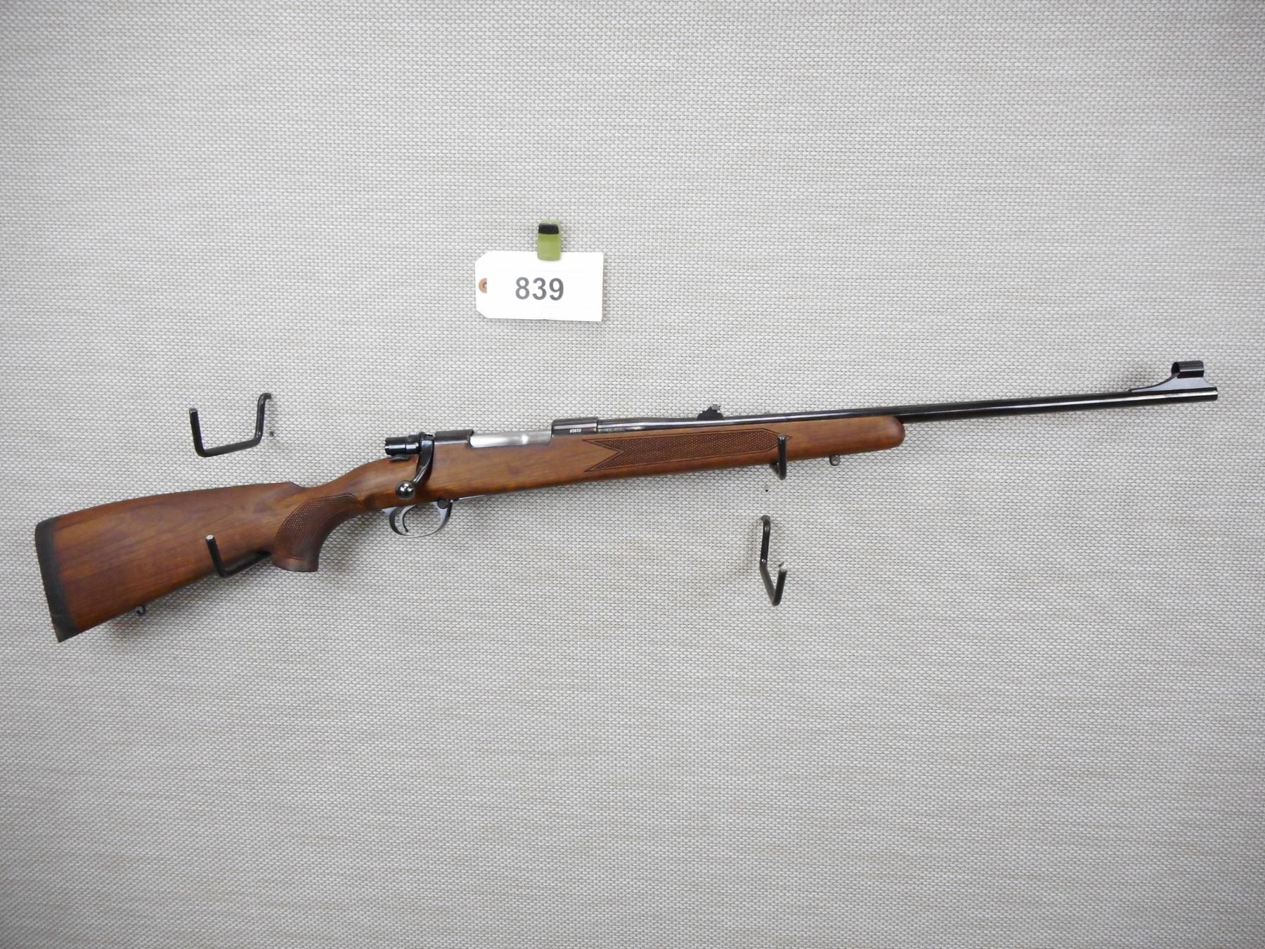 ZASTAVA , MODEL: M70 , CALIBER: 6.5 X 55 SWEDISH MAUSER , COMES WITH BOX, BORE IS EXCELLENT, HOODED FRONT AND FLIP ADJUSTABLE REAR SIGHTS, CHECKERED FOREND AND FULL PISTOL GRIP WITH RAISED CHEEK PIECE A RUBBER COIL PAD, DRILL AND TAPPED FOR SCOPE MOUNTS, SLING LOOPS, SHOWS VERY LITTLE HANDLING MARKS , SERIAL # 85833 , ACTION: BOLT ACTION RIFLE , BARREL LENGTH: 23" , CONDITION: 9+/10 , STOCK # 8844 , CLASS: CANADIAN NON RESTRICTED CLASS