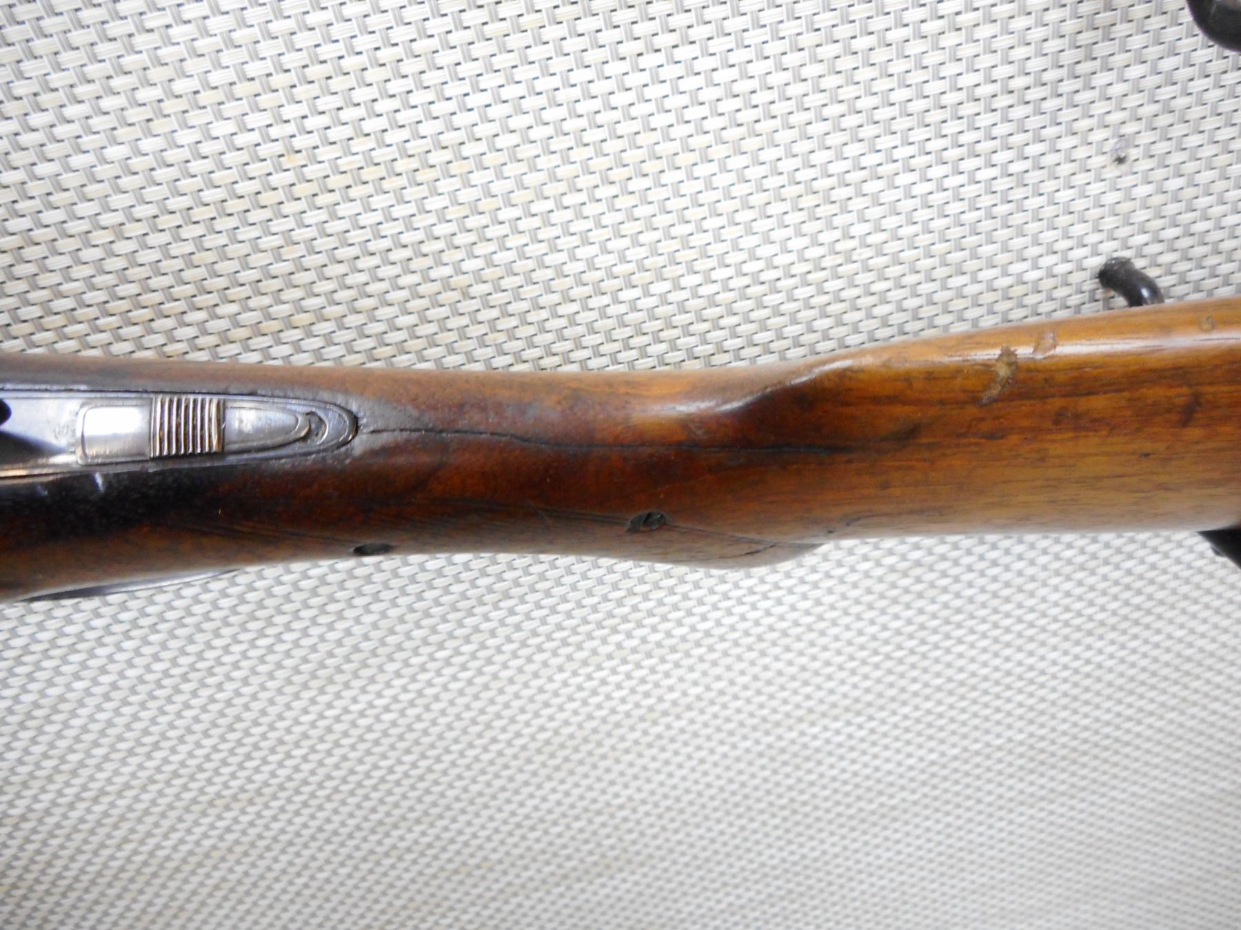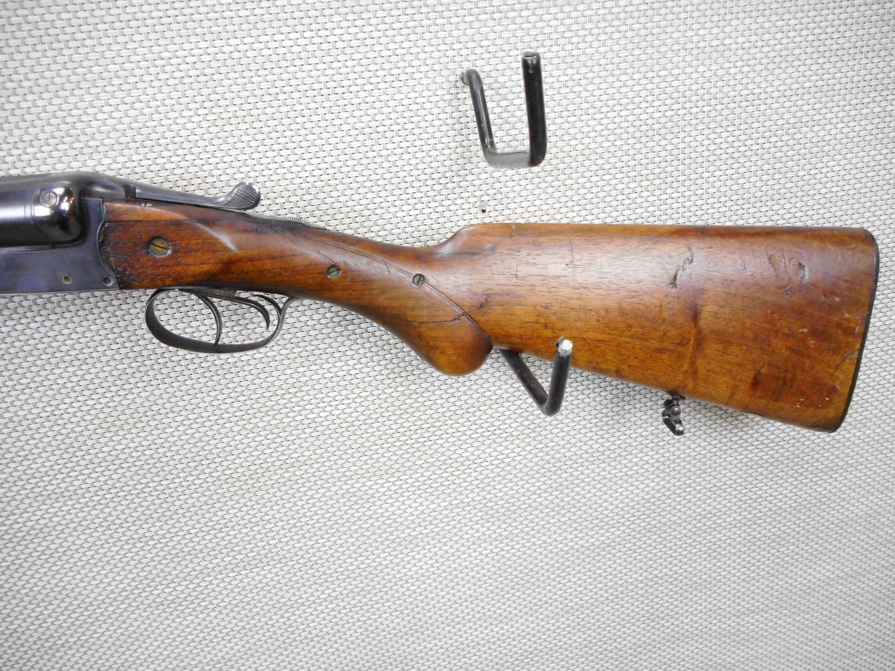 GECO , MODEL: SIDE BY SIDE , CALIBER: 12GA X 2 3/4" , BORES ARE EXCELLENT, FIXED FULL AND MODIFIED CHOKES, BEAD FRONT SIGHT IS FLATENED, CHECKERED FOREND AND SEMI PISTOL GRIP BUTT STOCK WHICH IS CRACKED AND REPAIRED AT THE WRIST, SLING SWIVEL LOOPS, SHOWS EXTENSIVE HANDLING MARKS, CHIPPED PLASTIC BUTT PLATE , SERIAL # 29615 , ACTION: SIDE BY SIDE SHOTGUN , BARREL LENGTH: 27 1/2" , CONDITION: 5/10 , STOCK # 8853 , CLASS: CANADIAN NON RESTRICTED CLASS