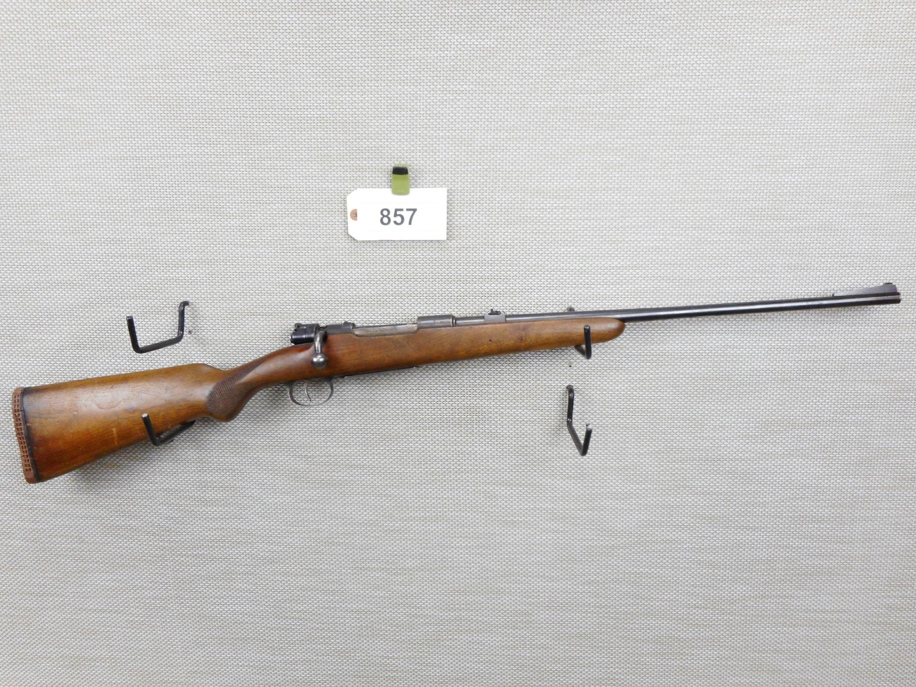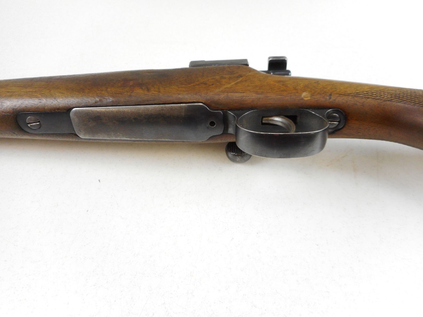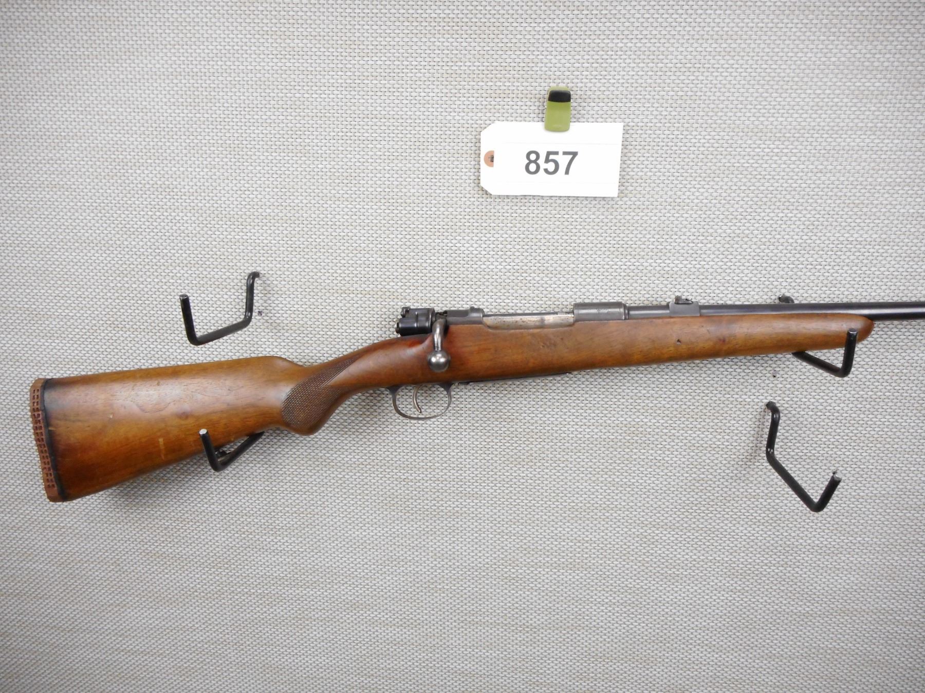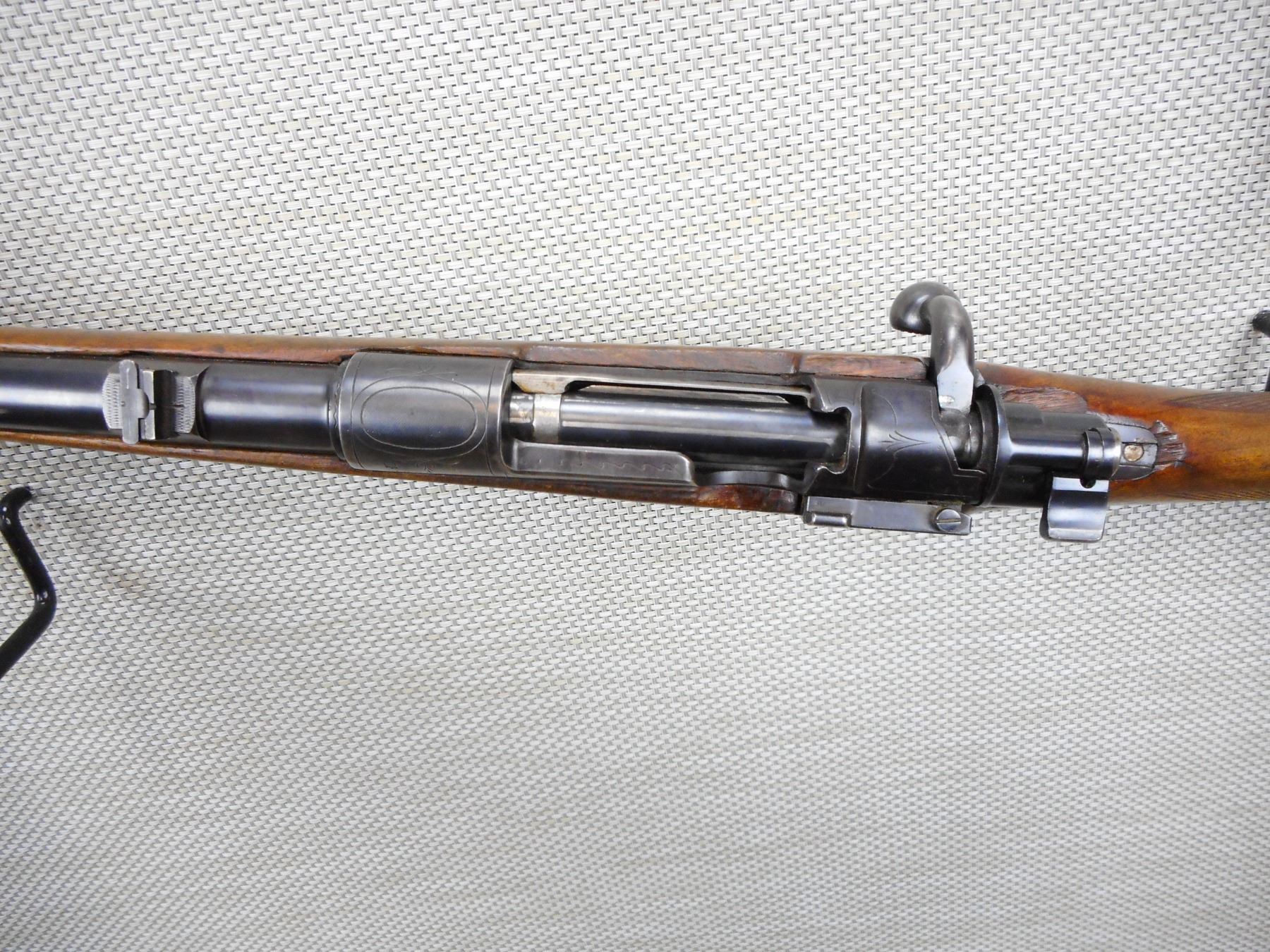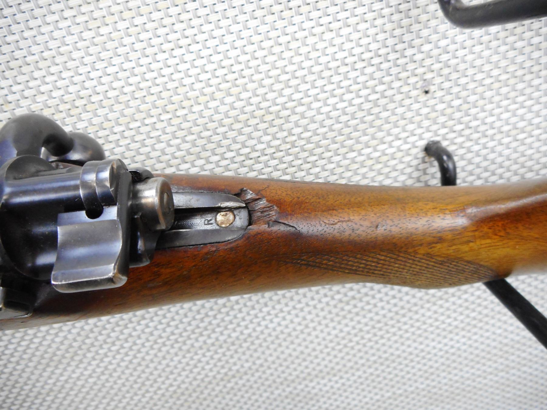 MAUSER , MODEL: GECO M98 SPORTER , CALIBER: 8 X 57 , BORE IS VERY GOOD, CHECKERED SEMI PISTOL GRIP BUTT STOCK WITH VENTED RUBBER RECOIL PAD, MISSING THE FRONT SLING SWIVEL, SHOWS EXTENSIVE HANDLING MARKS, RAMP FRONT AND FLIP ADJUSTABLE REAR SIGHT, STOCK IS CHIPPED AT THE WRIST , SERIAL # 3806 , ACTION: BOLT ACTION RIFLE , BARREL LENGTH: 22" , CONDITION: 5/10 , STOCK # 8862 , CLASS: CANADIAN NON RESTRICTED CLASS