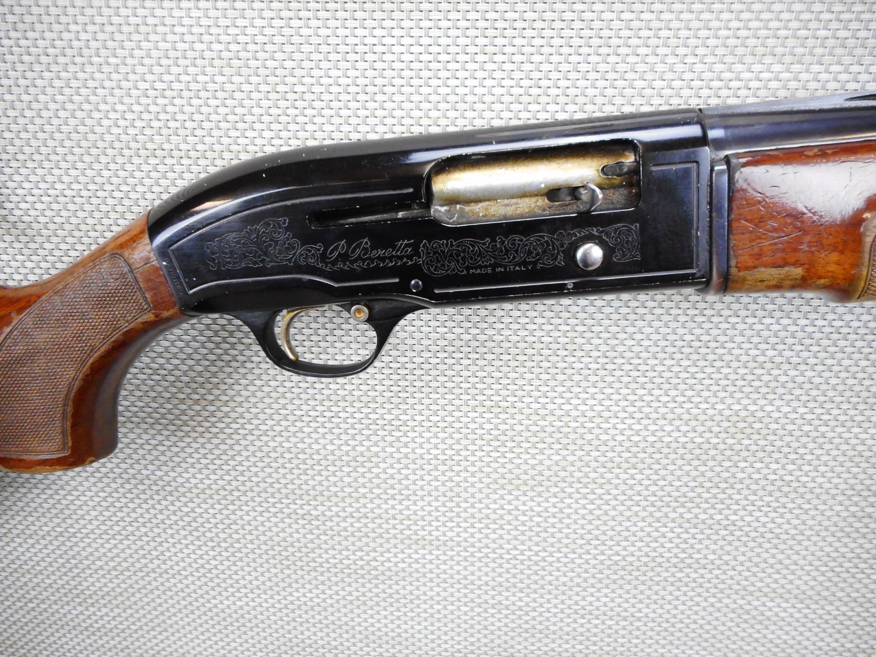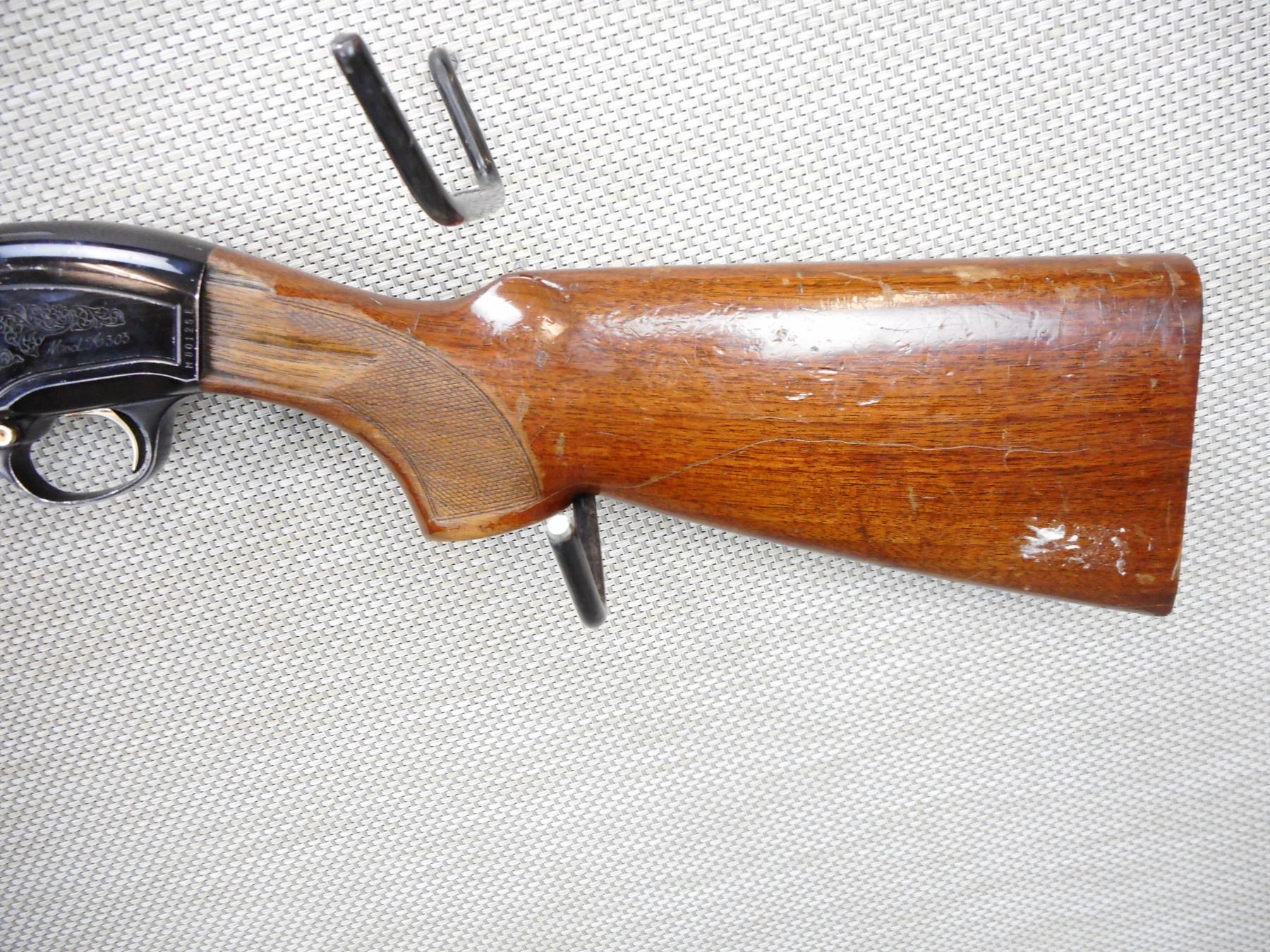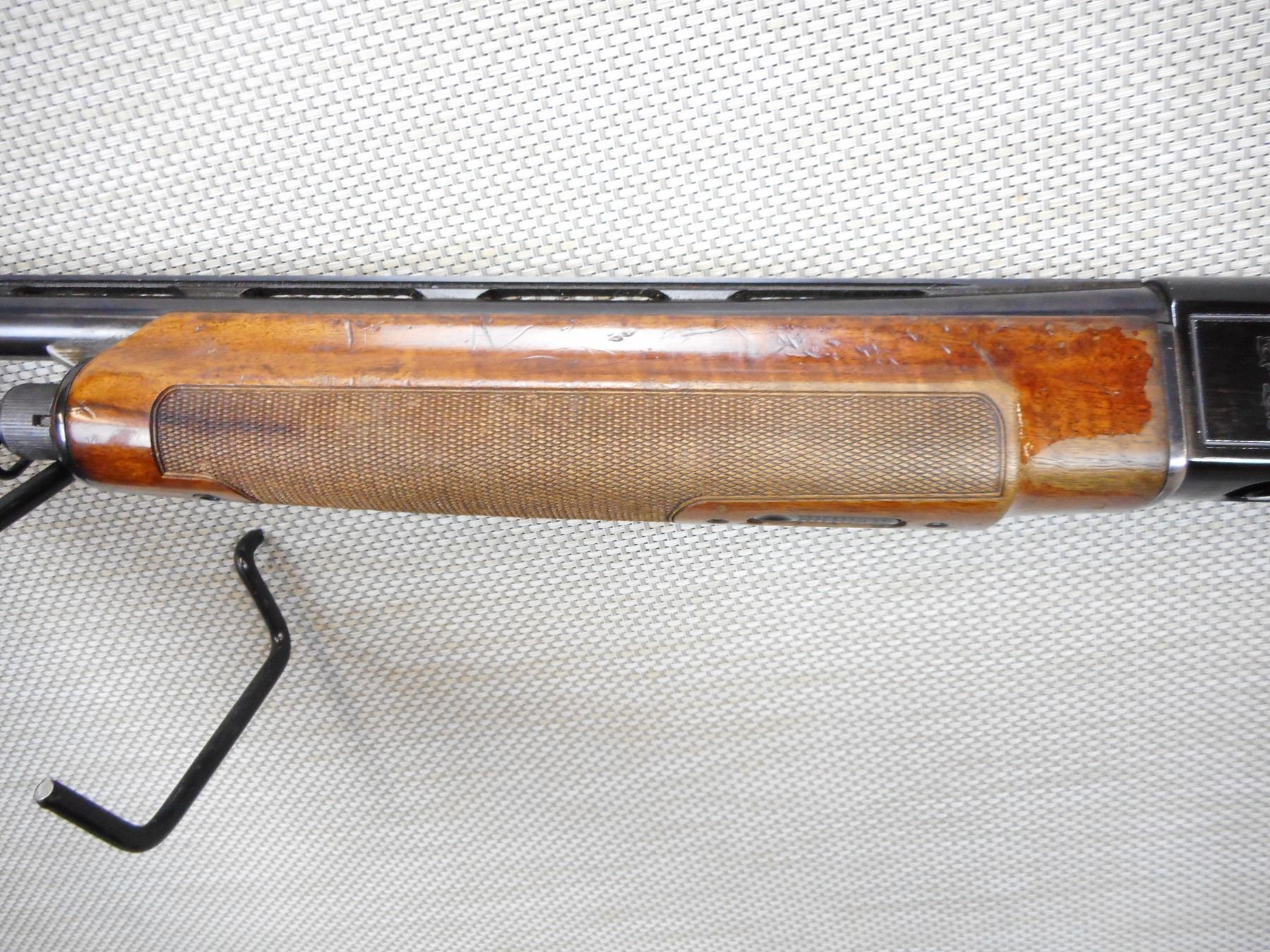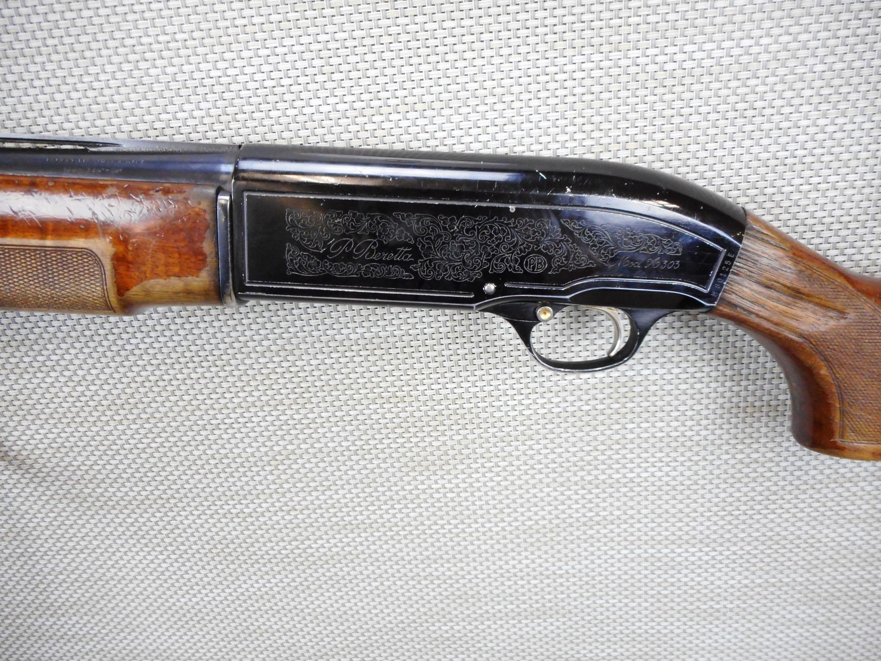 BERETTA , MODEL: A303 , CALIBER: 12GA X 2 3/4" , FIXED FULL CHOKE, BORE IS VERY GOOD, CHECKERED FOREND AND SEMI PISTOL GRIP BUTT STOCK, LIGHTLY ENGRAVED RECEIVER, SHOWS EXTENSIVE HANDLING MARKS, MISSING THE BUTT PLATE, LARGE CHIP AT THE WRIST, BEAD FRONT SIGHT ON A VENTED RIB BARREL , SERIAL # M80125E , ACTION: SEMI AUTOMATIC SHOTGUN , BARREL LENGTH: 28" , CONDITION: 4/10 , STOCK # 8869 , CLASS: CANADIAN NON RESTRICTED CLASS