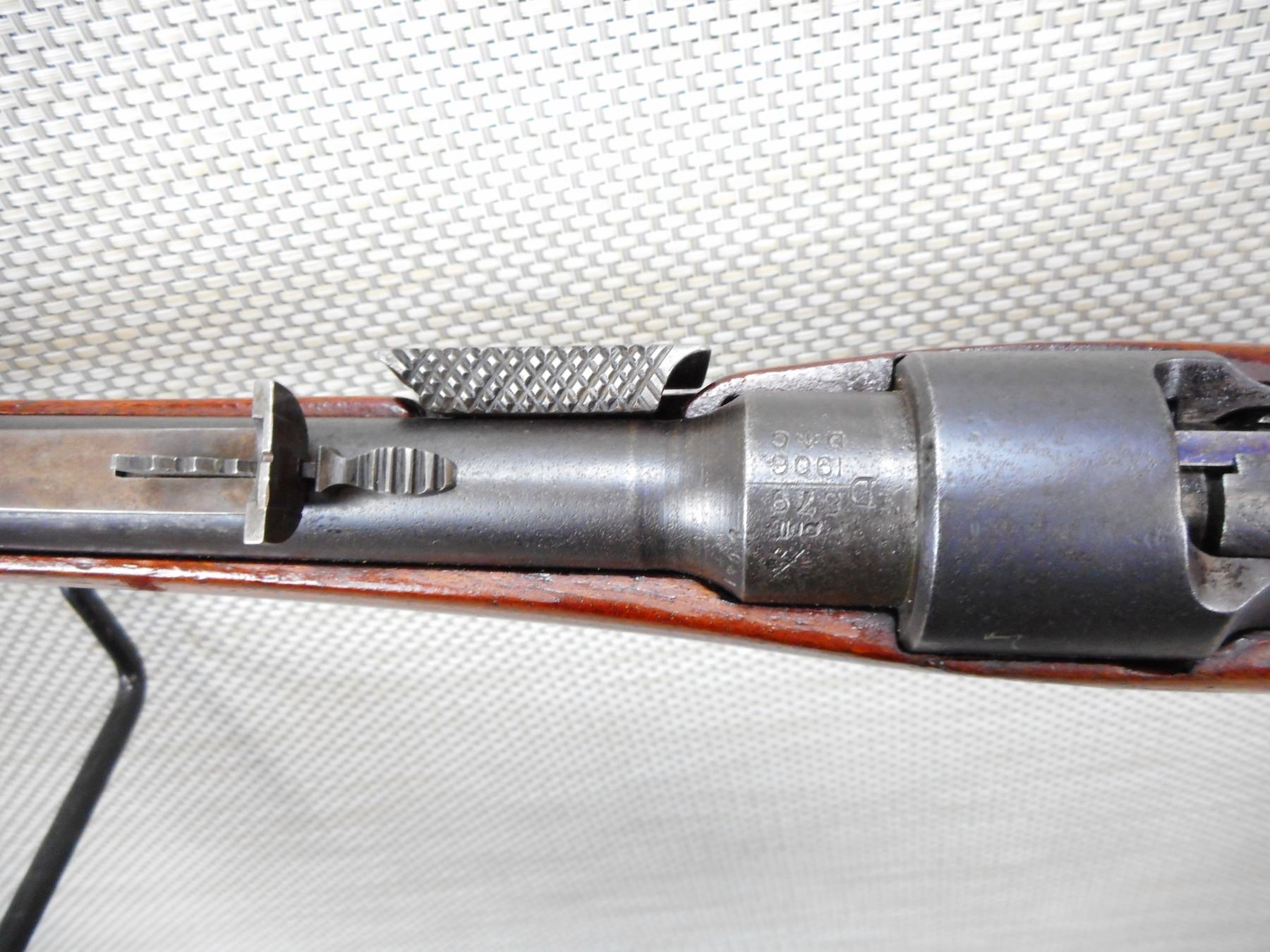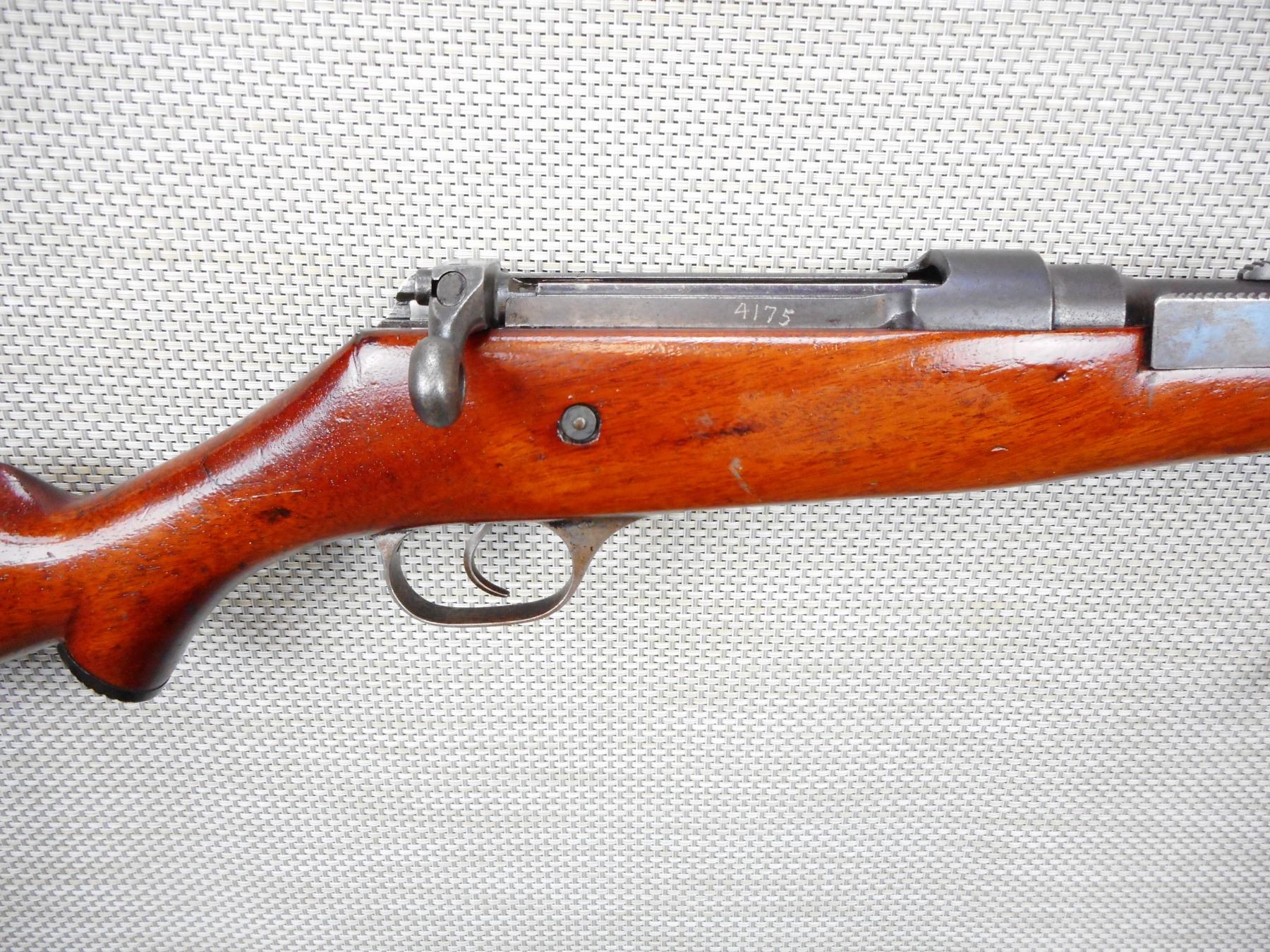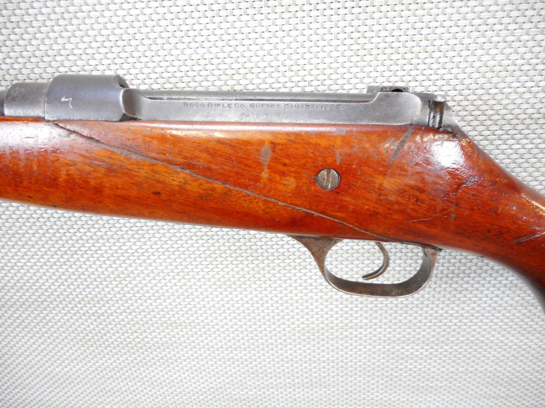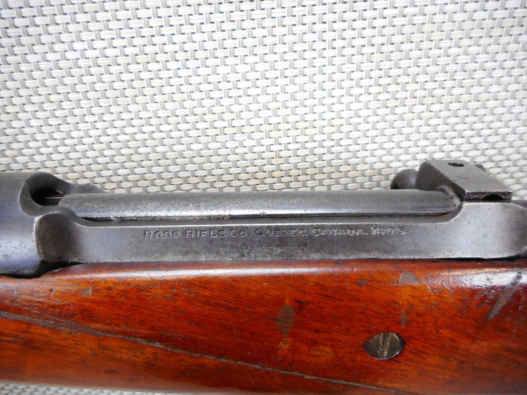 ROSS , MODEL: M1905 SPORTER , CALIBER: 303 BR , VERY GOOD BORE, SLING SWIVEL LOOPS, RAMP FRONT AND ADJUSTABLE REAR SIGHTS, STOCK HAS A LARGE CRACK DIAGONALLY ACROSS THE FOREND , SHOWS SOME HANDLING MARKS, CAPPED PISTOL GRIP BUTT STOCK WITH PLASTIC BUTT PLATE , SERIAL # 4175 , ACTION: BOLT ACTION RIFLE , BARREL LENGTH: 22" , CONDITION: 4/10 , STOCK # 8902 , CLASS: CANADIAN NON RESTRICTED CLASS