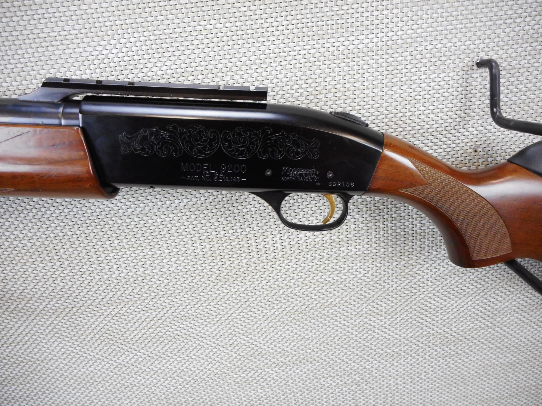 MOSSBERG , MODEL: 9200 , CALIBER: 12GA X 3" , BORE IS EXCELLENT AND RIFLED, CYLINDER BORE, NO SIGHTS BUT EQUIPPED WITH A SCOPE RAIL, CHECKERED FOREND AND SEMI PISTOL GRIP WITH ATTACHED CHEEK PIECE, VENTED RUBBER RECOIL PAD, SHOWS SOME HANDLING MARKS, SLING SWIVEL STUDS , SERIAL # 302106 , ACTION: SEMI AUTOMATIC SHOTGUN , BARREL LENGTH: 24" , CONDITION: 7/10 , STOCK # 8967 , CLASS: CANADIAN NON RESTRICTED CLASS