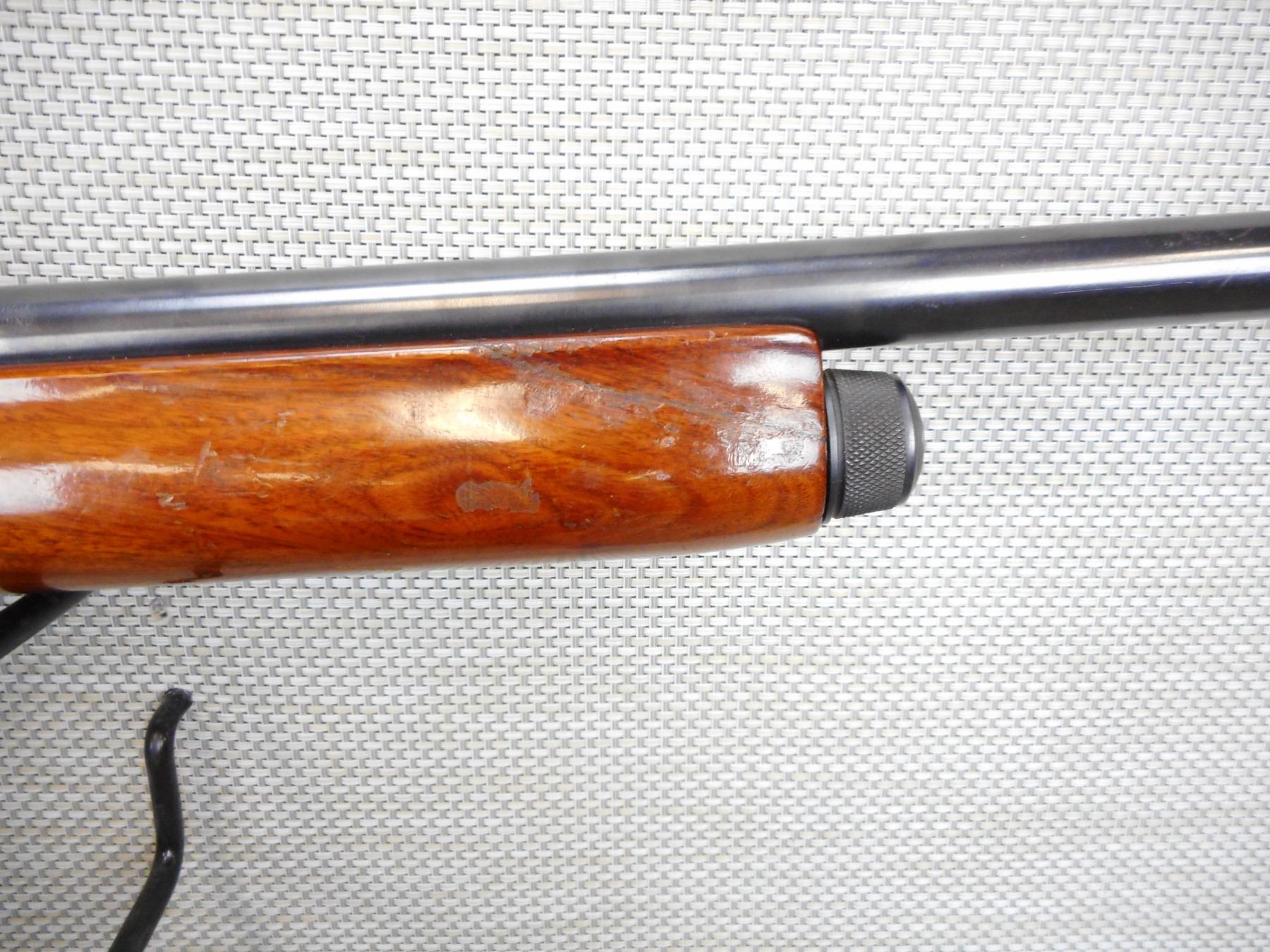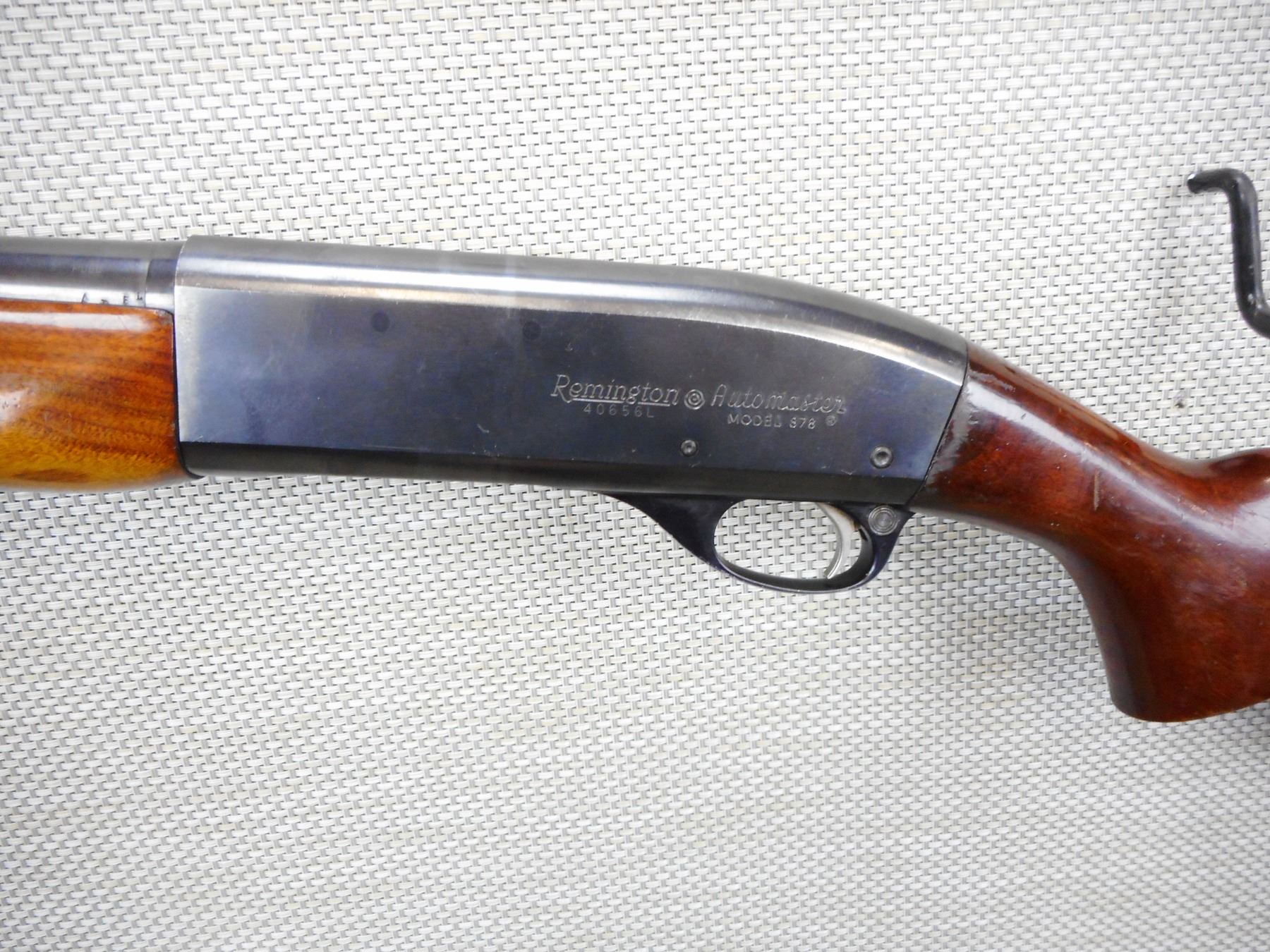 REMINGTON , MODEL: 878 AUTOMASTER , CALIBER: 12GA X 2 3/4" , BORE IS VERY, FIXED FULL CHOKE, BEAD FRONT SIGHT, TWO PIECE HARDWOOD STOCK WITH PLASTIC BUTT PLATE, FOREND HAS BEEN REPAIRED, SHOWS EXTENSIVE HANDLING MARKS, PLASTIC BUTT PLATE , SERIAL # 40656L , ACTION: SEMI AUTOMATIC SHOTGUN , BARREL LENGTH: 30" , CONDITION: 6/10 , STOCK # 8981 , CLASS: CANADIAN NON RESTRICTED CLASS