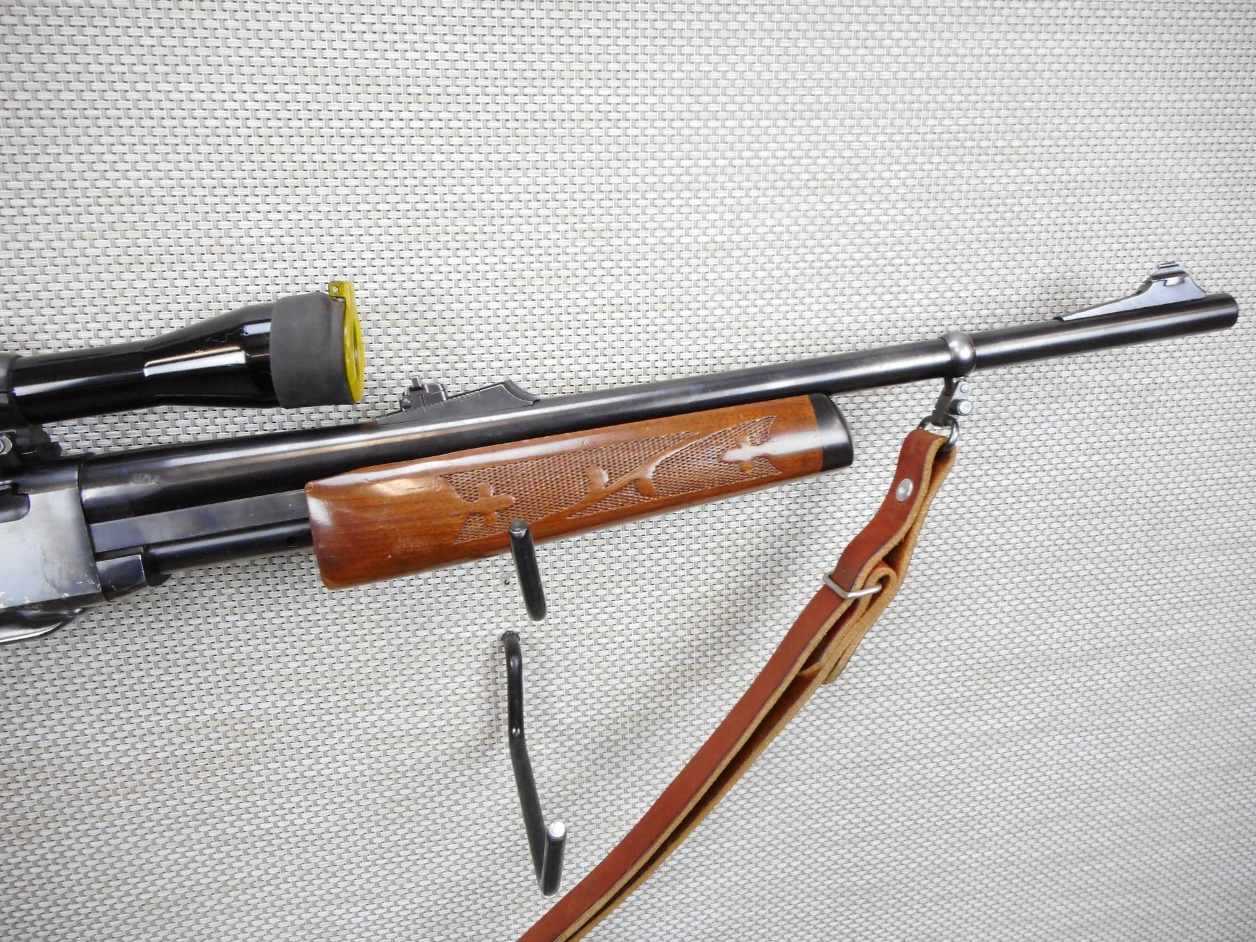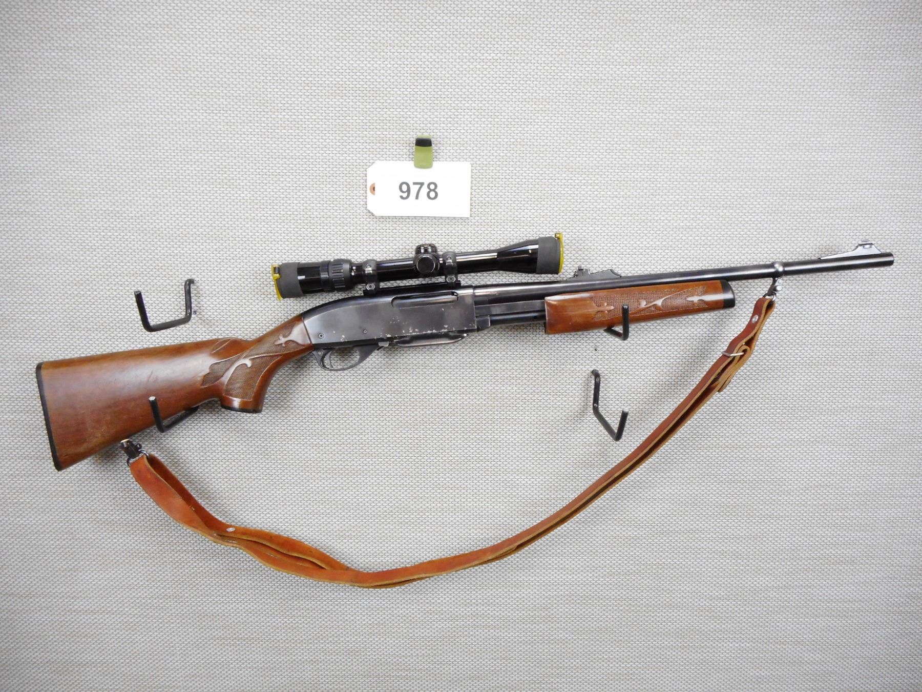 REMINGTON , MODEL: 7600 CARBINE , CALIBER: 30-06 SPRG , COMES WITH MAGAZINE, BORE IS VERY GOOD, RAMP FRONT AND ADJUSTABLE REAR SIGHT, FEATURES A BAUSH LOMB ELITE 3000 1.5 -4.5 SCOPE , CHECKERED FOREND AND CAPPED PISTOL GRIP BUTT STOCK, PLASTIC BUTT PLATE, SLING SWIVELS WITH LEATHER SLING, SHO9WS SOME HANDLING MARKS , SERIAL # 8559909 , ACTION: PUMP ACTION RIFLE , BARREL LENGTH: 19" , CONDITION: 7/10 , STOCK # 8983 , CLASS: CANADIAN NON RESTRICTED CLASS