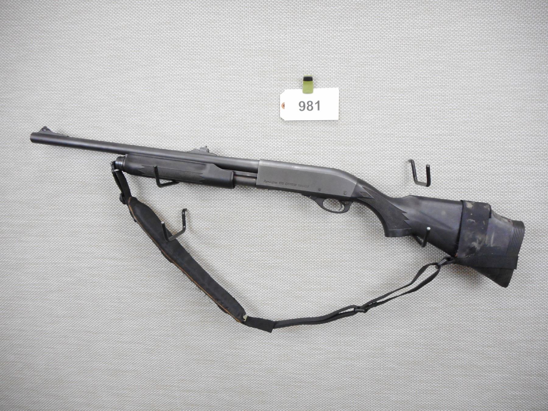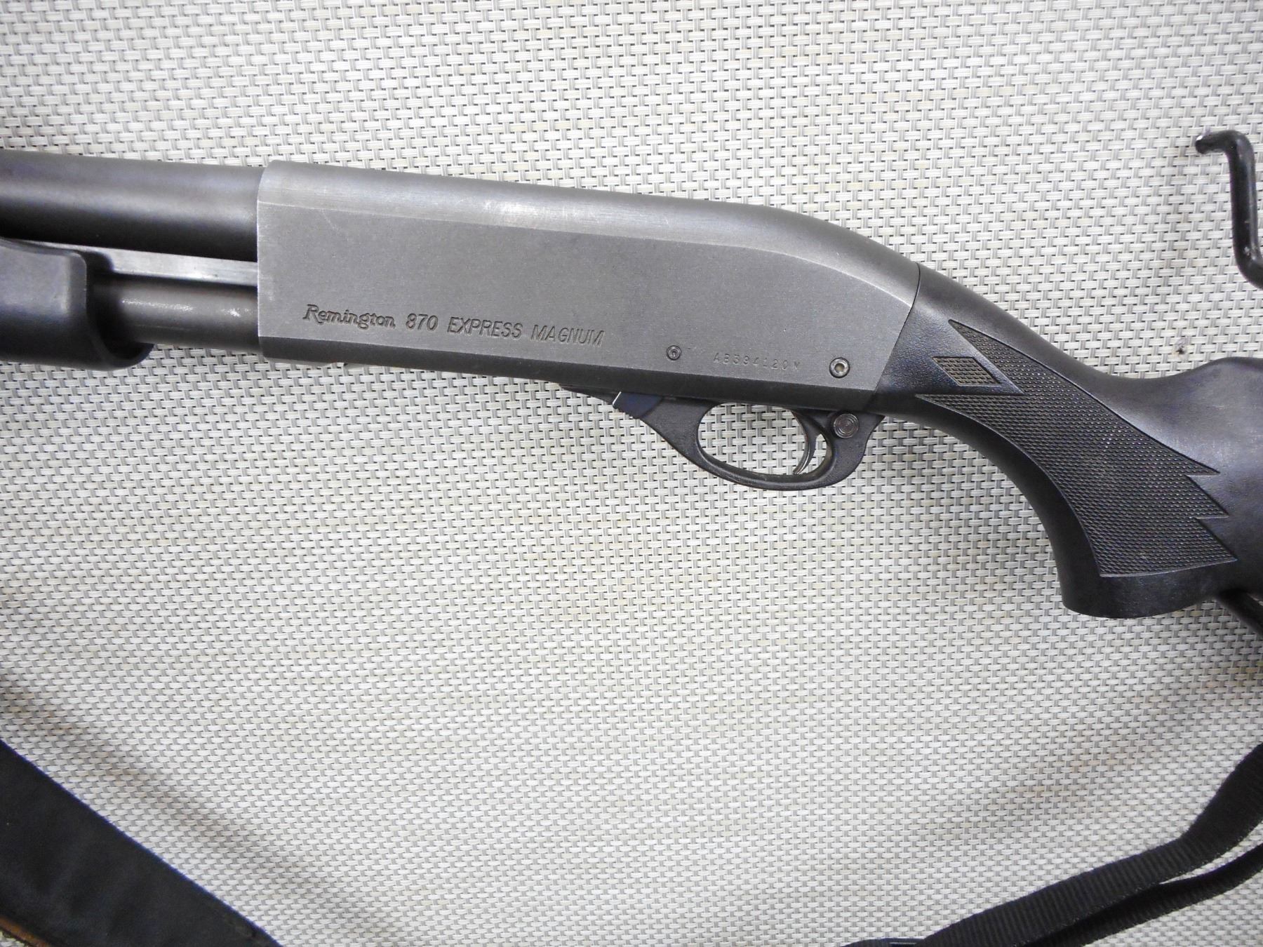 REMINGTON , MODEL: 870 EX MAG , CALIBER: 12GA X 3" , BORE IS EXCELLENT , FEATURES A RIFLED SLUG BARREL, CYLINDER BORE, RAMP FRONT AND ADJUSTABLE REAR SIGHT, SYNTHETIC FOREND WITH SEMI PISTOL GRIP BUTT STOCK AND RUBBER RECOIL PAD, NYLON SLING ATTACHED, SHOWS SOME HANDLING MARKS , SERIAL # AB394120M , ACTION: PUMP ACTION SHOTGUN , BARREL LENGTH: 20" , CONDITION: 7/10 , STOCK # 8986 , CLASS: CANADIAN NON RESTRICTED CLASS