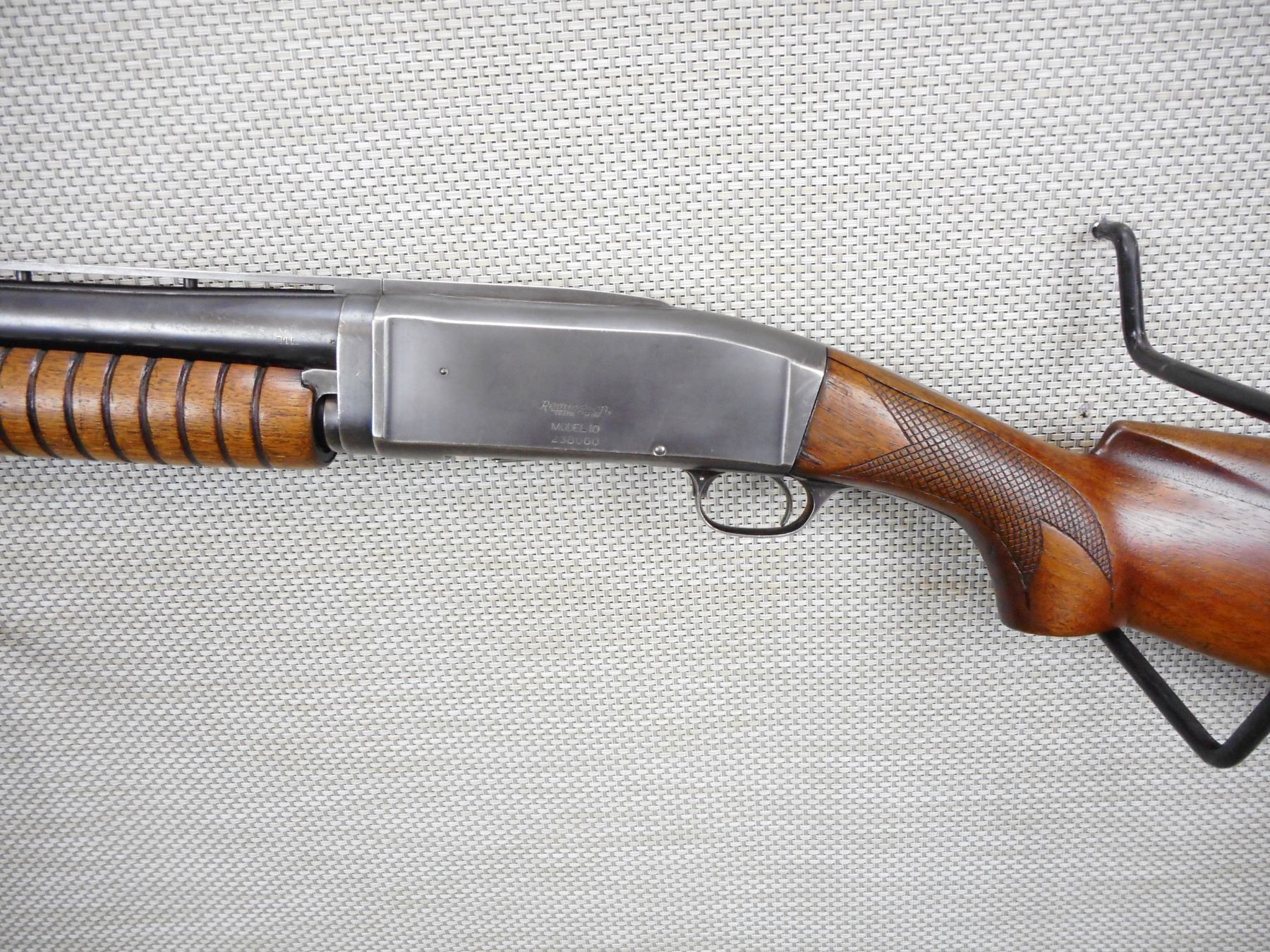 REMINGTON , MODEL: 10 , CALIBER: 12GA X 2 3/4" , BORE IS VERY GOOD, FIXED FULL CHOKE, BEAD FRONT SIGHT ON A VENTED RIB BARREL, AFTERMARKET CHECKERED SEMI PISTOL GRIP BUTT STOCK WITH OVERSIZED VENTED RUBBER RECOIL PAD, SHOWS SOME HANDLING MARKS , SERIAL # 238060 , ACTION: PUMP ACTION SHOTGUN , BARREL LENGTH: 30" , CONDITION: 5/10 , STOCK # 8987 , CLASS: CANADIAN NON RESTRICTED CLASS