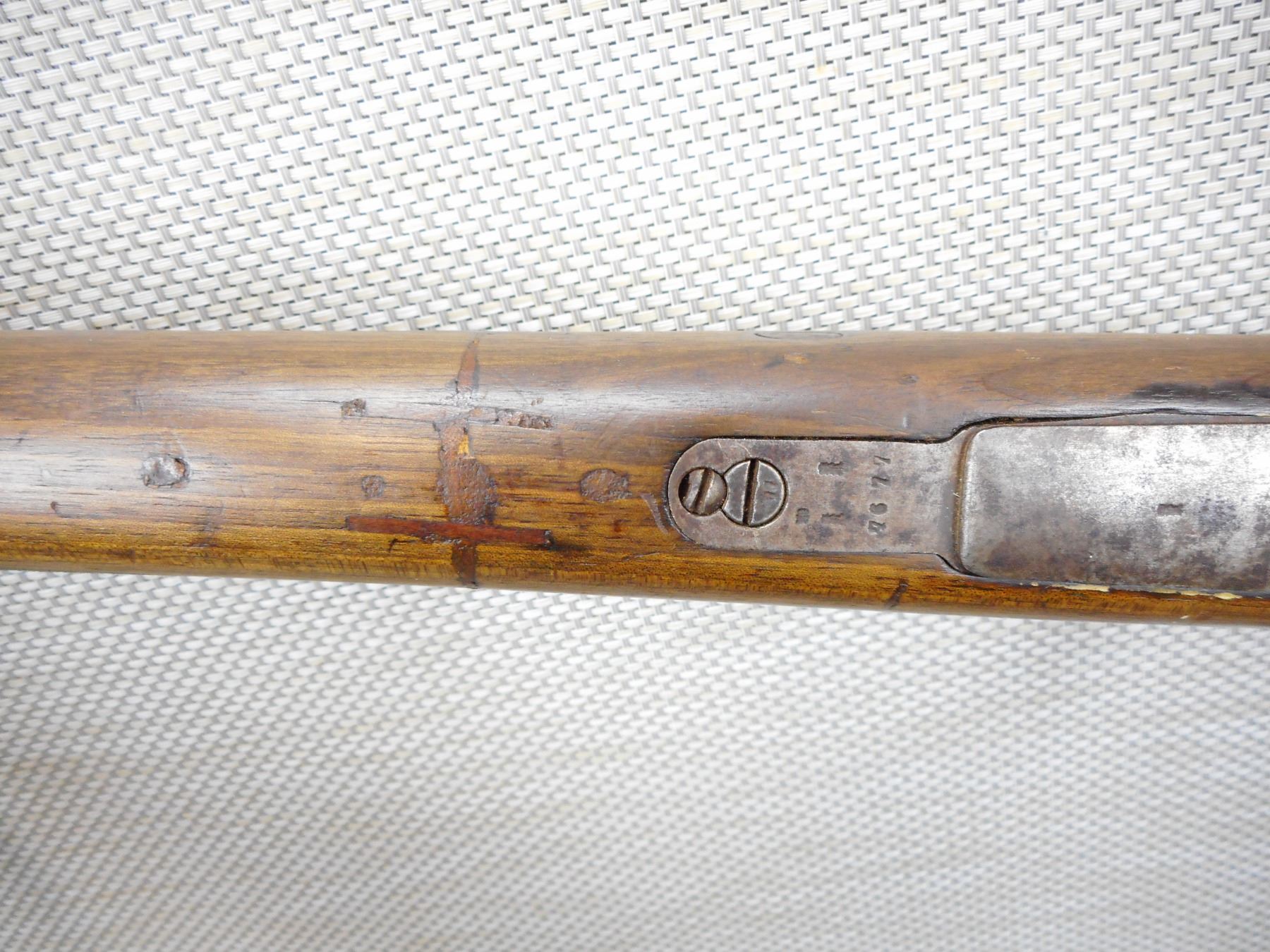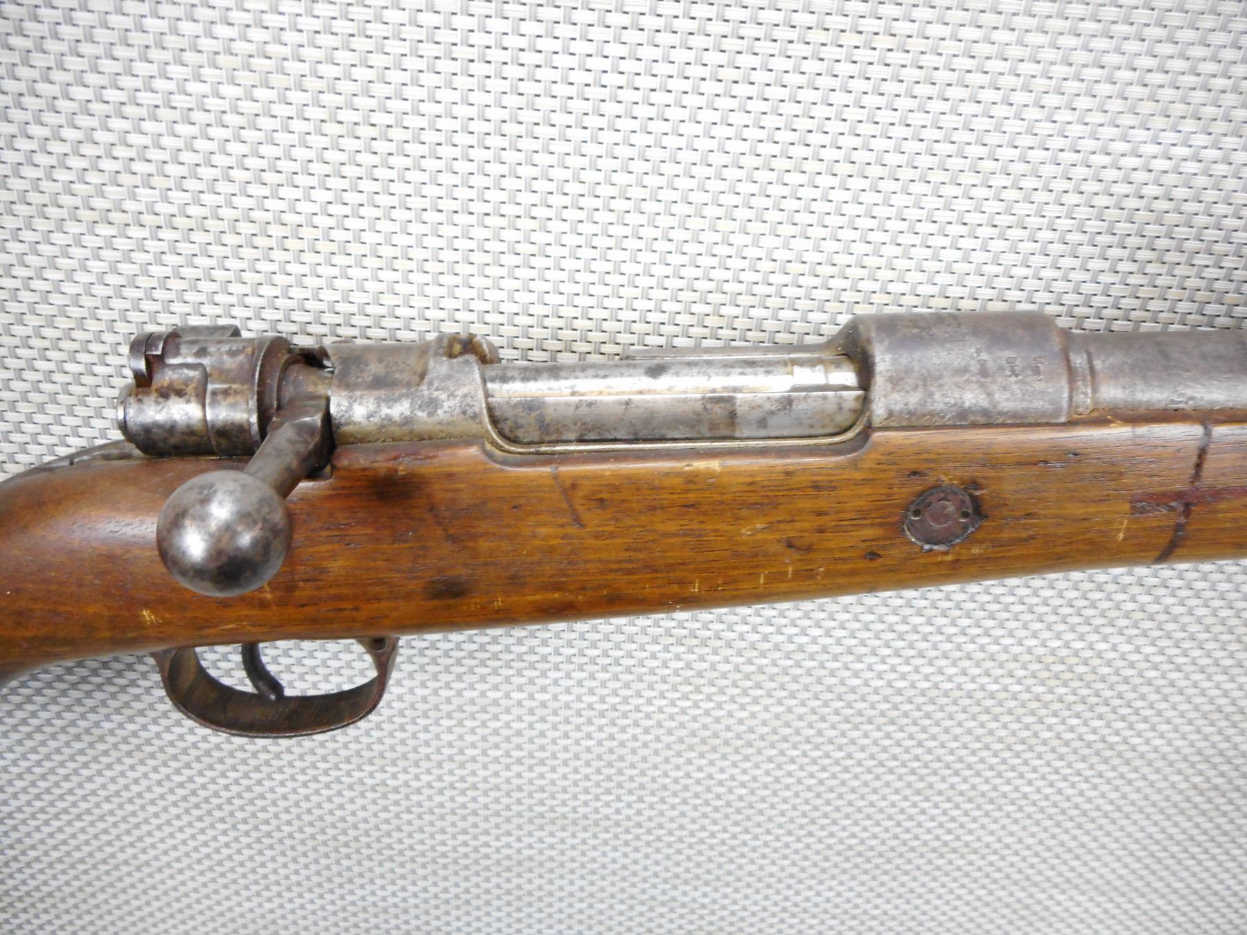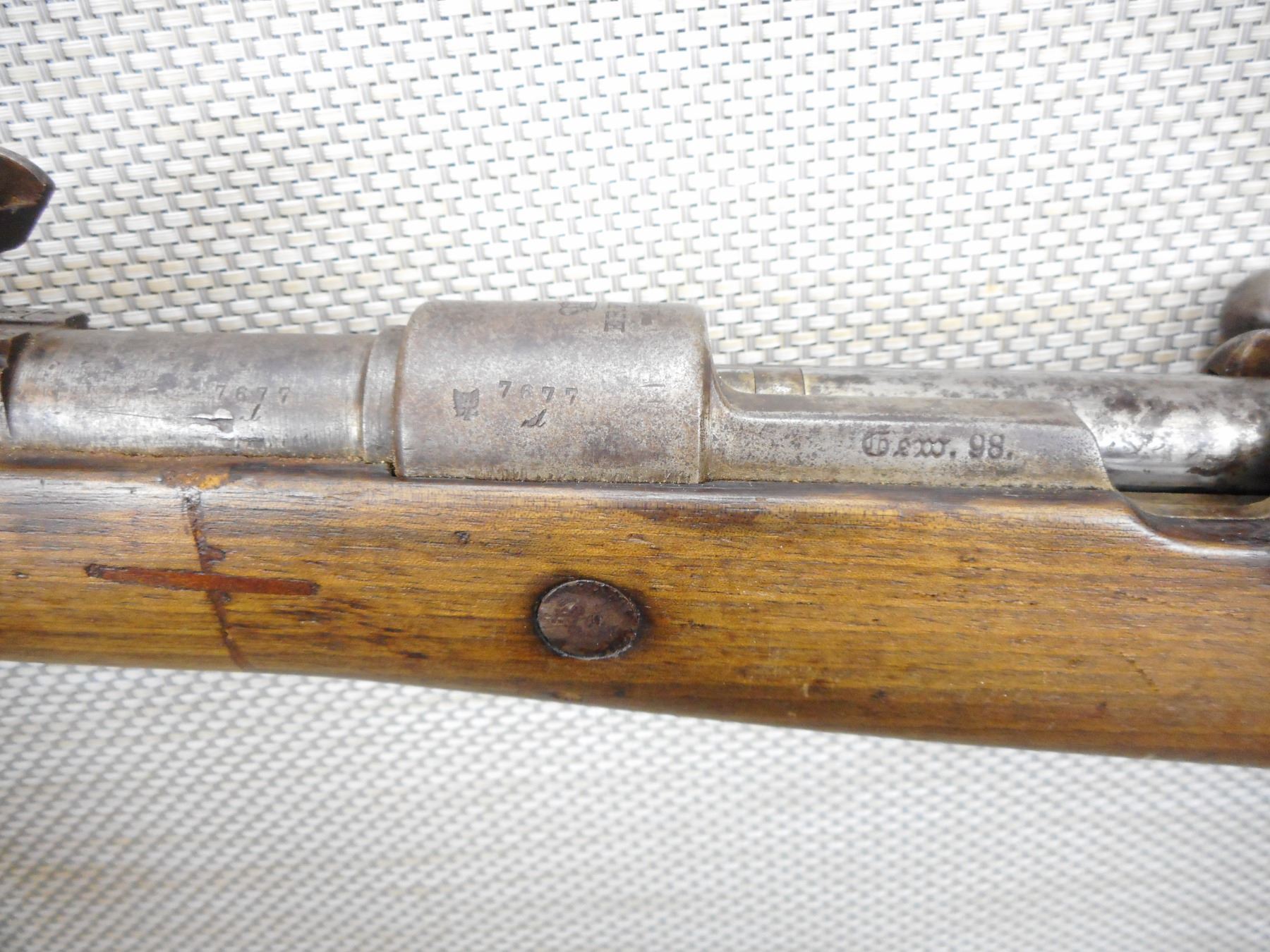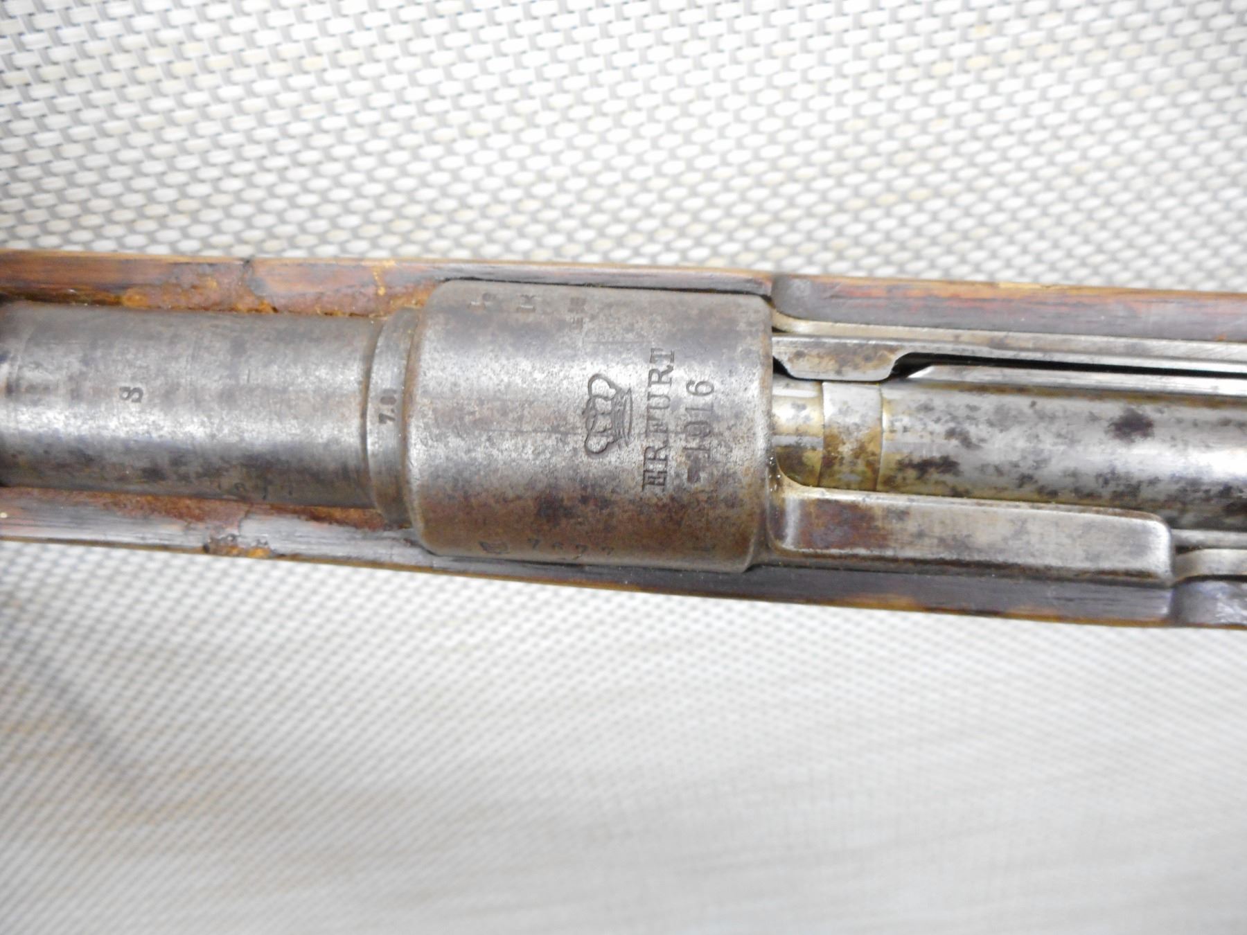 ERFURT , MODEL: GEW 98 , CALIBER: 8 X 57MM , BORE IS DARK, BOLT AND RECEIVER MATCH BY SERIAL #, BLADE FRONT AND ADJUSTABLE REAR SIGHT, RETAINS FULL MILITARY CONFIGURATION, STOCK HAS BEEN REPAIRED, SLING SWIVELS, MISSING THE CLEANING ROD, SHOWS EXTENSIVE HANDLING MARKS, STEEL BUTT PLATE , SERIAL # 7677 , ACTION: BOLT ACTION RIFLE , BARREL LENGTH: 29" , CONDITION: 5/10 , STOCK # 8992 , CLASS: CANADIAN NON RESTRICTED CLASS