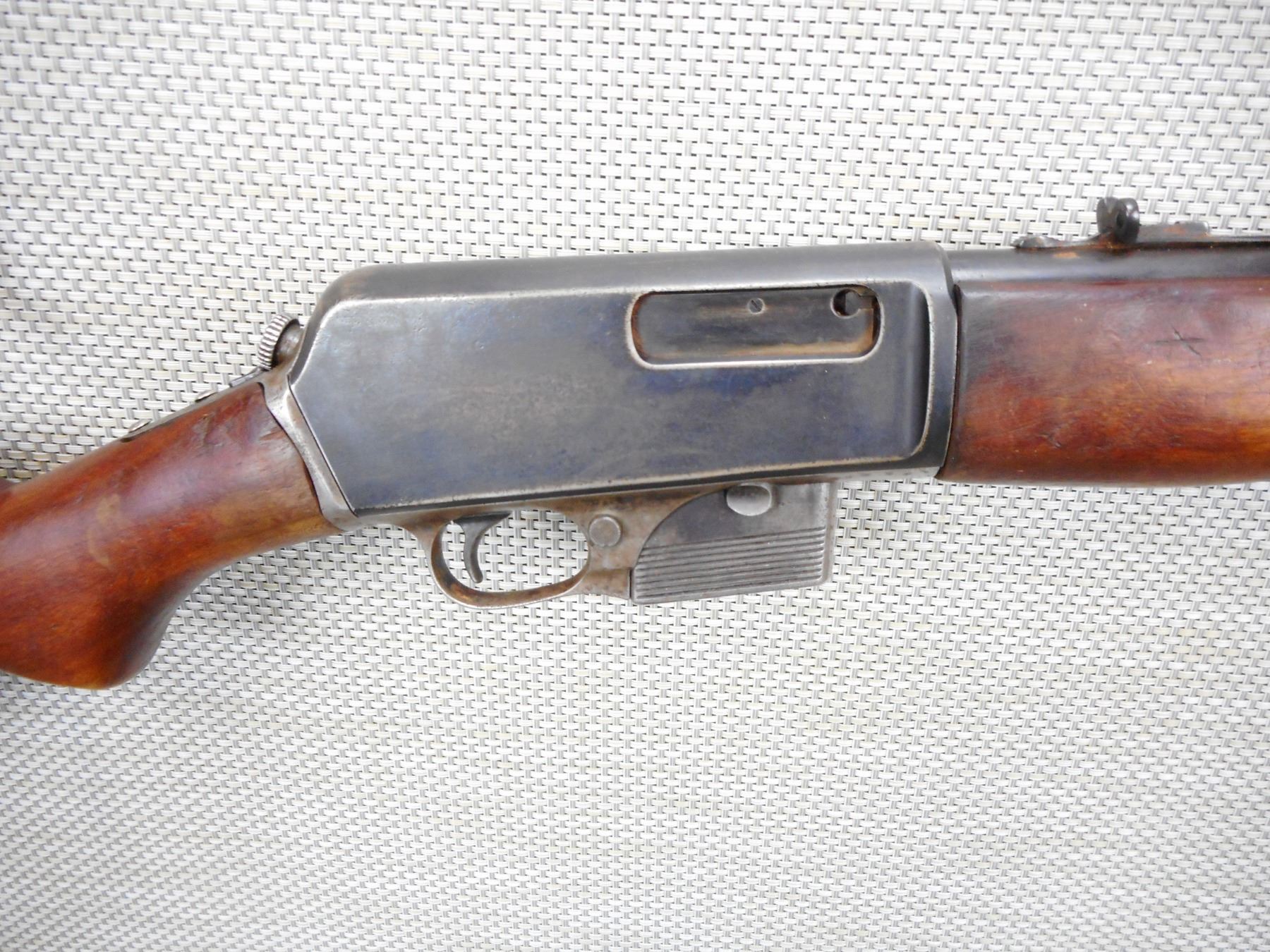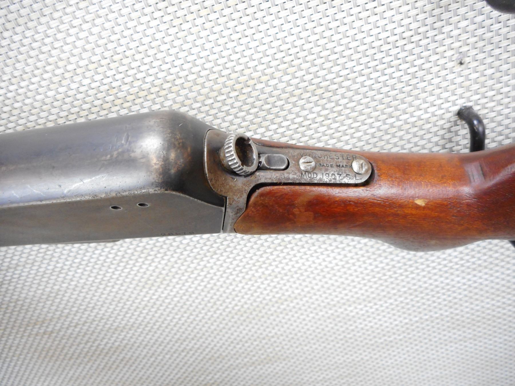 WINCHESTER , MODEL: 1907SL , CALIBER: 351 SL , COMES WITH MAGAIZNE, BORE IS DARK, BLADE FRONT AND ADJUSTABLE REAR SIGHT, STOCK APPEARS TO HAVE BEEN REPLACED, DRILLED AND TAPPED FOR SCOPE MOUNTS, SHOWS EXTENSIVE HANDLING MARKS, PLASTIC BUTT PLATE , SERIAL # 20750 , ACTION: SEMI AUTOMATIC RIFLE , BARREL LENGTH: 20" , CONDITION: 4/10 , STOCK # 8993 , CLASS: CANADIAN NON RESTRICTED CLASS