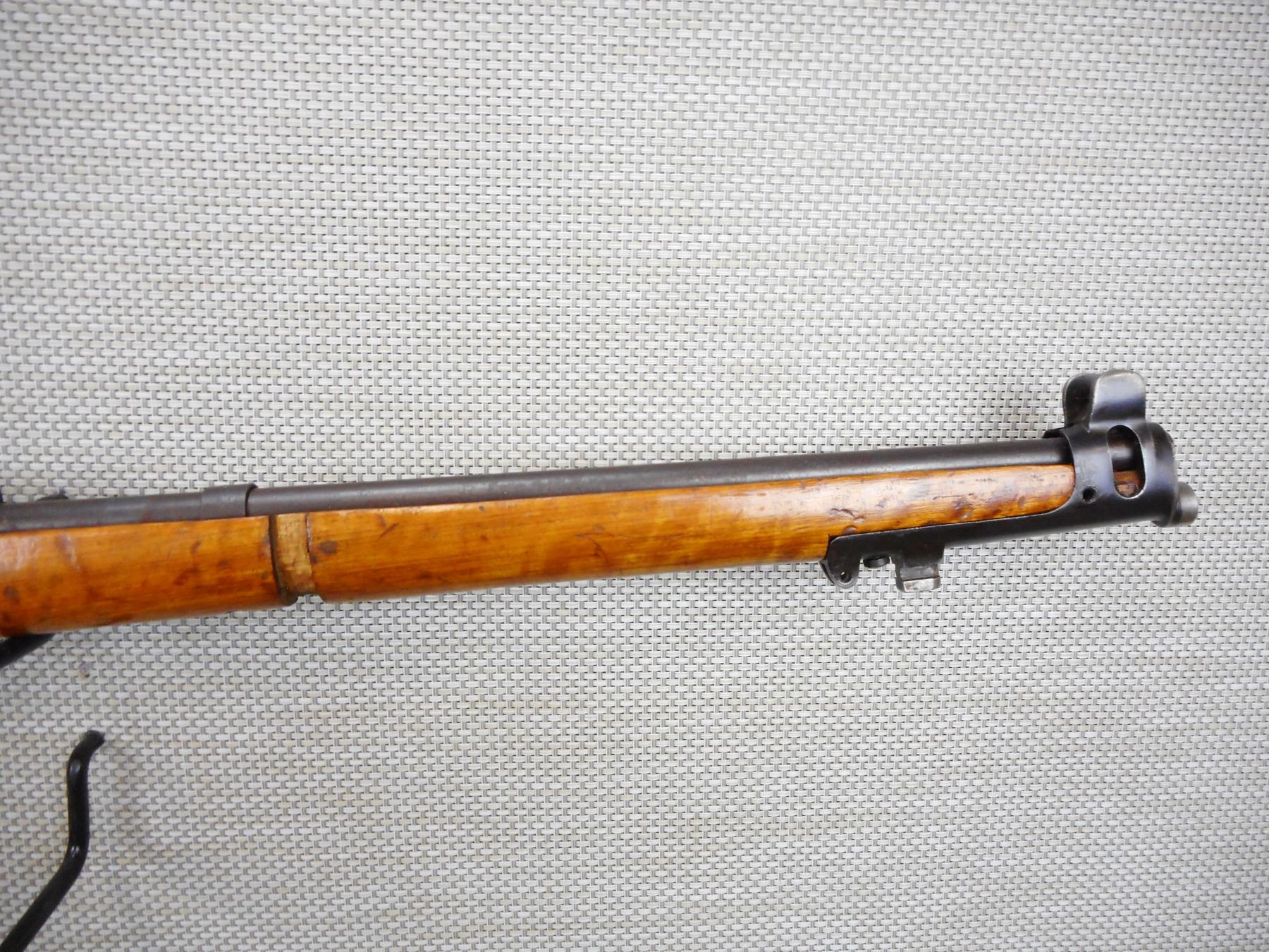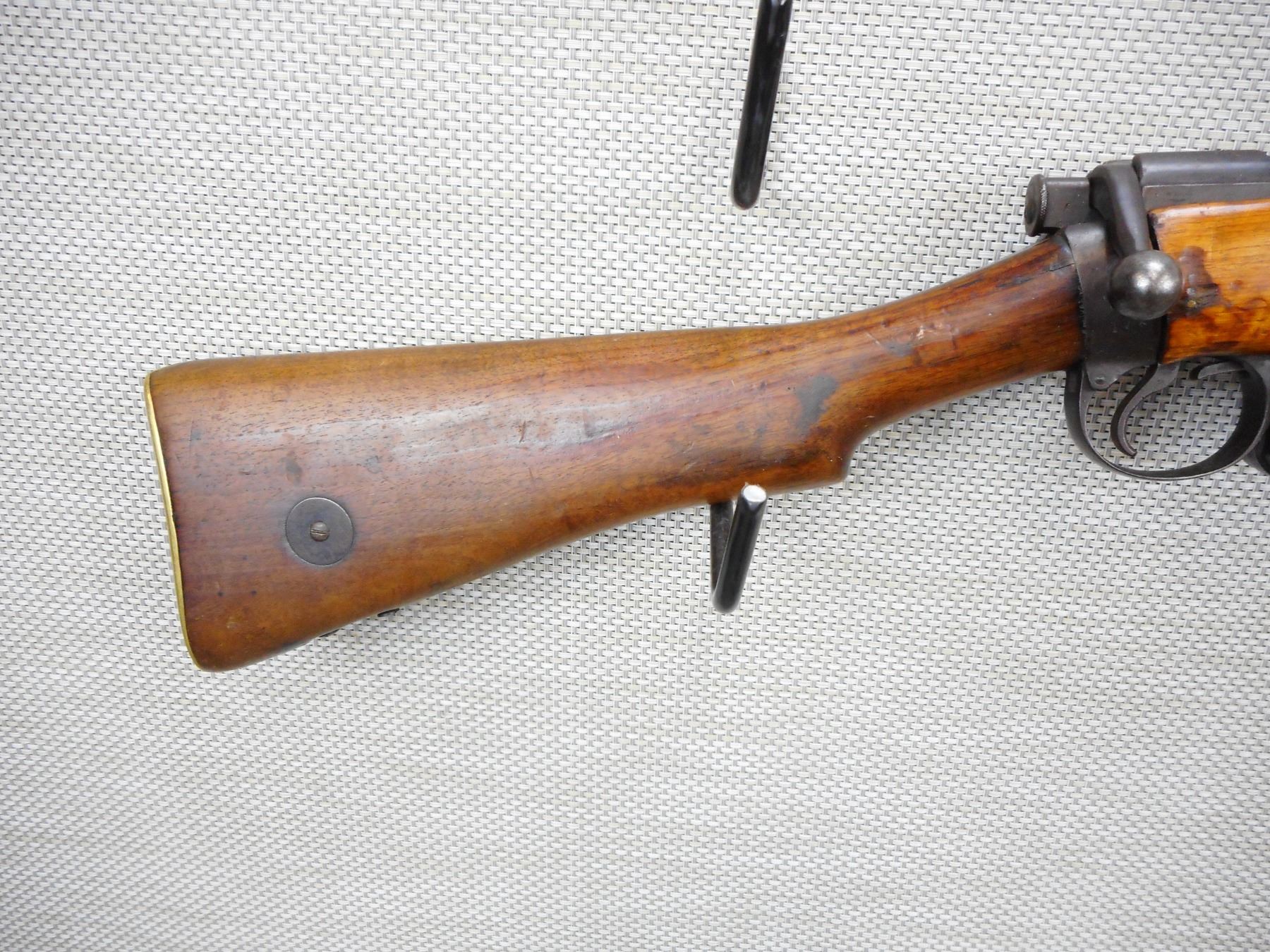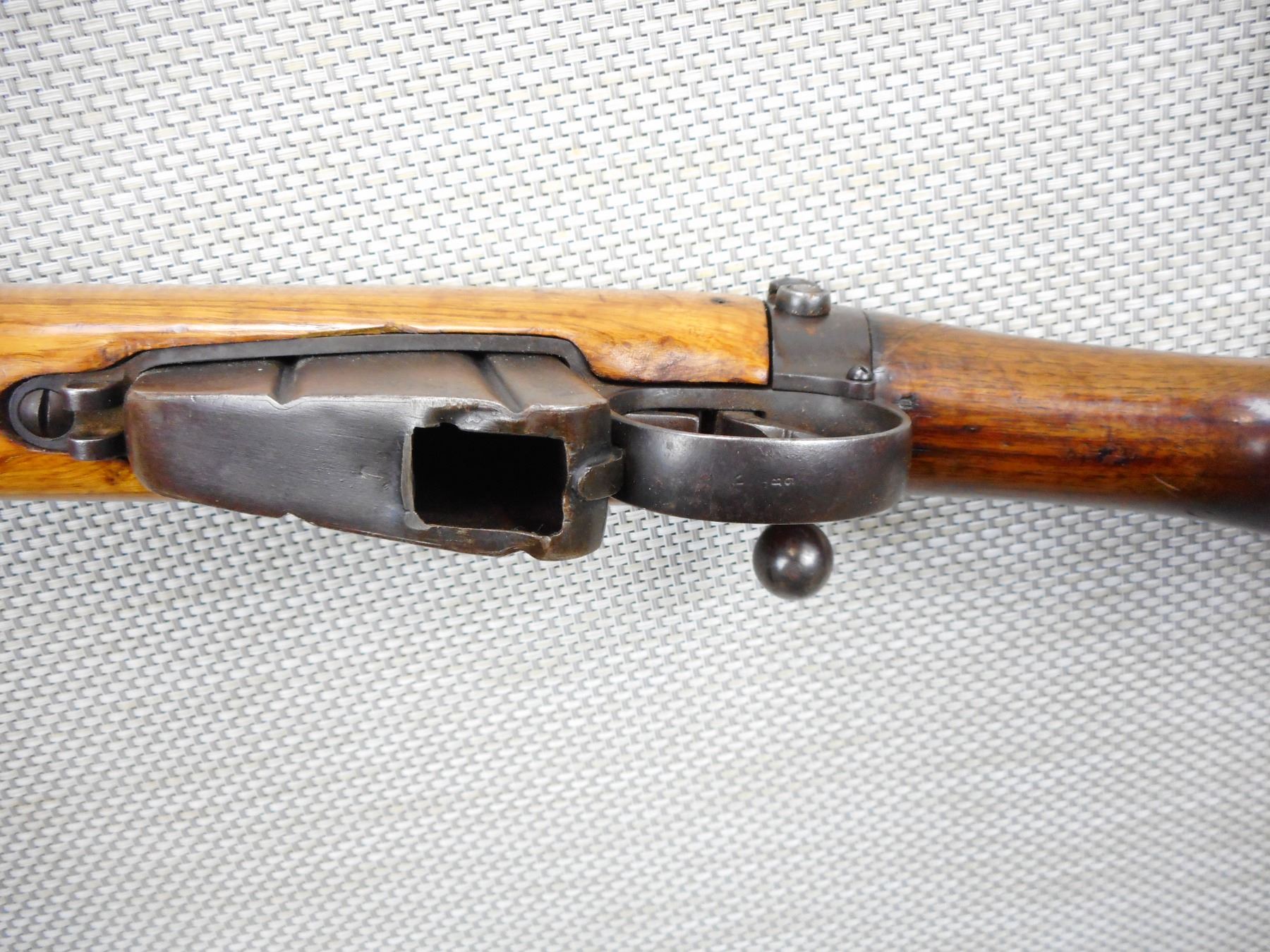 WWI ERA, LEE ENFIELD , MODEL: 22 MKIV* TRAINER , CALIBER: 22 LR , COMES WITH MAGAZINE FOR SHOW, THIS IS A SINGLE SHOT THE BODYOF THE MAGAZINE HAS A HOLE WITH A SPENT CARTRIDGE PORT, MADE BY BSA 1915 WWI ERA, VERY GOOD BORE, BOLT AND RECEIVER MATCH BY SERIAL #, BARLEY CORN FRONT AND ADJUSTABLE REAR SIGHT, FOREND WOOD APPEARS TO BE REPLACED, MISSING THE SLING SWIVELS AND FRONT BARREL BAND, BRASS BUTT PLATE, SHOWS EXTENSIVE HANDLING MARKS , SERIAL # X78648 , ACTION: BOLT ACTION RIFLE , BARREL LENGTH: 25" , CONDITION: 4/10 , STOCK # 9002 , CLASS: CANADIAN NON RESTRICTED CLASS