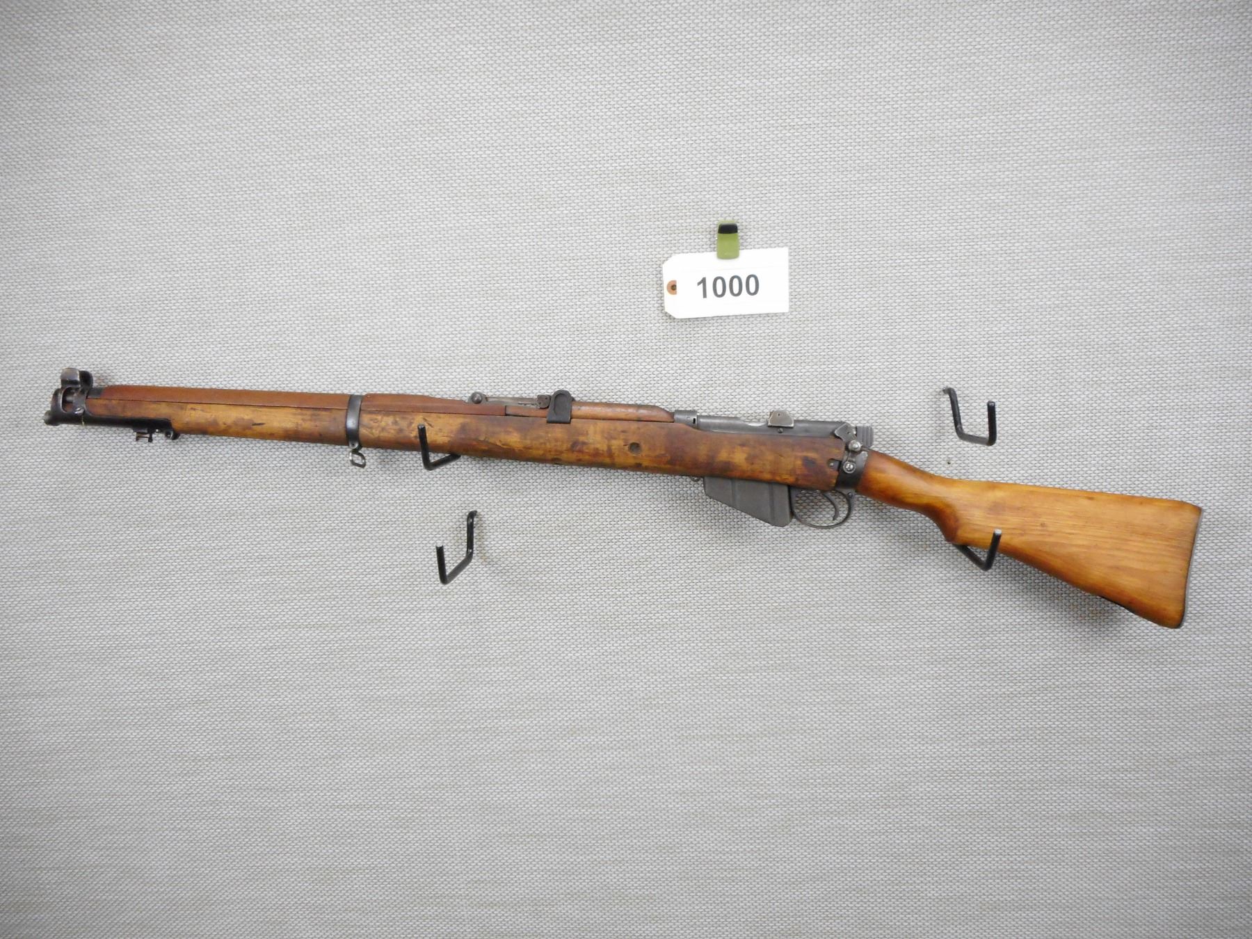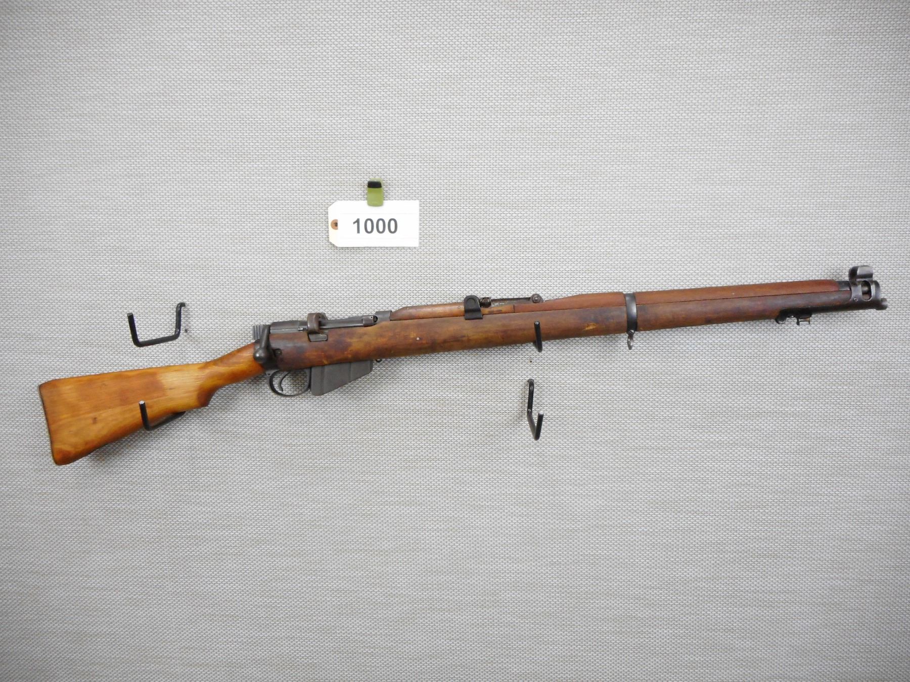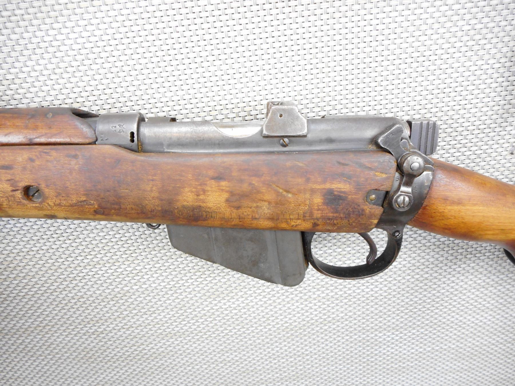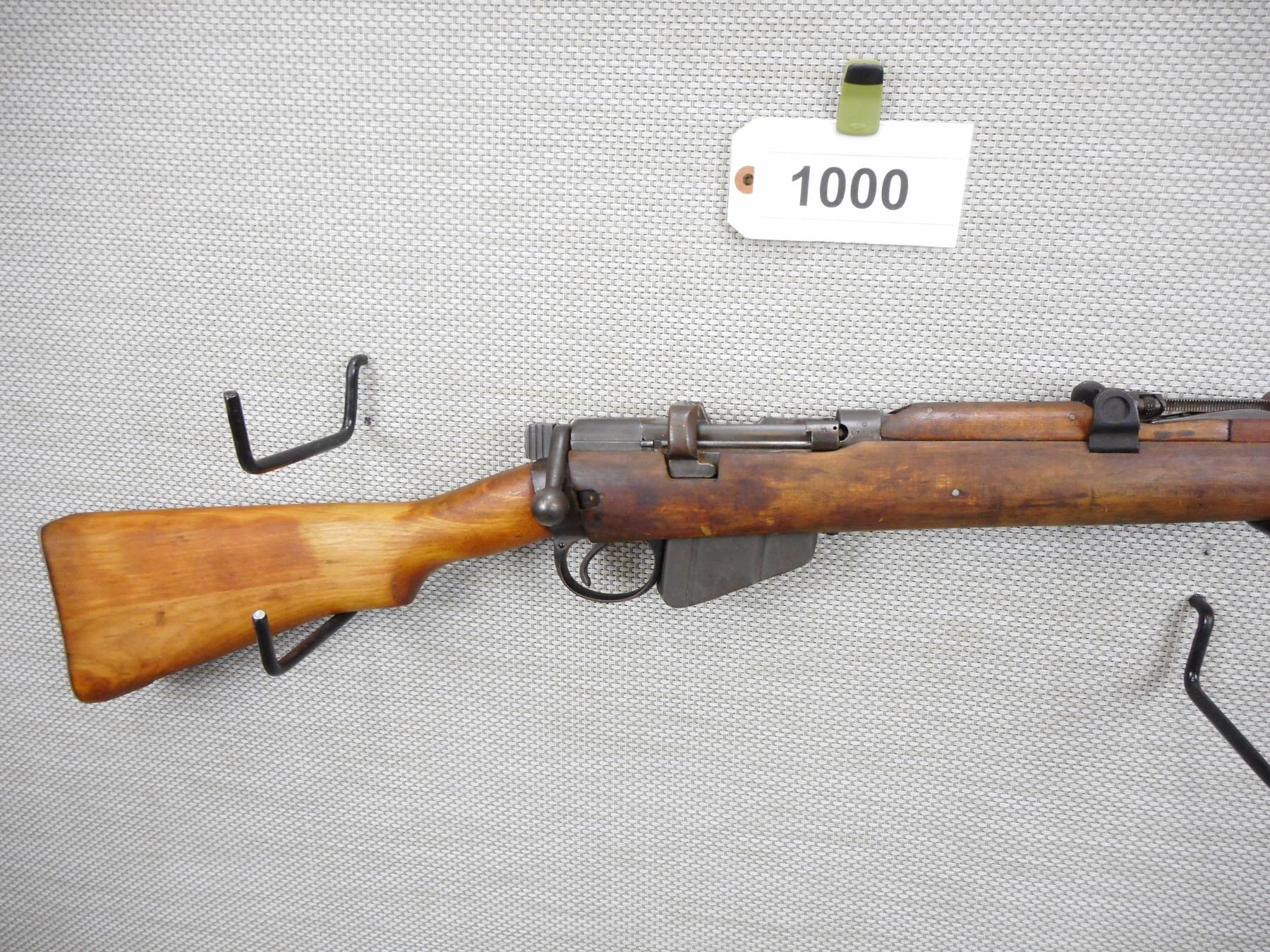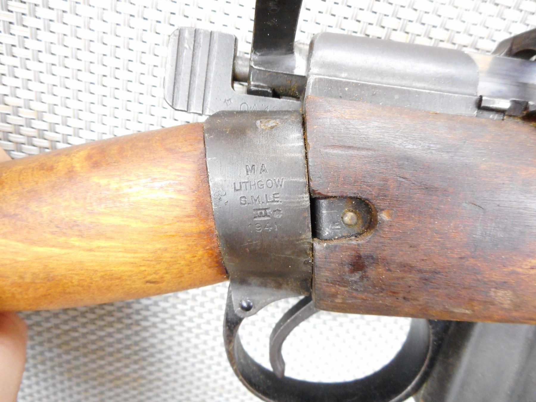 WWII ERA,LEE ENFIELD , MODEL: MKIII* , CALIBER: 303 BR , COMES WITH MAGAZINE, WWII ERA DATED 1941, BOLT AND RECEIVER DON'T MATCH BY SERIAL #, BORE IS FAIR, RETAINS FULL MILITARY CONFIGURATION, BARLEY CORN FRONT AND ADJUSTABLE REAR SIGHTS, SLING SWIVEL LOOPS, STEEL BUTT PLATE, SHOWS EXTENSIVE HANDLING MARKS, MISSING THE REAR SLING SWIVEL, BUTT STOCK APPEARS TO BE REFINISHED , SERIAL # C13600 , ACTION: BOLT ACTION RIFLE , BARREL LENGTH: 25" , CONDITION: 6/10 , STOCK # 9005 , CLASS: CANADIAN NON RESTRICTED CLASS
