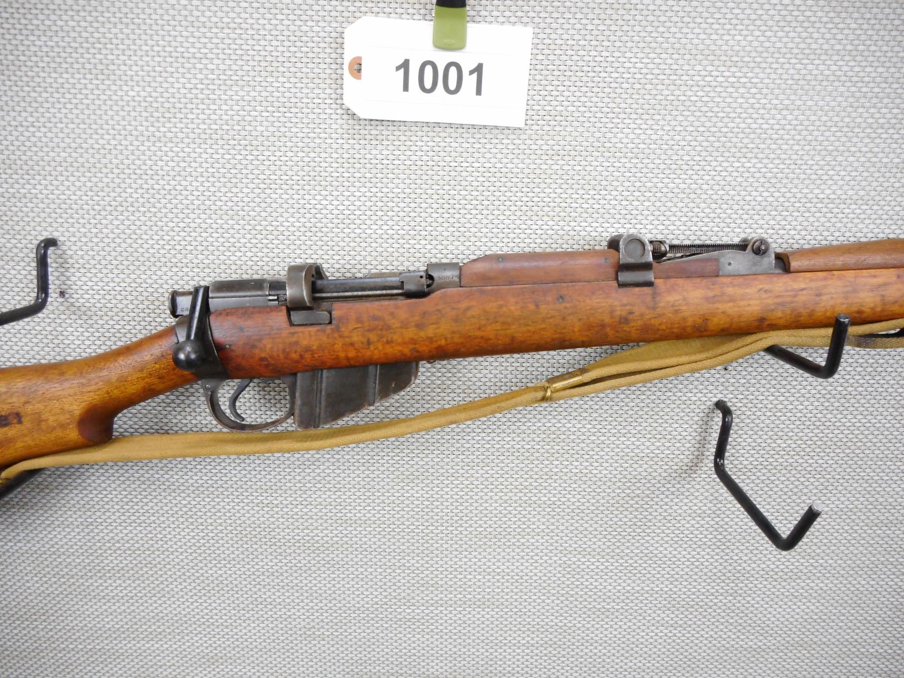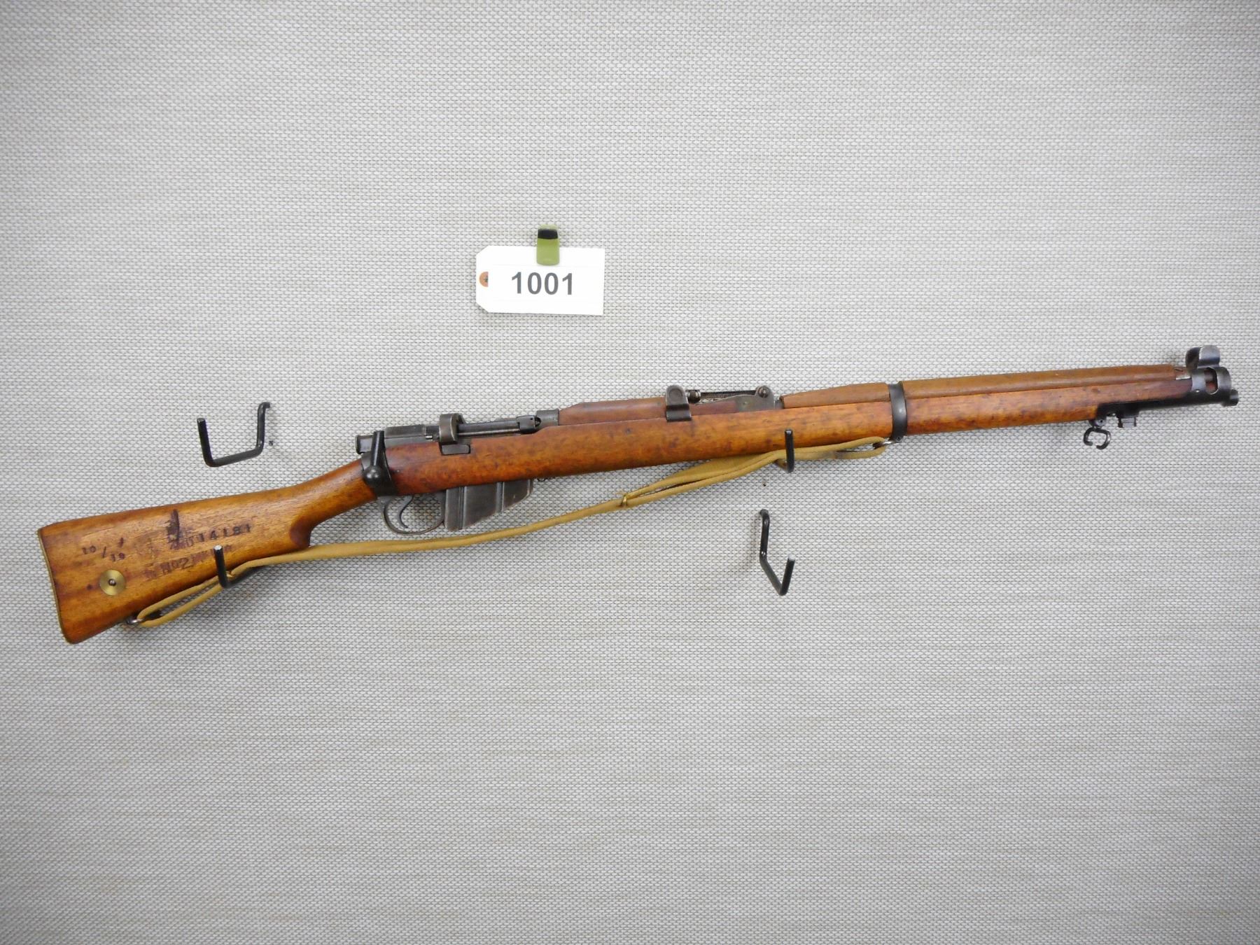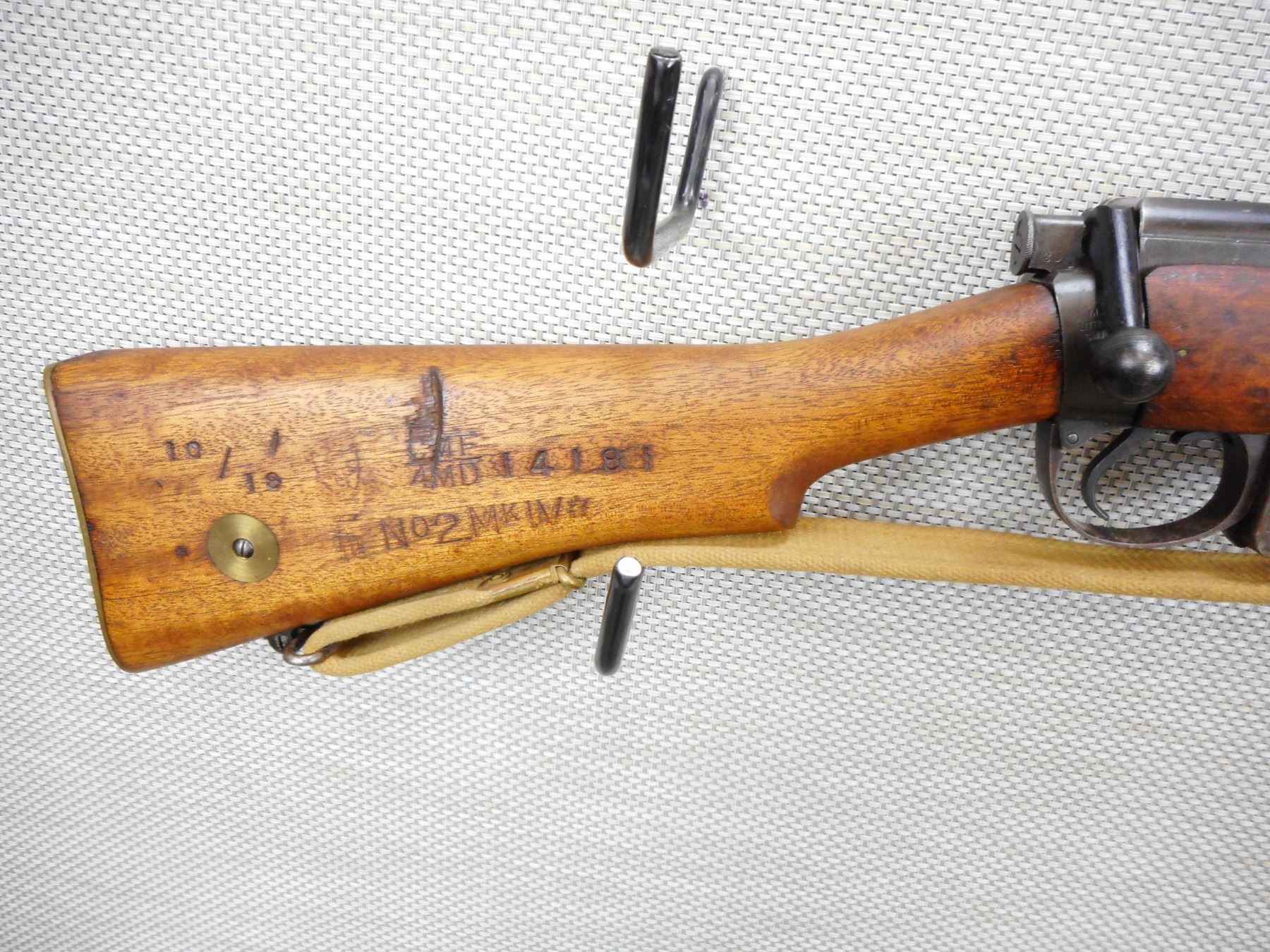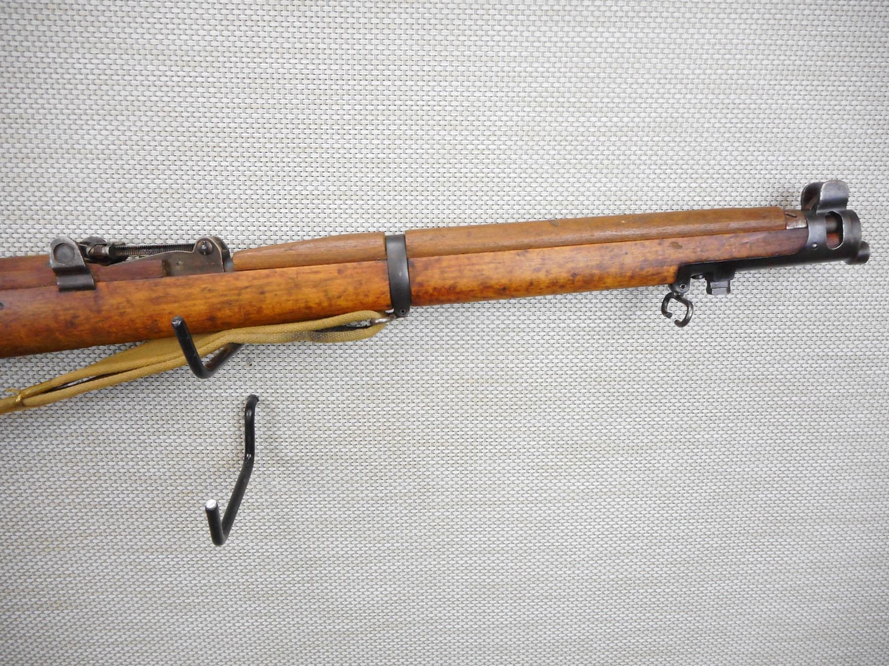 WWII ERA, LEE ENFIELD , MODEL: MKIII* , CALIBER: 303 BR , COMES WITH MAGAZINE, WWII ERA DATED 1944, BORE IS GOOD, BOLT IS NOT NUMBERED, BARLEY CORN FRONT AND ADJUSTABLE REAR SIGHTS, RETAINS FULL MILITARY CONFIGURATION, SLING SWIVEL LOOPS WITH ORIGINAL CANVAS SLING THE SLING HAS A C BRD ARROW ON IT, BUTT STOCK HAS EXTENSIVE REGIMENTAL MARKS, BRASS BUTT PLATE, SHOWS EXTENSIVE HANDLING MARKS , SERIAL # F20075 , ACTION: BOLT ACTION RIFLE , BARREL LENGTH: 25" , CONDITION: 6/10 , STOCK # 9006 , CLASS: CANADIAN NON RESTRICTED CLASS