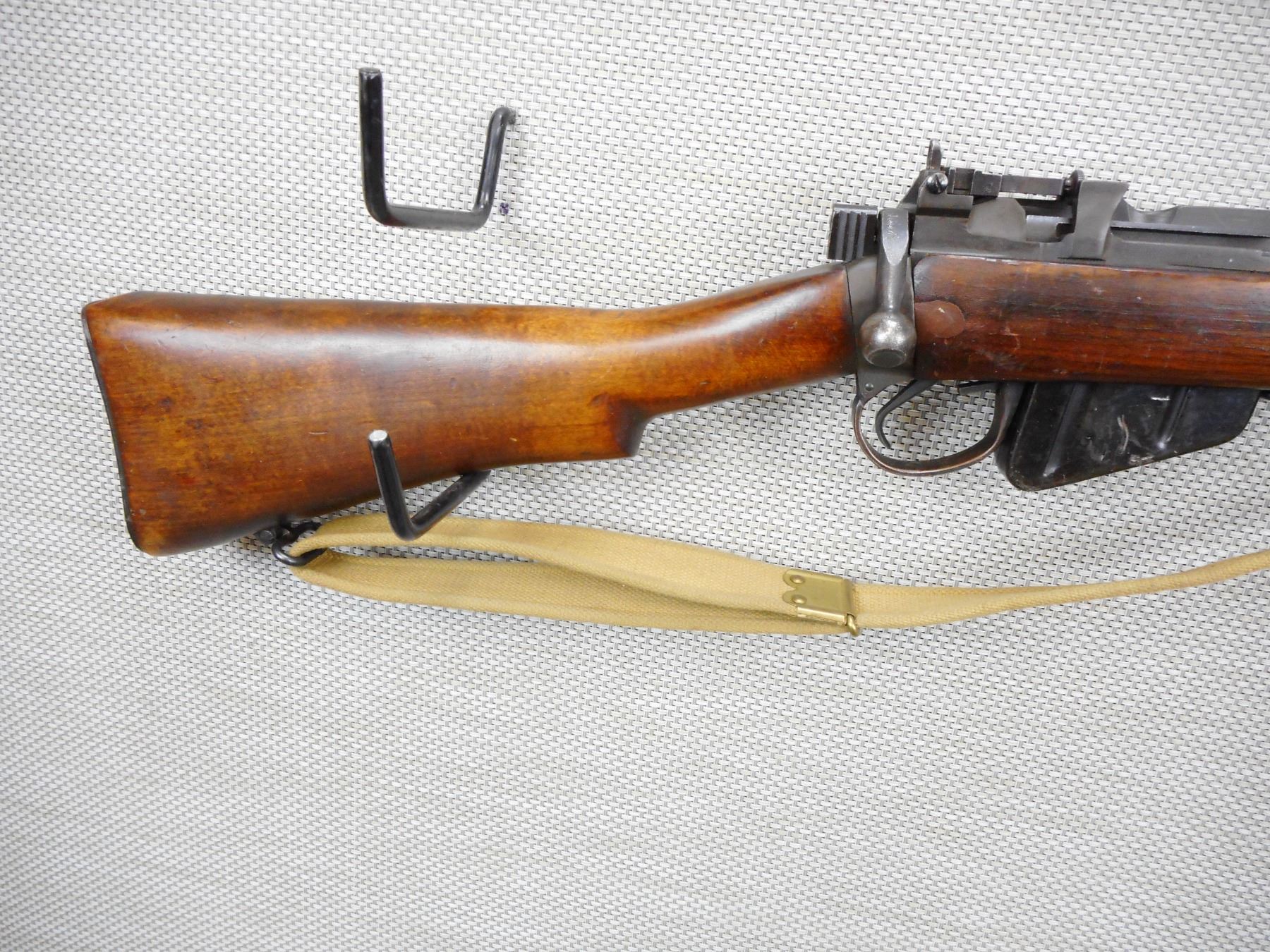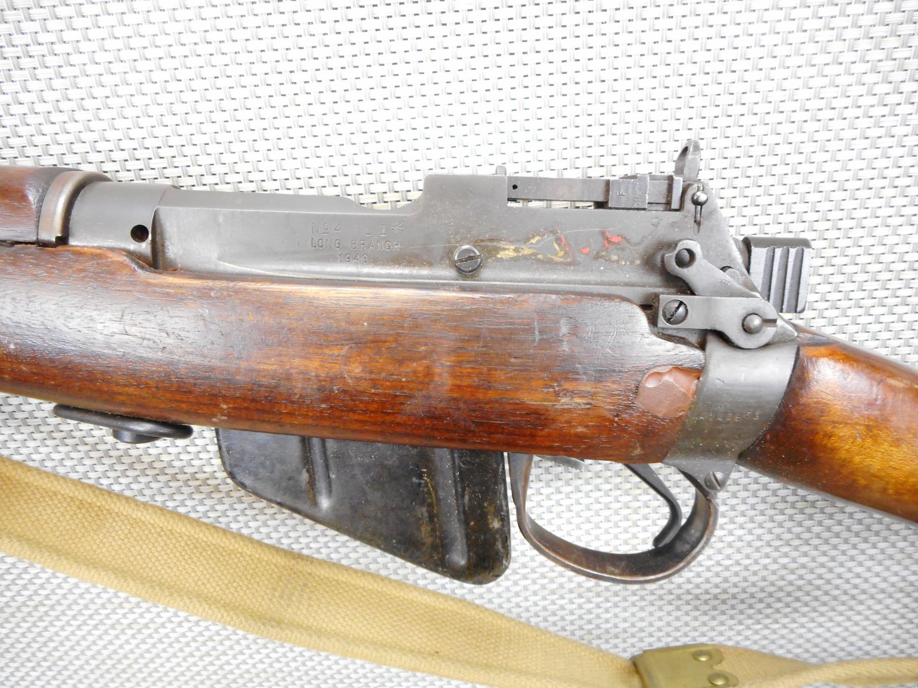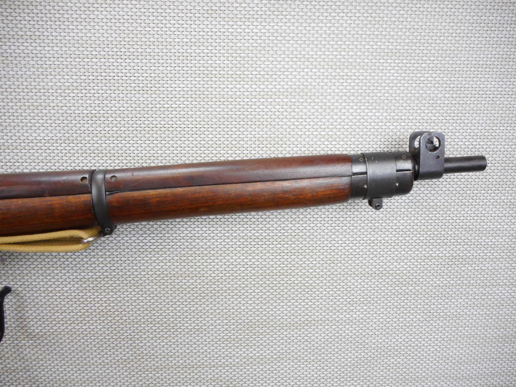 WWII ERA, LEE ENFIELD , MODEL: NO 4 MKI* LONG BRANCH , CALIBER: 303 BR , COMES WITH MAGAZINE, WWII ERA DATED 1943, BOLT AND RECEIVER MATCH BY SERIAL #, VERY GOOD BORE, RETAINS FULL MILITARY CONFIGURATION, BARLEY CORN FRONT AND PEEP REAR SIGHT, SHOWS SOME HANDLING MARKS, SLING SWIVEL WITH C BRD ARROW MARKED SLING, STEEL BUTT PLATE, STOCK HAS BEEN ARSENAL REPAIRED , SERIAL # 41L2803 , ACTION: BOLT ACTION RIFLE , BARREL LENGTH: 25" , CONDITION: 6/10 , STOCK # 9010 , CLASS: CANADIAN NON RESTRICTED CLASS