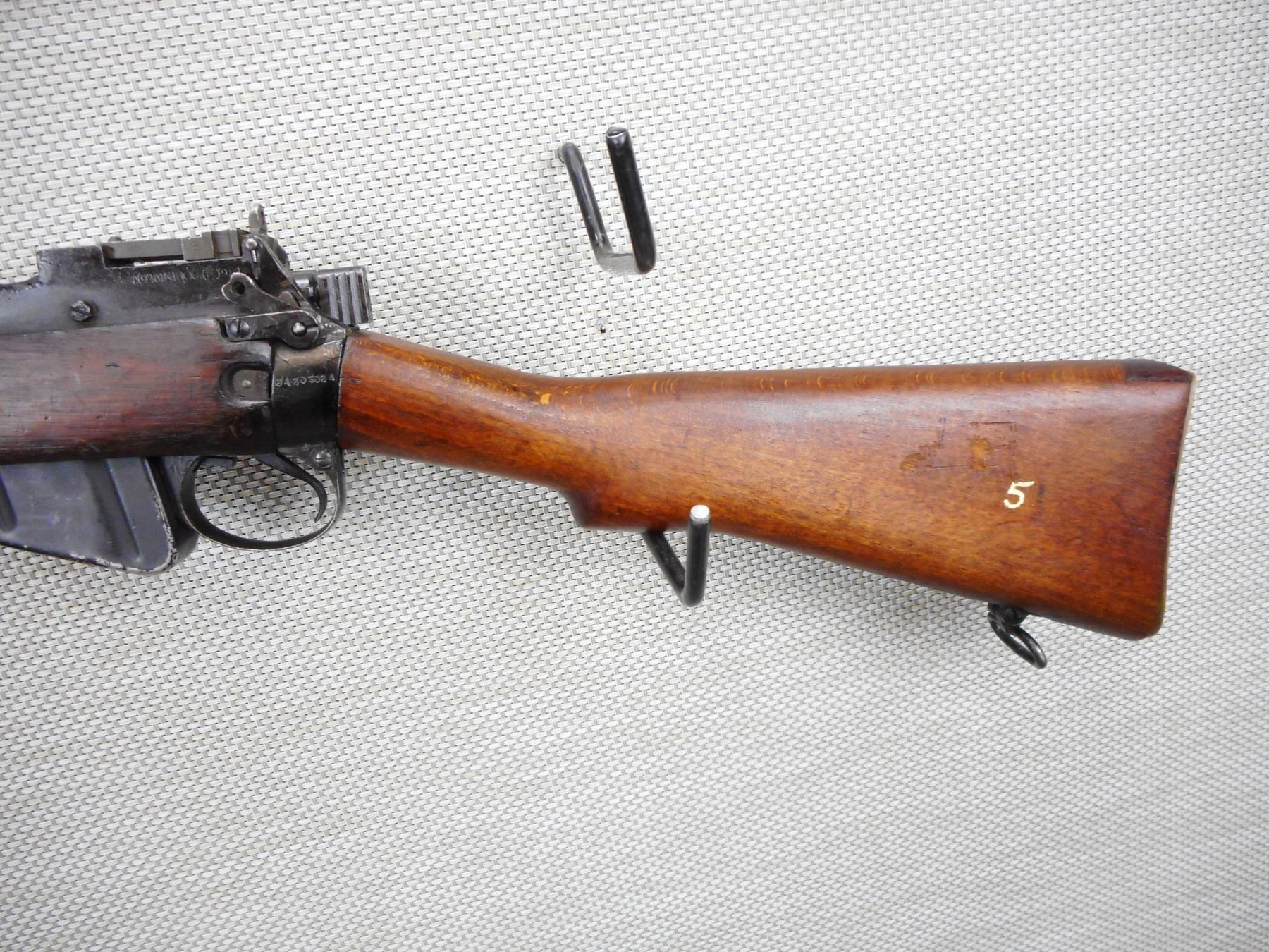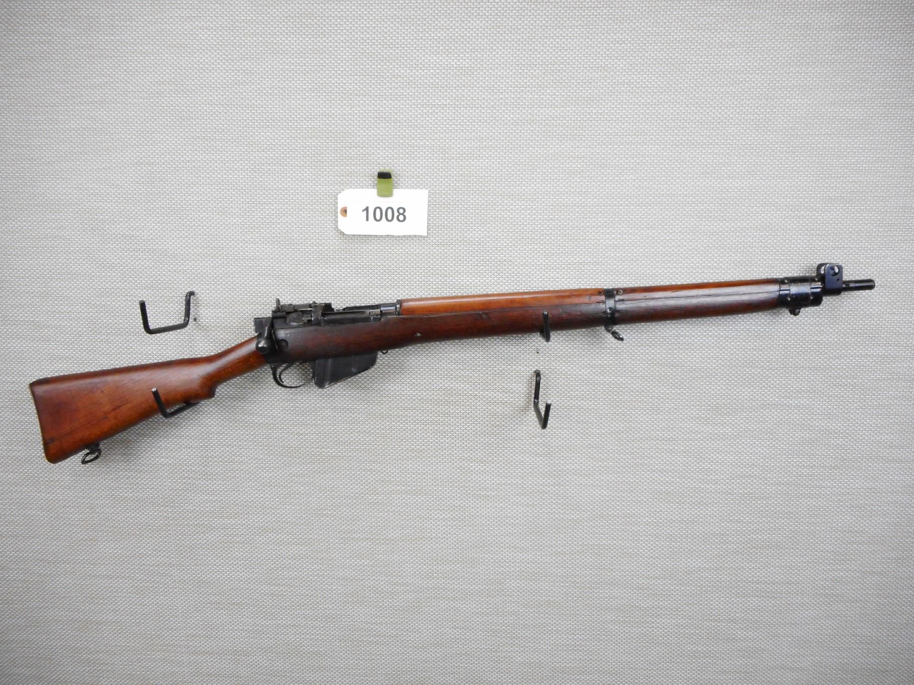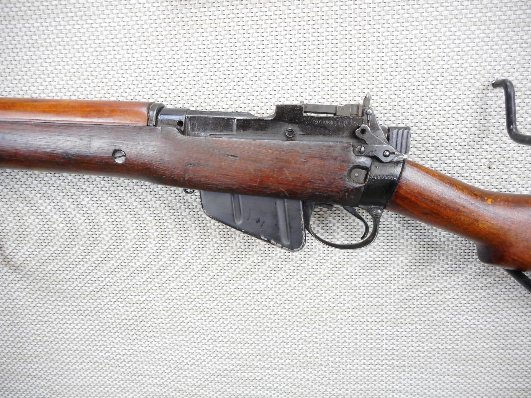 WWII ERA, LEE ENFIELD , MODEL: NO 4 MKI , CALIBER: 303 BR , COMES WITH MAGAZINE, DATED 1943 WWII ERA, BOLT AND RECEIVER MATCH BE SERIAL #, EXCELLENT BORE, BARLEY CORN FRONT AND PEEP APERTURE REAR SIGHT, SHOWS SOME HANDLING MARKS, STOCK HAS BEEN ARSENAL REPAIRED, BRASS BUTT PLATE, SLING SWIVEL LOOPS , SERIAL # JA20302A , ACTION: BOLT ACTION RIFLE , BARREL LENGTH: 25" , CONDITION: 7/10 , STOCK # 9013 , CLASS: CANADIAN NON RESTRICTED CLASS