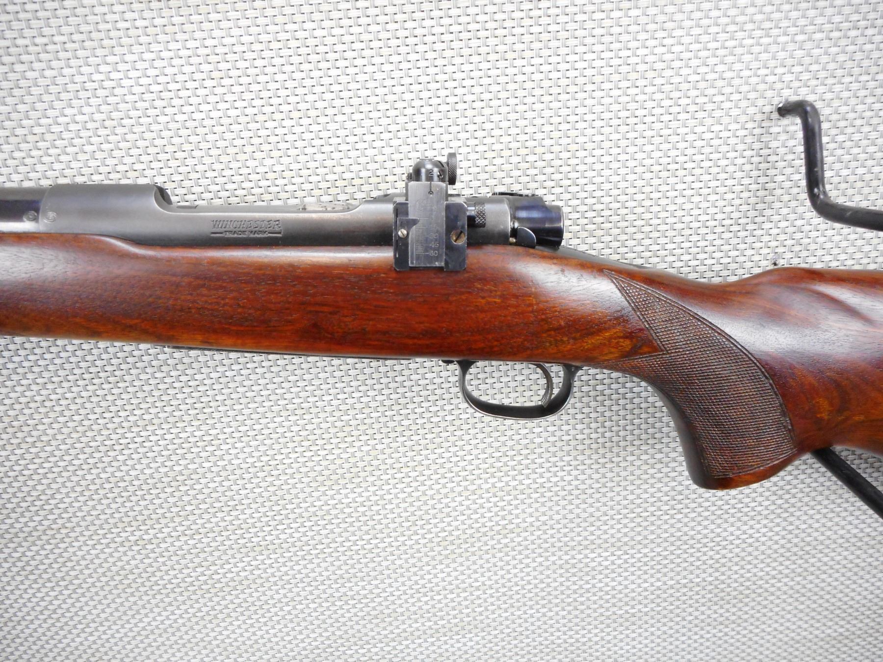 WINCHESTER , MODEL: 70 , CALIBER: 375 H&H MAGNUM , MANUFACTURED IN 1952, BORE IS EXCELLENT, RAMP FRONT SIGHT AND FLIP ADJUSTABLE REAR SIGHT AS WELL AS A PEEP SIGHT, CHECKERED FOREND AND SEMI PISTOL GRIP BUTT STOCK WITH RUBBER RECOIL PAD, SLING SWIVEL LOOPS, SHOWS VERY LITTLE HANDLING MARKS, RECEIVER HAS BEEN DRILLED FOR SCOPE MOUNT , SERIAL # 246488 , ACTION: BOLT ACTION RIFLE , BARREL LENGTH: 25" , CONDITION: 8/10 , STOCK # 9022 , CLASS: CANADIAN NON RESTRICTED CLASS