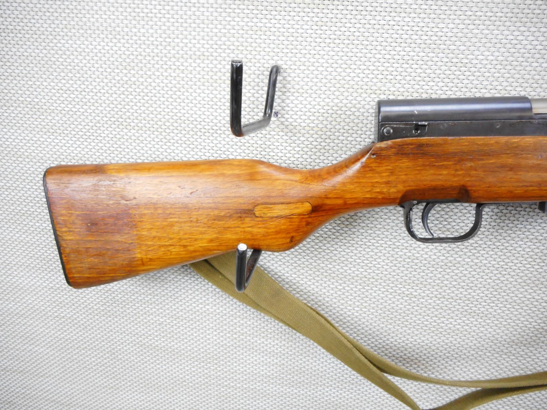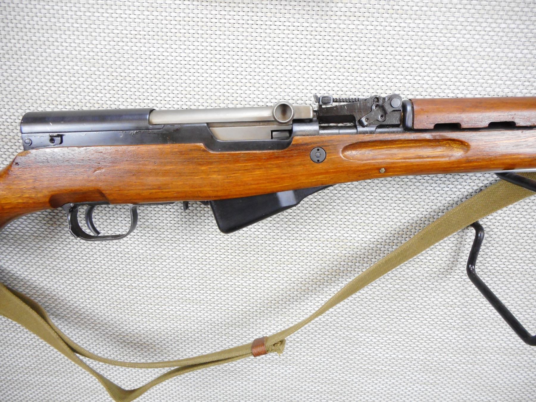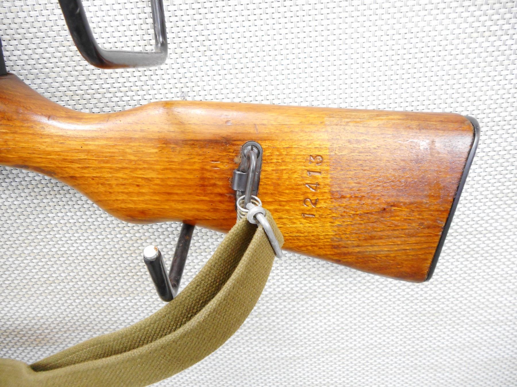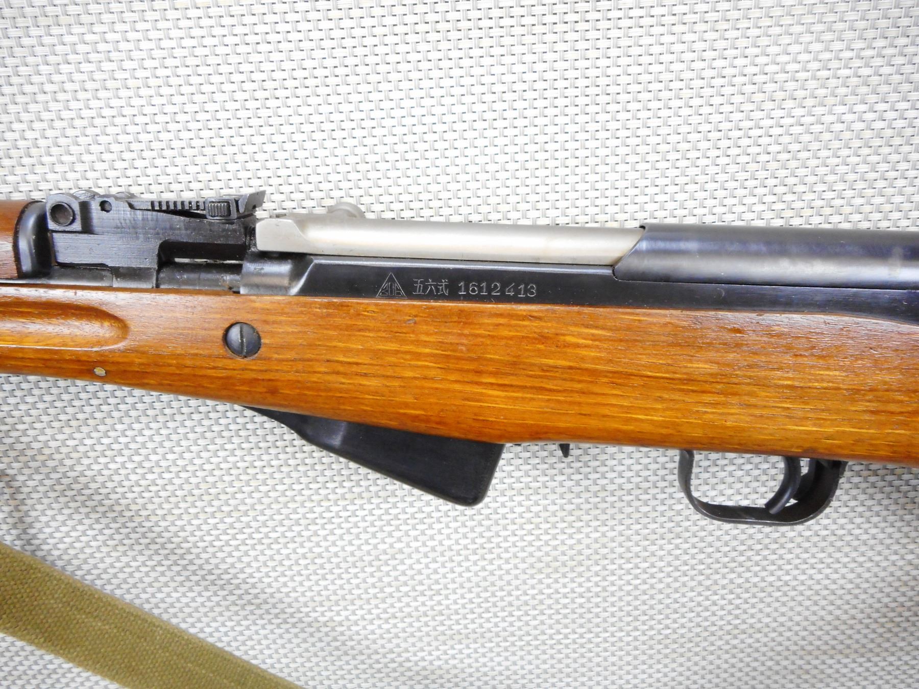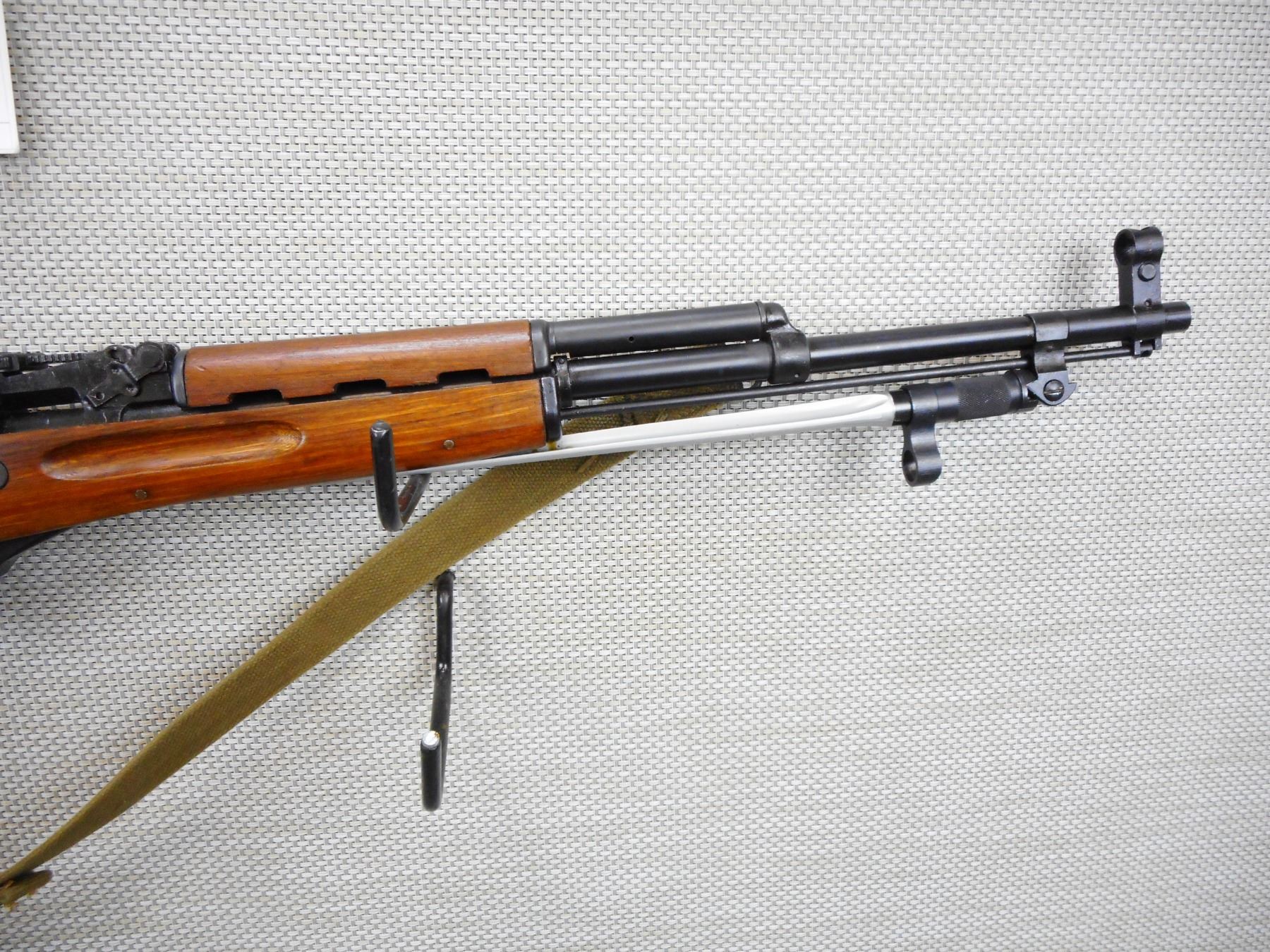 NORINCO , MODEL: SKS , CALIBER: 7.62 X 39 , BOLT AND RECEIVER MATCH BY SERIAL #, VERY GOOD BORE, HOODED FRONT SIGHT AND ADJUSTABLE REAR SIGHT, RETAINS FULL MILITARY CONFIGURATION, SLING SWIVELS WITH CANVAS SLING, SHOWS SOME HANDLING MARKS, STEEL BUTT PLATE, FOLDING SPIKE BAYONET , SERIAL # 1612413 , ACTION: SEMI AUTOMATIC RIFLE , BARREL LENGTH: 20 1/2" , CONDITION: 7/10 , STOCK # 9036 , CLASS: CANADIAN NON RESTRICTED CLASS