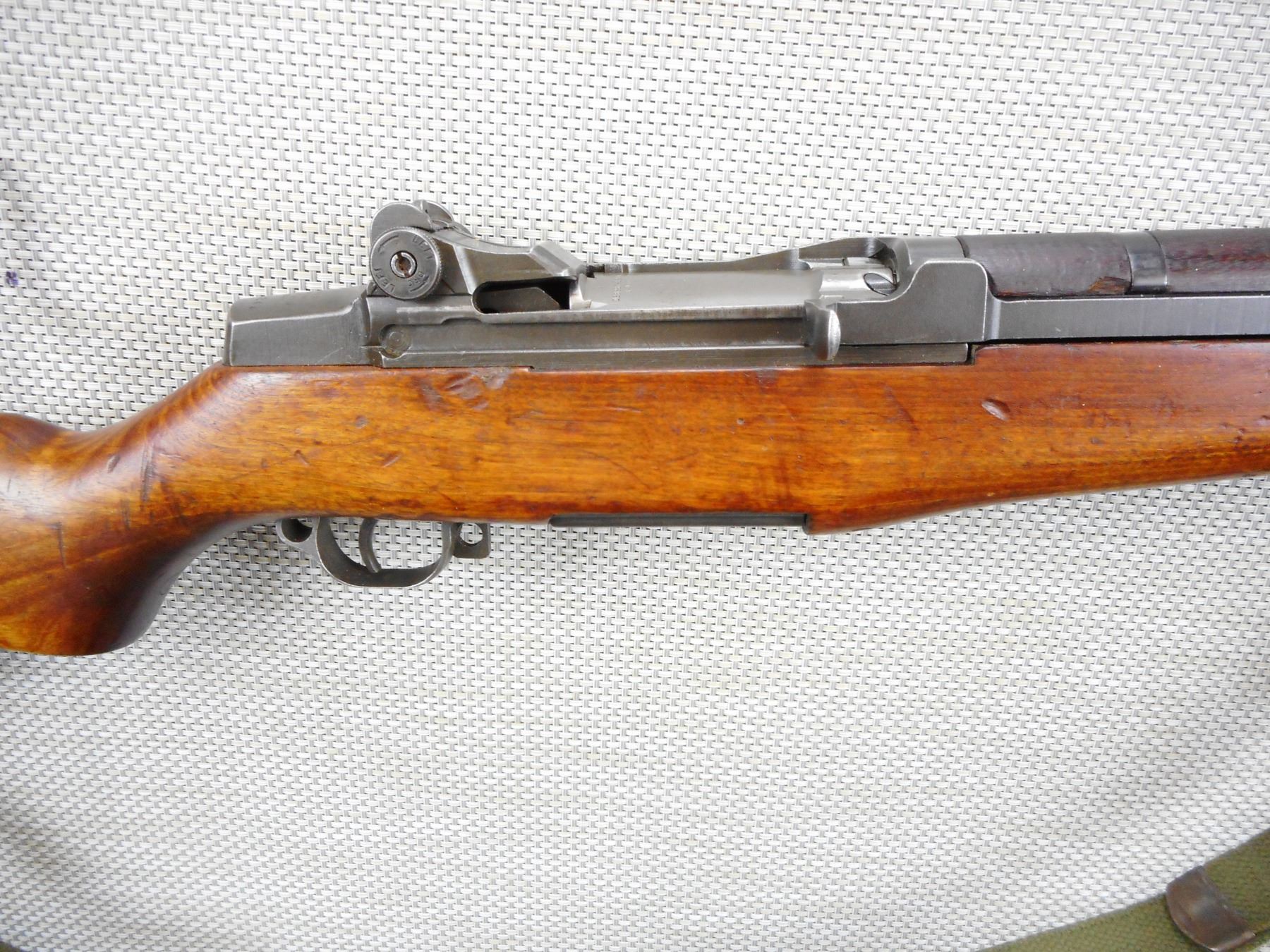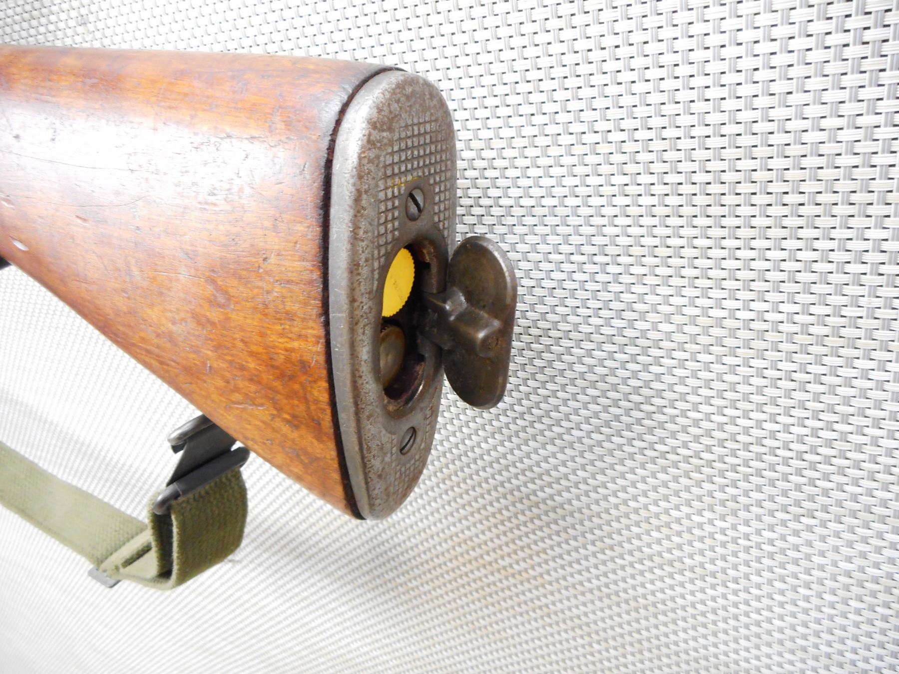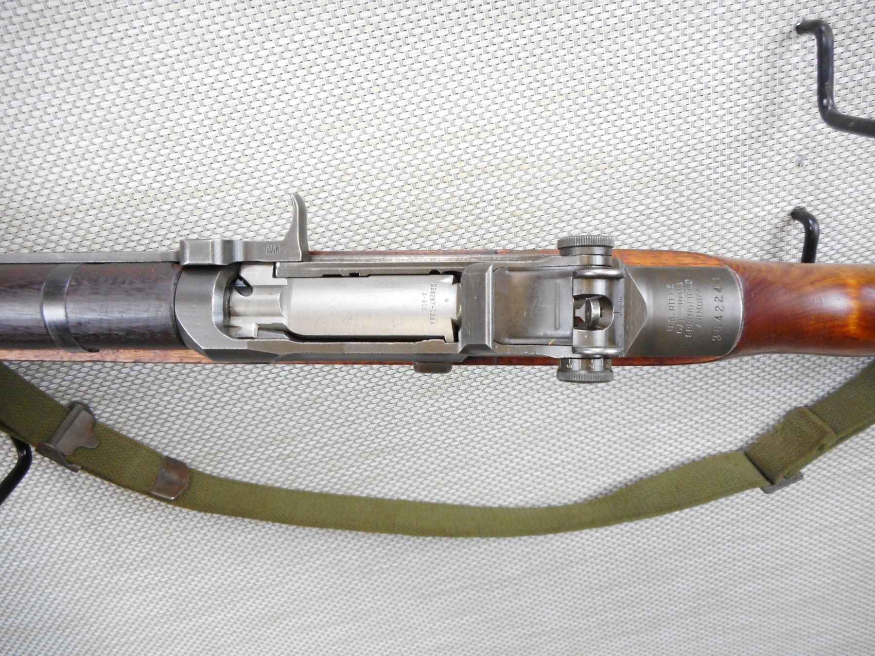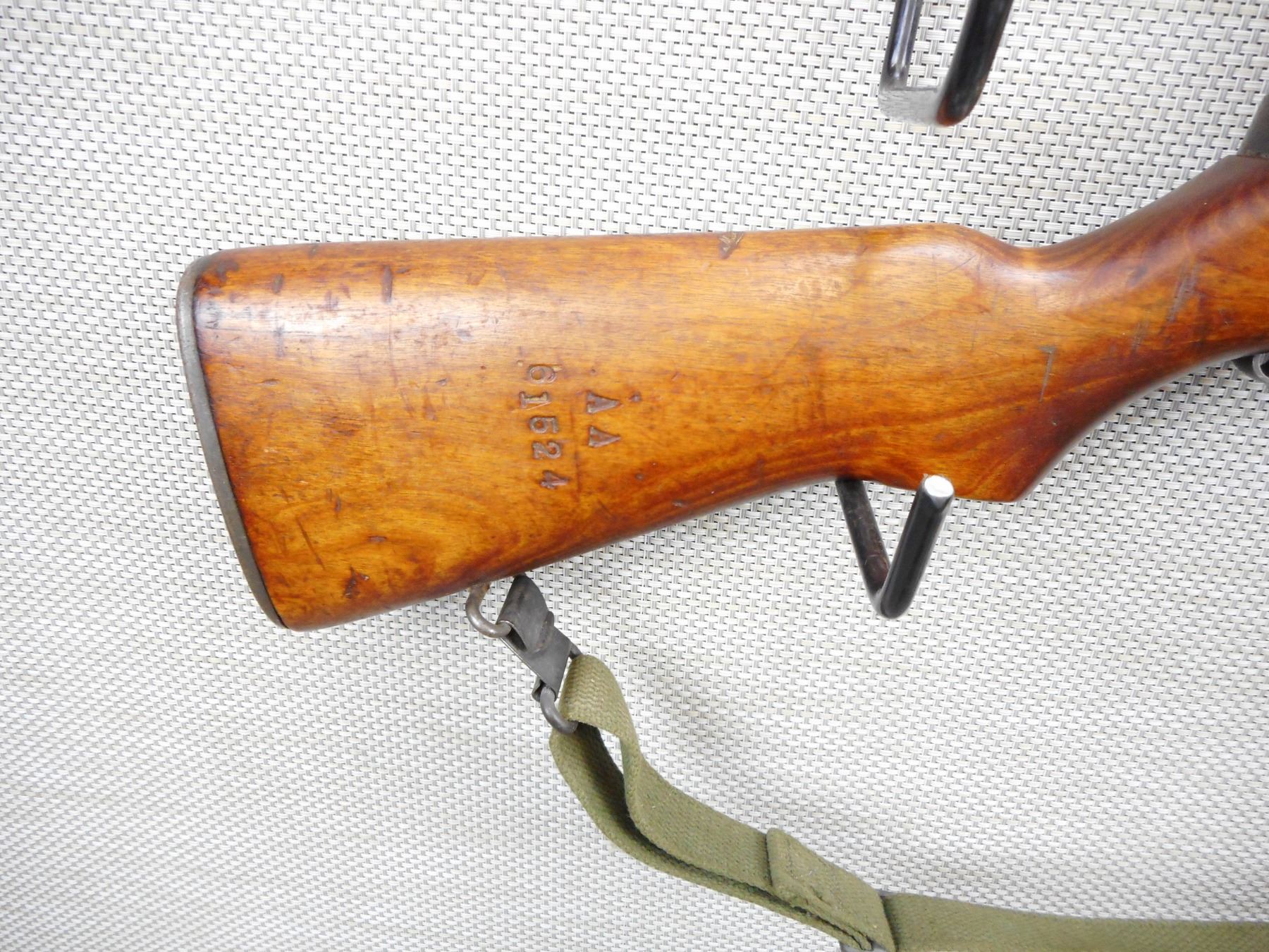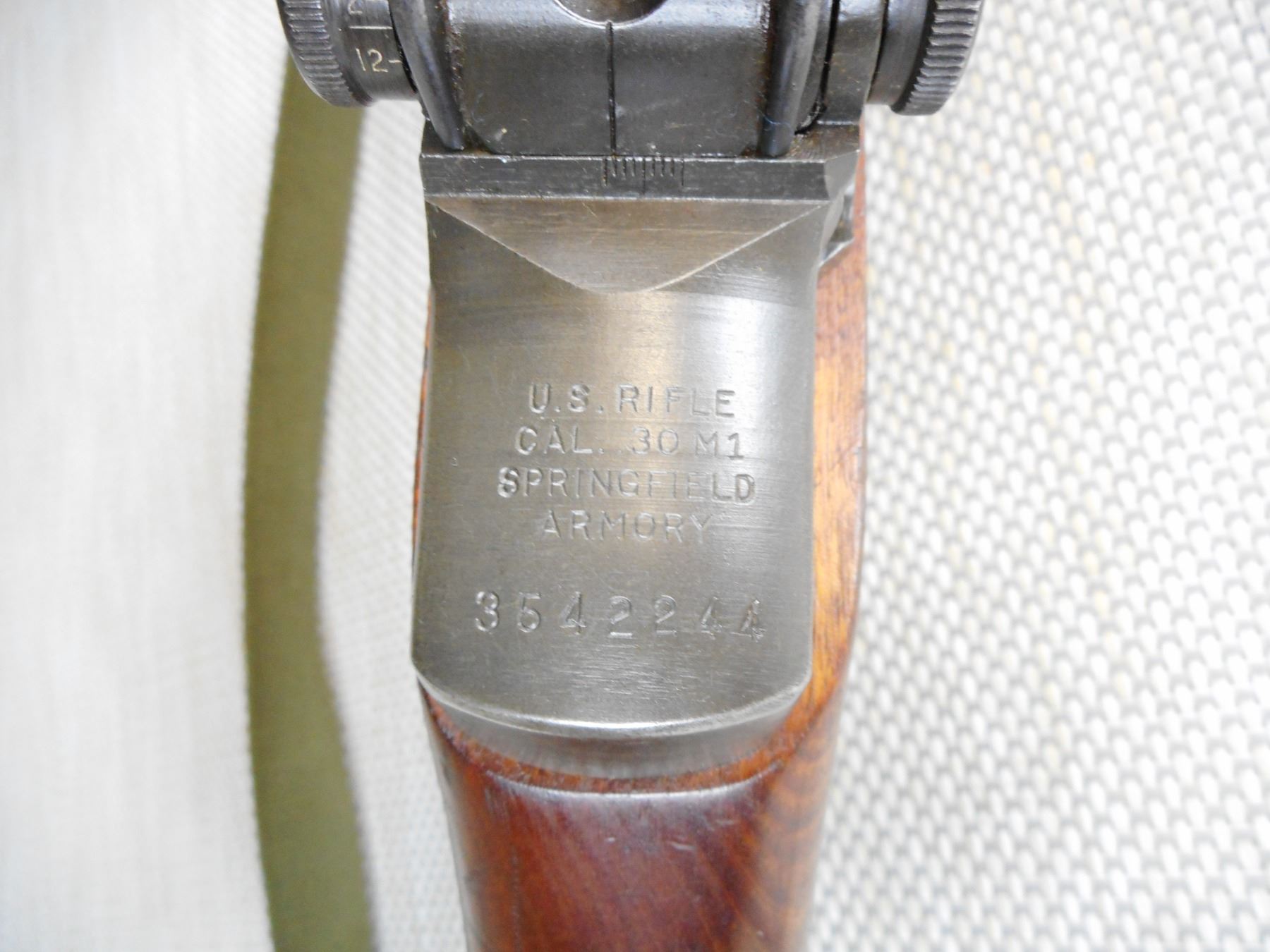 US RIFLE , MODEL: M1 GARAND , CALIBER: 30-06 SPRG , BORE IS EXCELLENT, MADE AT SPRINGFIELD ARMOURY, RETAINS FULL MILITARY CONFIGURATION, BARLEY CORN FRONT AND PEEP APERTURE REAR SIGHTS, WOOD APPEARS TO BE MISMATCHED, SLING SWIVELS WITH CANVAS SLING, SHOWS SOME HANDLING MARKS, CORRECT TRAP DOOR BUTT PLATE , SERIAL # 3542244 , ACTION: SEMI AUTOMATIC RIFLE , BARREL LENGTH: 24" , CONDITION: 7/10 , STOCK # 9057 , CLASS: CANADIAN NON RESTRICTED CLASS