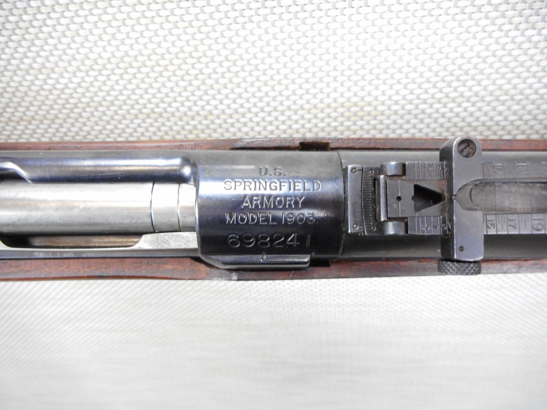 US RIFLE , MODEL: 1903 , CALIBER: 30-06 SPRG , MADE BY SPRINGFIELD ARMOURY, GOOD BORE, RETAINS ORIGINAL MILITARY CONFIGURATION, BLADE FRONT AND ADJUSTABLE REAR SIGHTS, SHOWS VERY LITTLE HANDLING MARKS, STEEL BUTT PLATE, SLING LOOPS , SERIAL # 698241 , ACTION: BOLT ACTION RIFLE , BARREL LENGTH: 24" , CONDITION: 8/10 , STOCK # 9065 , CLASS: CANADIAN NON RESTRICTED CLASS