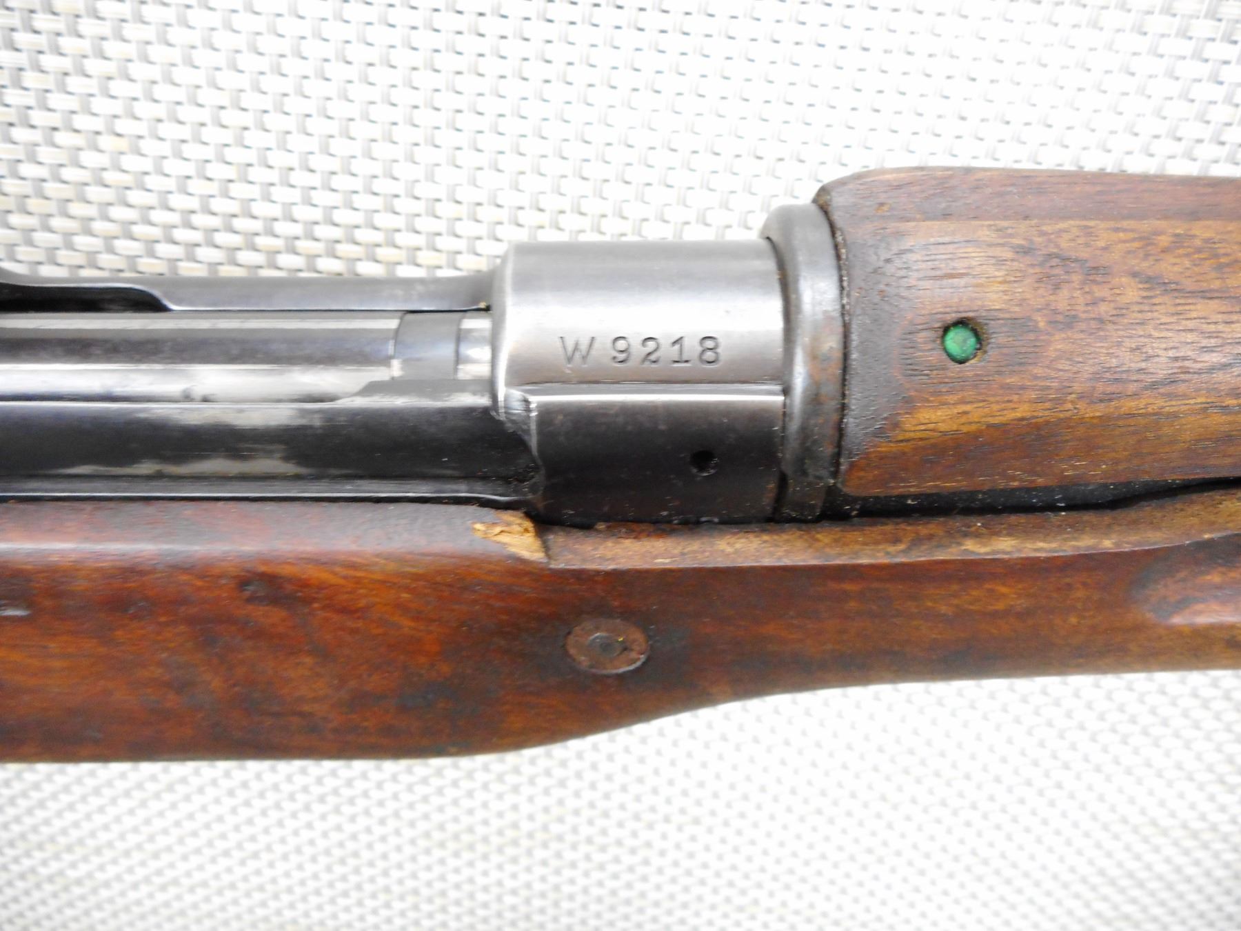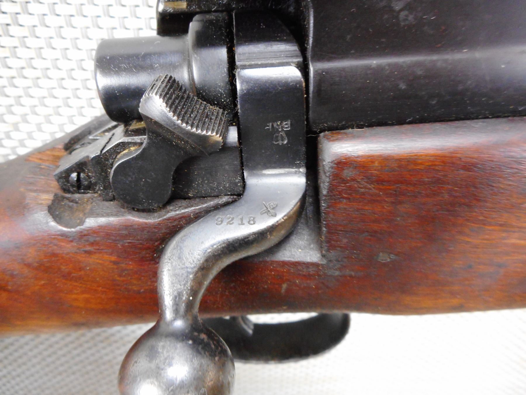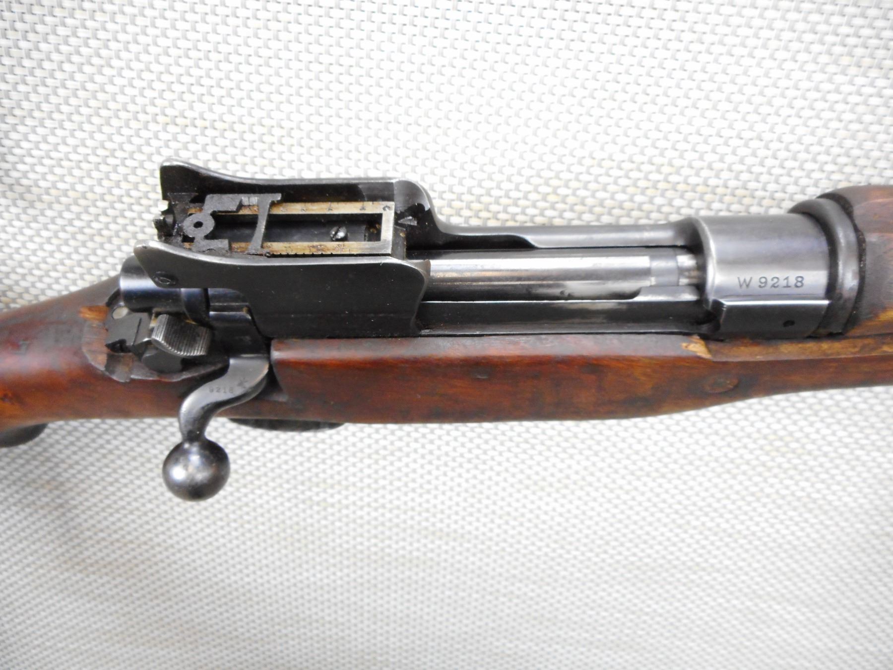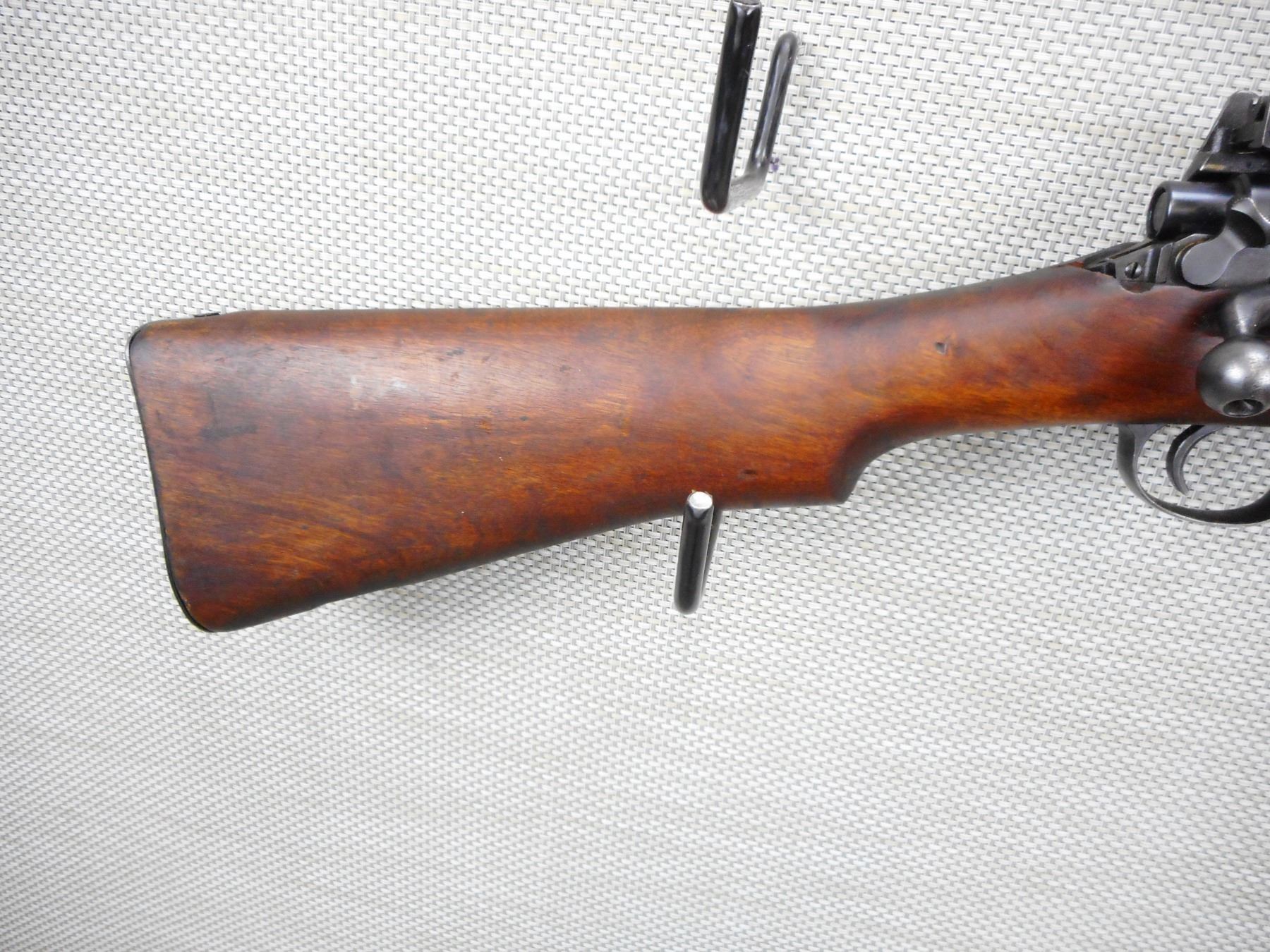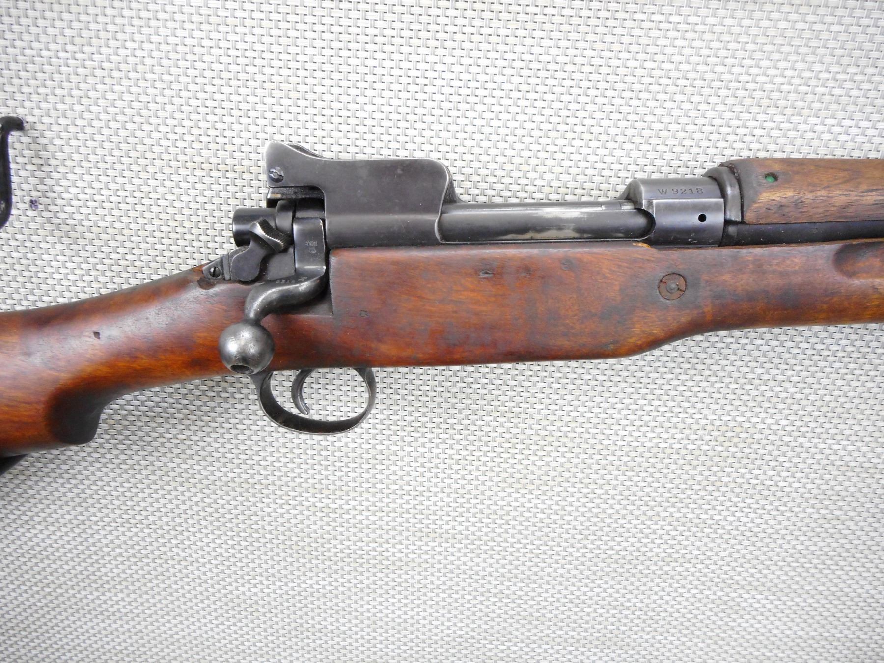 ENFIELD , MODEL: P14 , CALIBER: 303 BR , BOLT AND RECEIVER DON'T MATCH BY SERIAL #, MADE BY WINCHESTER, BORE IS GOOD, BARLEY CORN FRONT AND PEEP APERTURE REAR SIGHT, RETAINS FULL MILITARY CONFIGURATION, SHOWS SOME HANDLING MARKS, SLING SWIVEL LOOPS, STEEL BUTT PLATE, MISSING THE VOLLEY SIGHT, STOCK IS CRACKED AND GOUGED BEHIND THE RECEIVER , SERIAL # W9218 , ACTION: BOLT ACTION RIFLE , BARREL LENGTH: 26" , CONDITION: 6/10 , STOCK # 9070 , CLASS: CANADIAN NON RESTRICTED CLASS