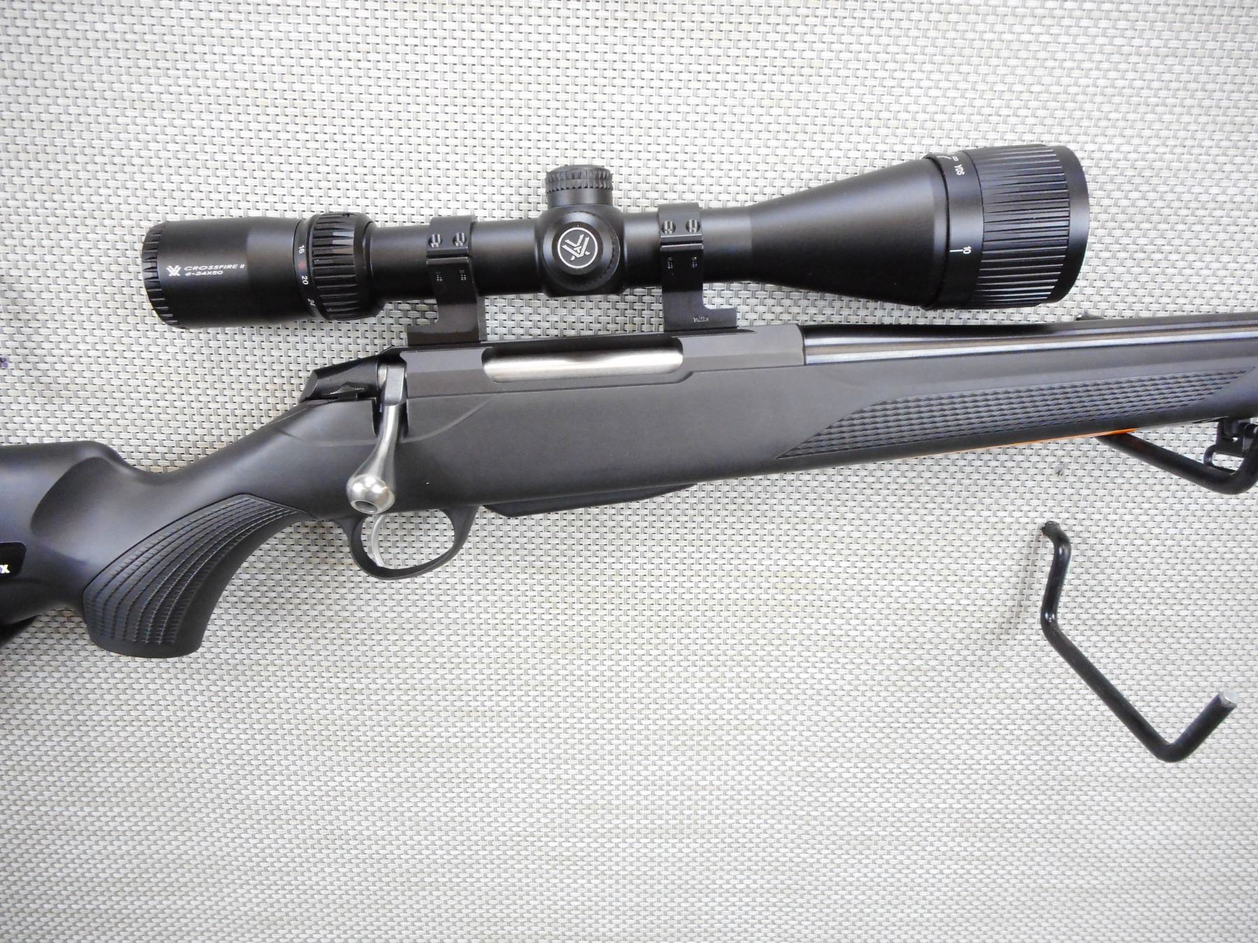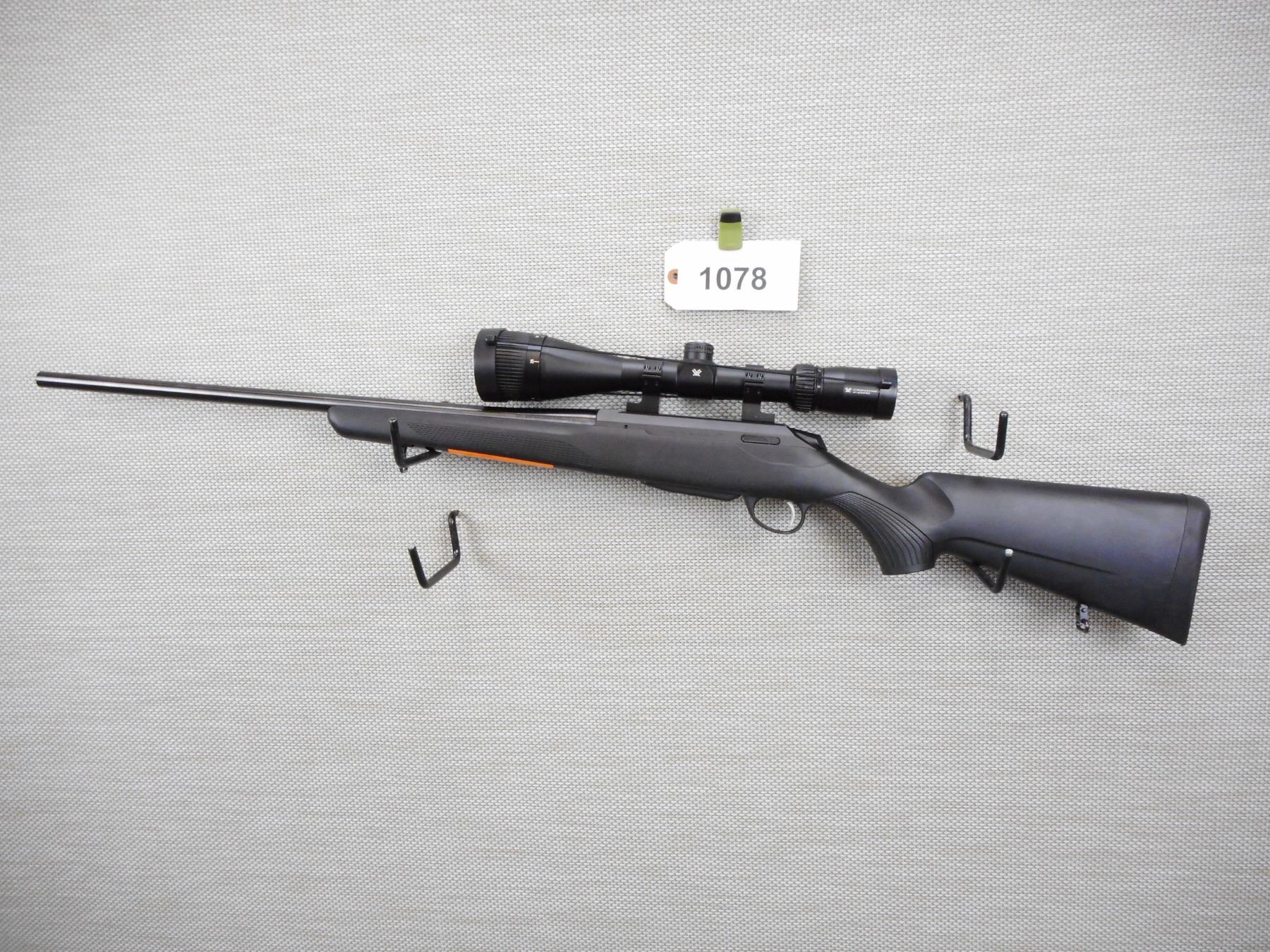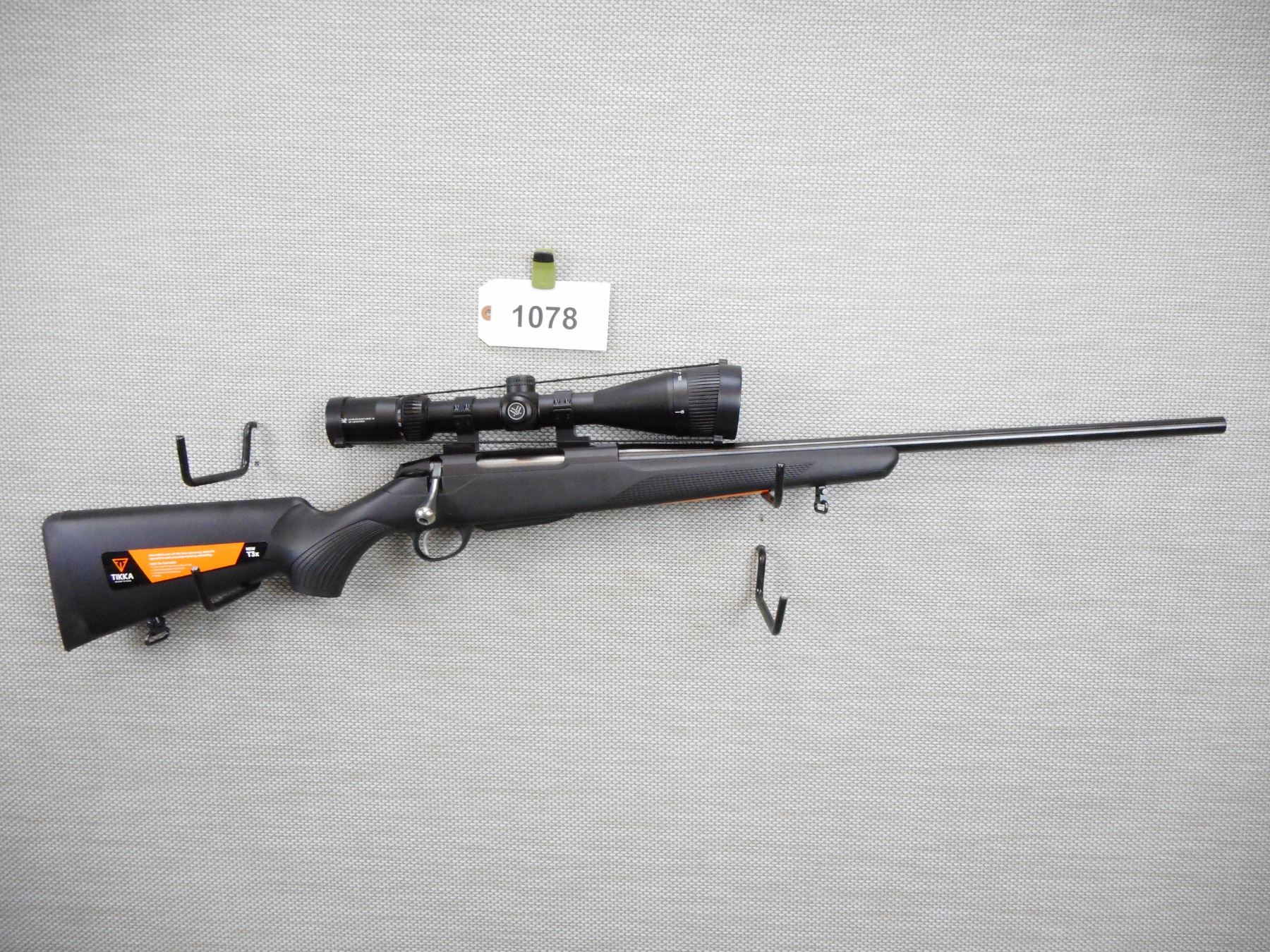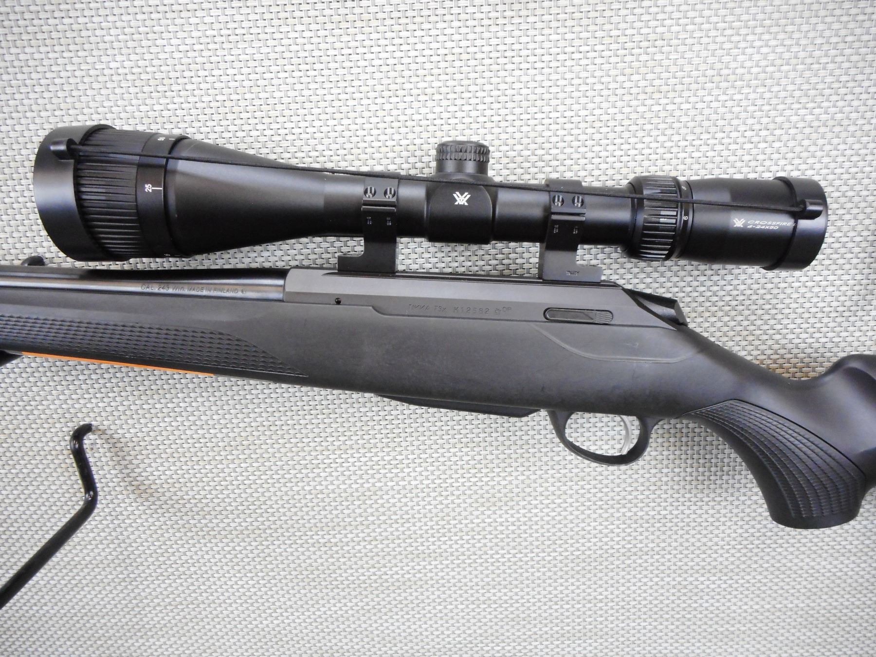 TIKKA , MODEL: T3 LITE , CALIBER: 243 WIN , COMES WITH A MAGAZINE, HAS AN EXCELLENT BORE, HAS A NEW VORTEX CROSSFIRE II SCOPE 6 - 24 X 50, NO SIGHTS, BLACK SYNTHETIC STOCK WITH CAPPED PISTOL GRIP, SLING SWIVEL STUDS, RUBBER RECOIL PAD, SHOWS VERY LITTLE HANDLING MARKS, STILL HAS ORIGINAL STICKERS ON THE STOCK , SERIAL # M12582 , ACTION: BOLT ACTION RIFLE , BARREL LENGTH: 23" , CONDITION: 9/10 , STOCK # 9083 , CLASS: CANADIAN NON RESTRICTED CLASS