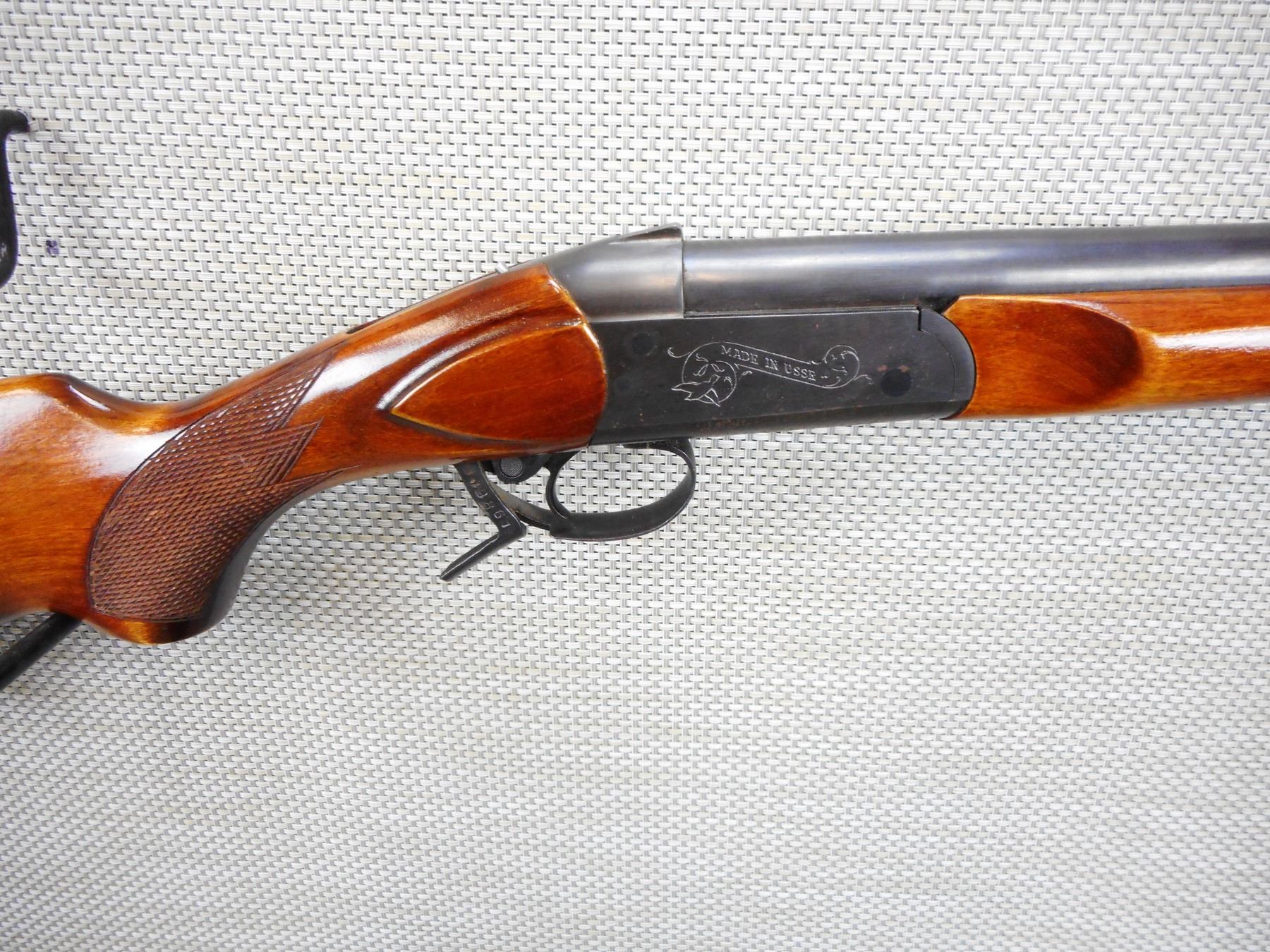 BAIKAL , MODEL: IJ18 , CALIBER: 12GA X 2 3/4" , FIXED FULL CHOKE, BORE IS VERY GOOD, BEAD FRONT SIGHT, TWO PIECE HARDWOOD STOCK WITH CHECKERED SEMI PISTOL GRIP BUTT STOCK, SLING STUDS, PLASTIC BUTT PLATE, SHOWS SOME HANDLING MARKS , SERIAL # A19861 , ACTION: SINGLE SHOT SHOTGUN , BARREL LENGTH: 28 3/4" , CONDITION: 8/10 , STOCK # 9089 , CLASS: CANADIAN NON RESTRICTED CLASS