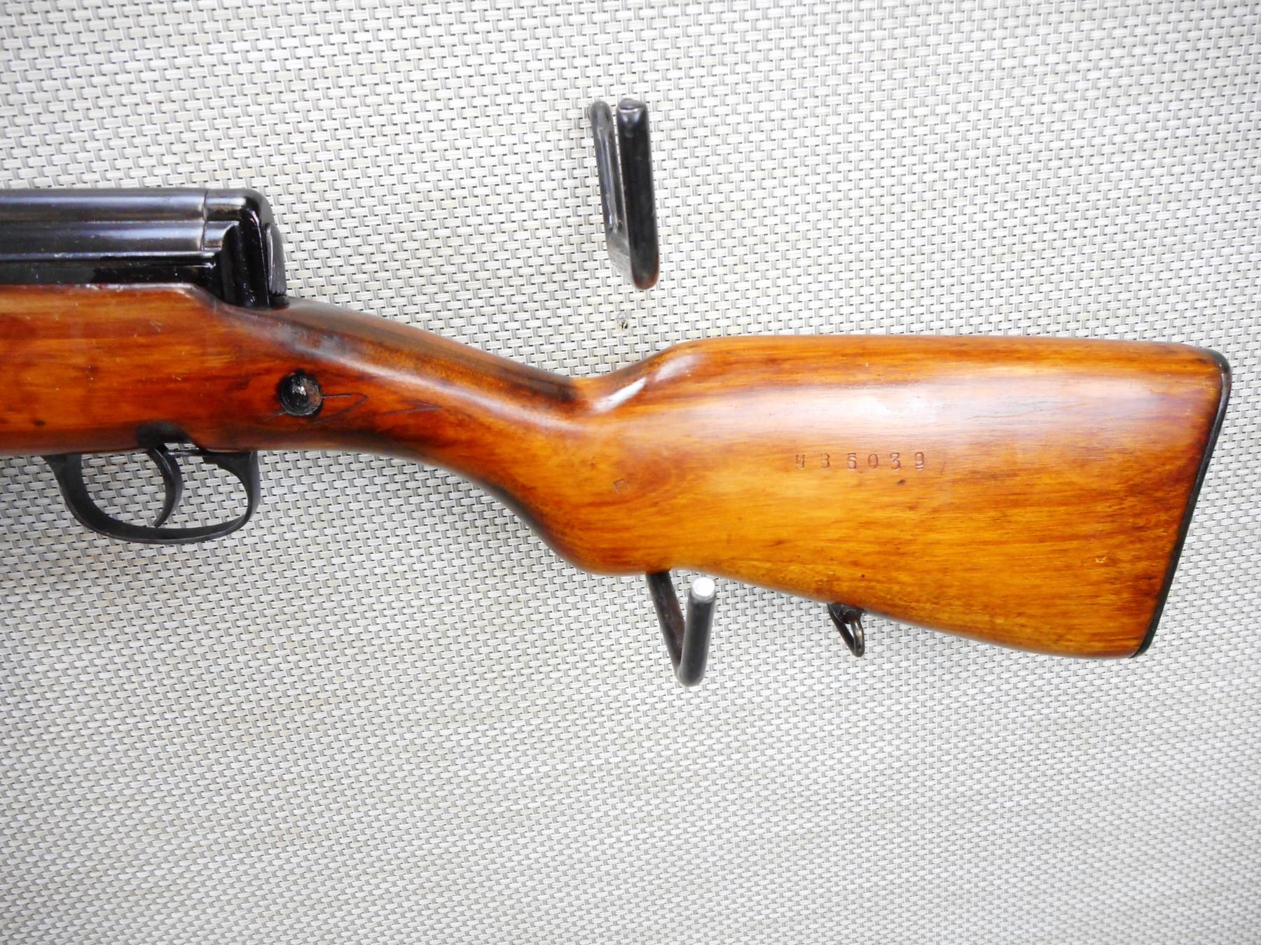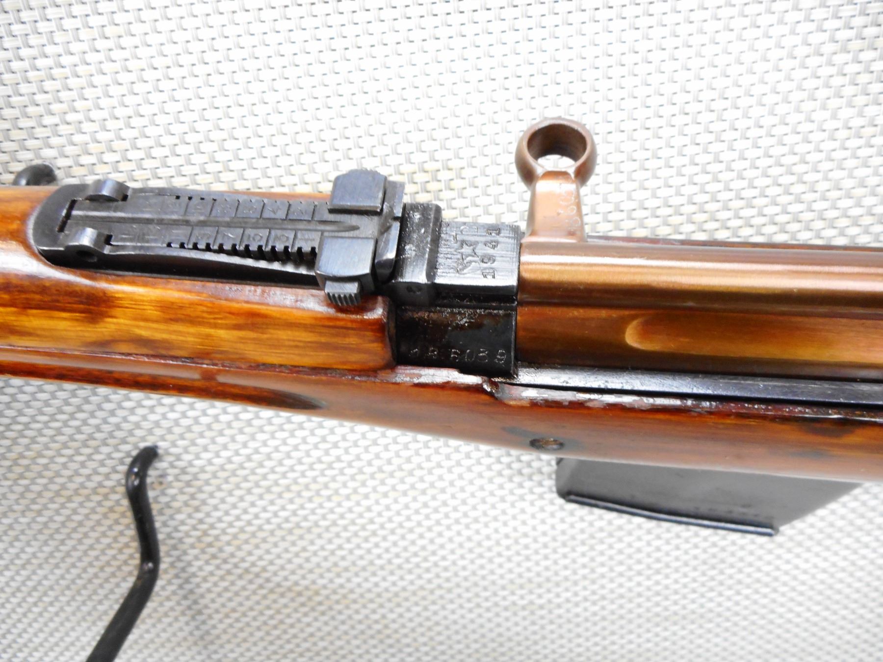 WWII ERA,TOKAREV , MODEL: SVT 40 , CALIBER: 7.62 X 54R , COMES WITH MAGAZINE, WWII ERA, DATED 1941, BORE IS VERY GOOD, HOODED FRONT AND ADJUSTABLE REAR SIGHTS, RETAINS FULL MILITARY CONFIGURATION, STEEL BUTT PLATE, SLING SWIVEL LOOPS, APPEARS TO BE ARSENAL REFINISHED, SHOWS SOME HANDLING MARKS , SERIAL # HB6039 , ACTION: BOLT ACTION RIFLE , BARREL LENGTH: 25" , CONDITION: 7/10 , STOCK # 9095 , CLASS: CANADIAN NON RESTRICTED CLASS