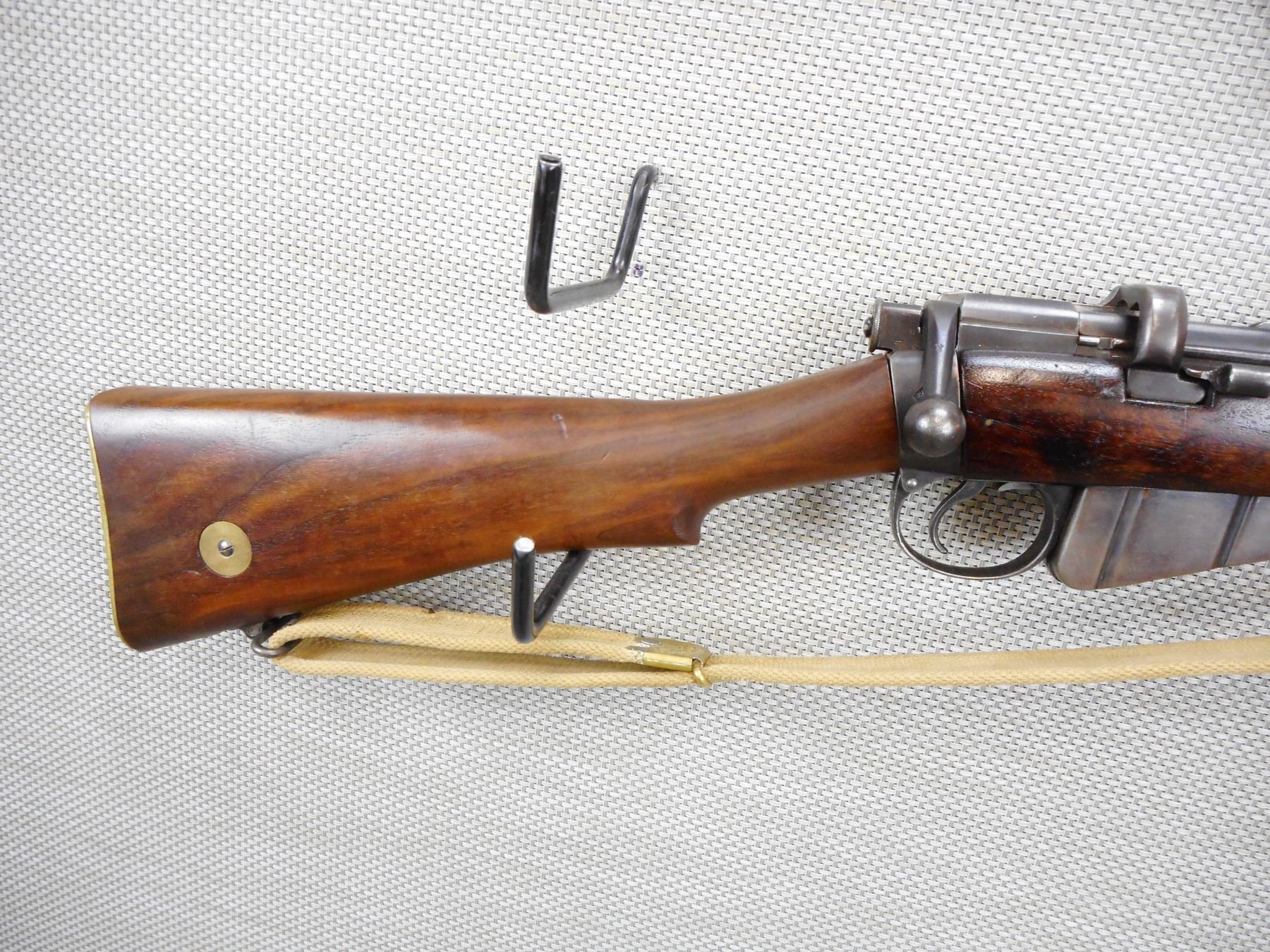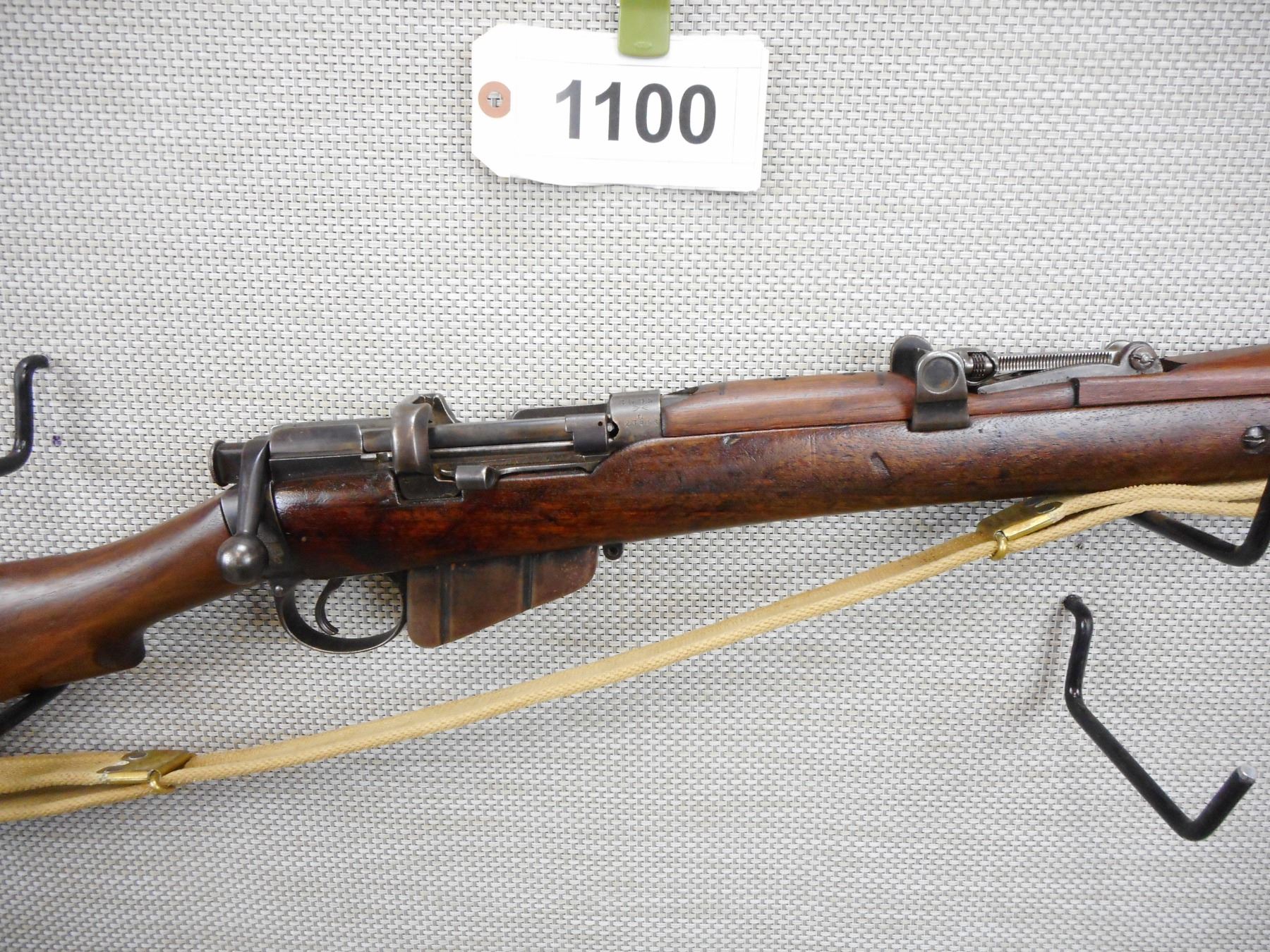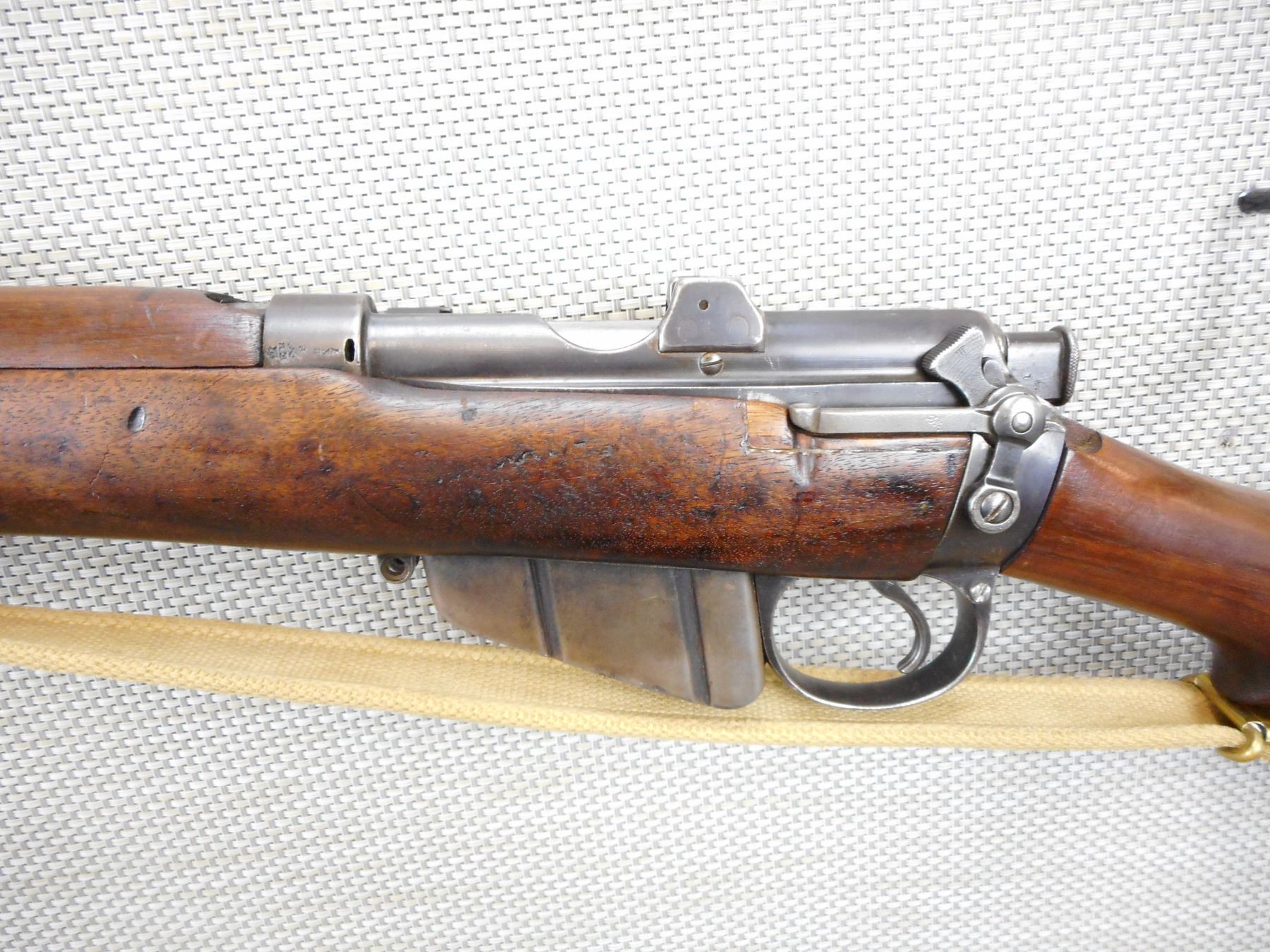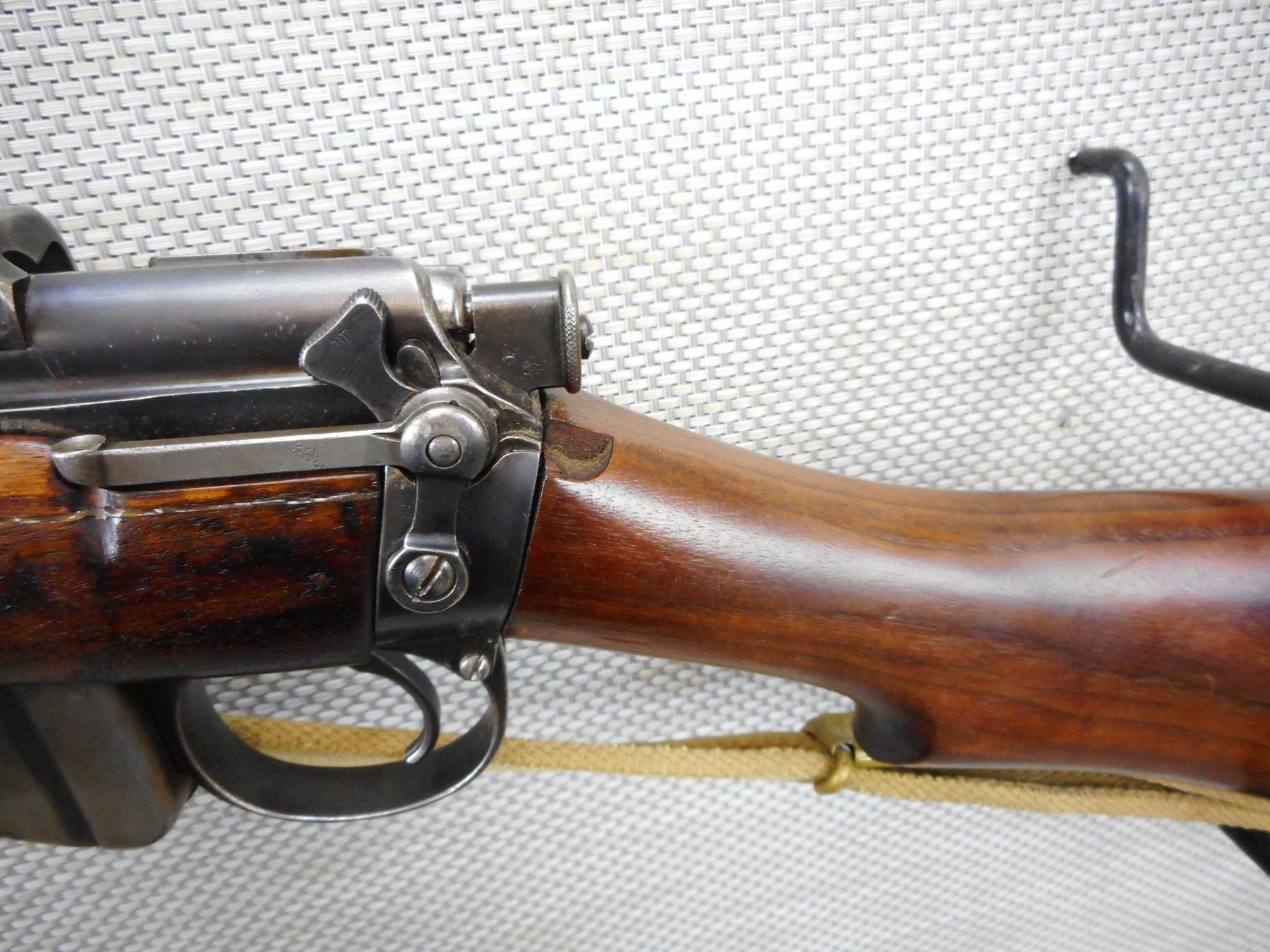 PRE WWI ERA, LEE ENFIELD , MODEL: NO 1 MKIII , CALIBER: 303 BR , COMES WITH MAGAZINE, PRE WWI ERA, DATED 1910, BOLT AND RECEIVER DON'T MATCH BY SERIAL#, RETAINS FULL MILITARY CONFIGURATION, RETAINS RARE VOLLEY SIGHT AND HAS A MAGAZINE CUTOFF, BARLEY CORN FRONT AND ADJUSTABLE REAR SIGHTS, BRASS BUTT PLATE, SLING SWIVELS WITH ORIGINAL CANVAS SLING, MARKED SA ON THE RECEIVER WITH OUT OF SERVICE MARKINGS, STOCK HAS BEEN ARSENAL REPAIRED, SHOWS SOME HANDLING MARKS , SERIAL # L23946 , ACTION: BOLT ACTION RIFLE , BARREL LENGTH: 25" , CONDITION: 6/10 , STOCK # 9105 , CLASS: CANADIAN NON RESTRICTED CLASS