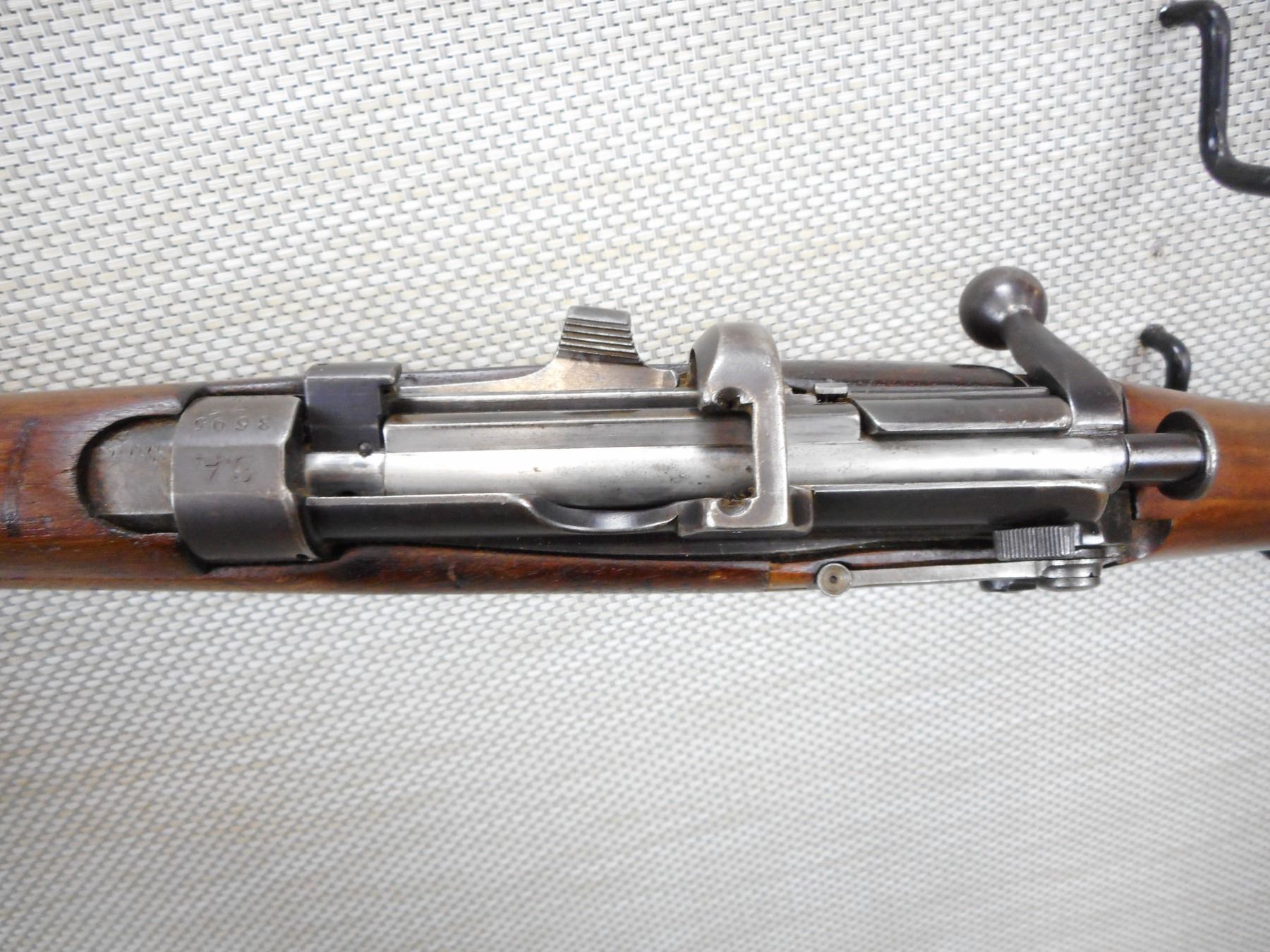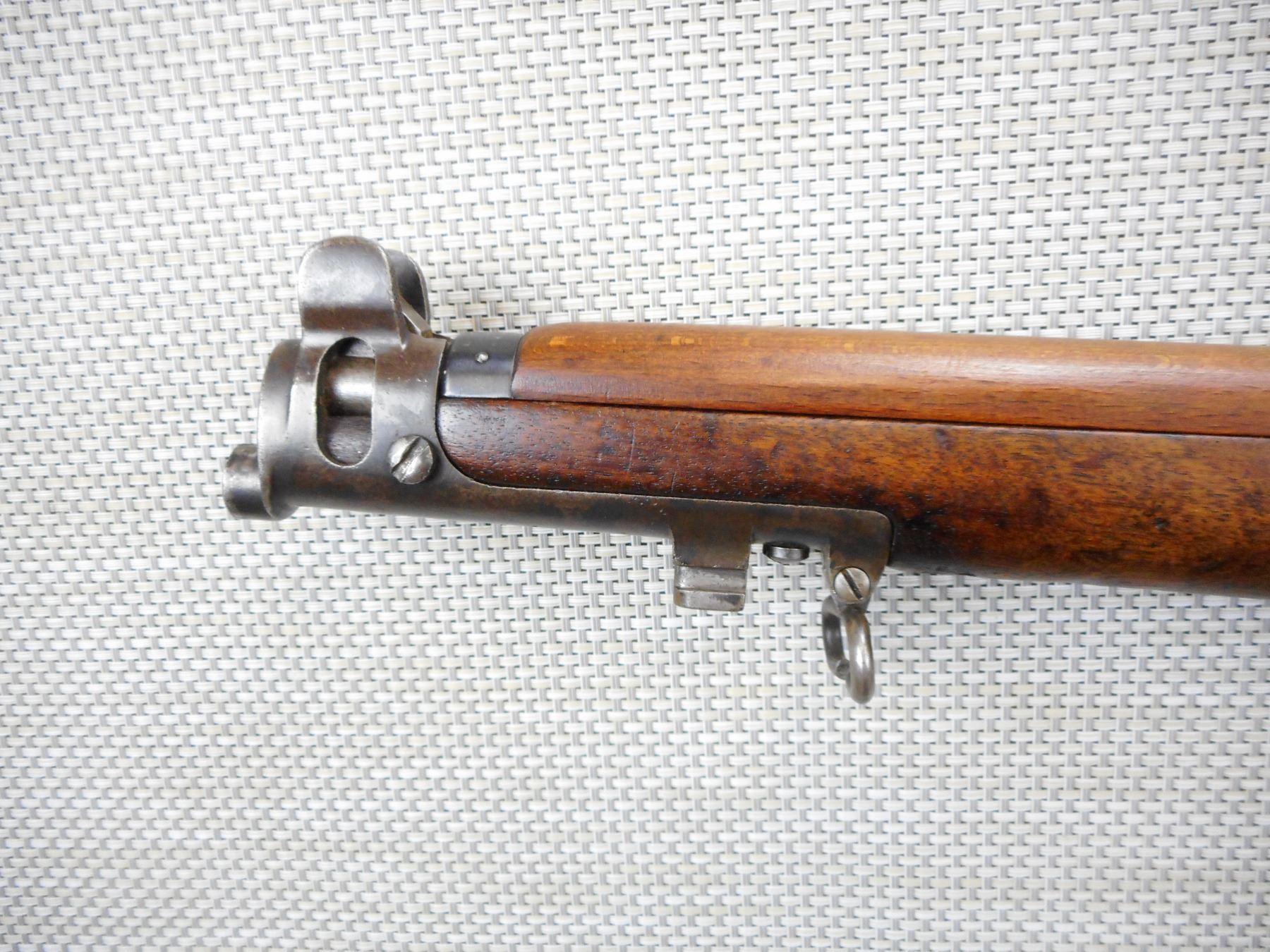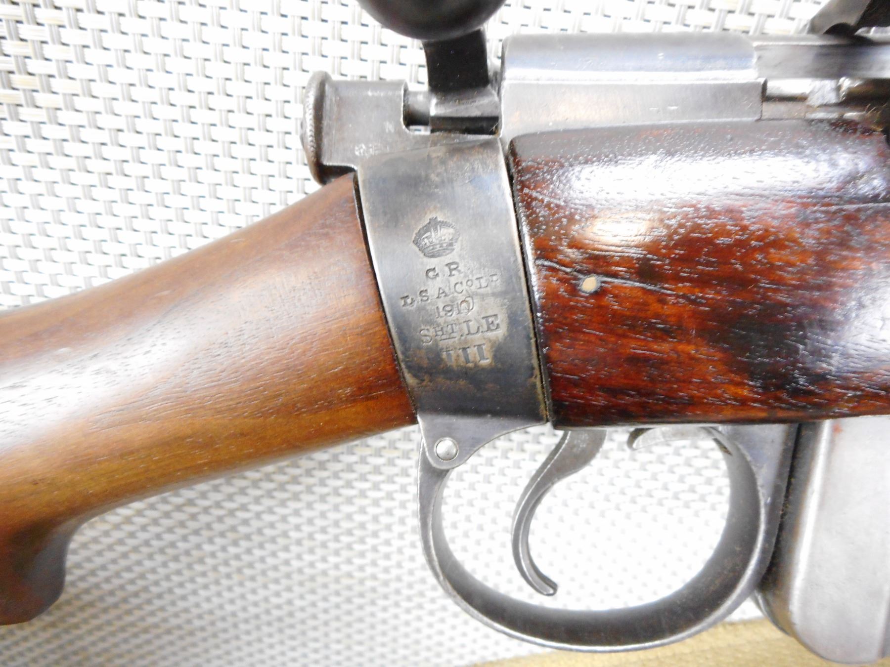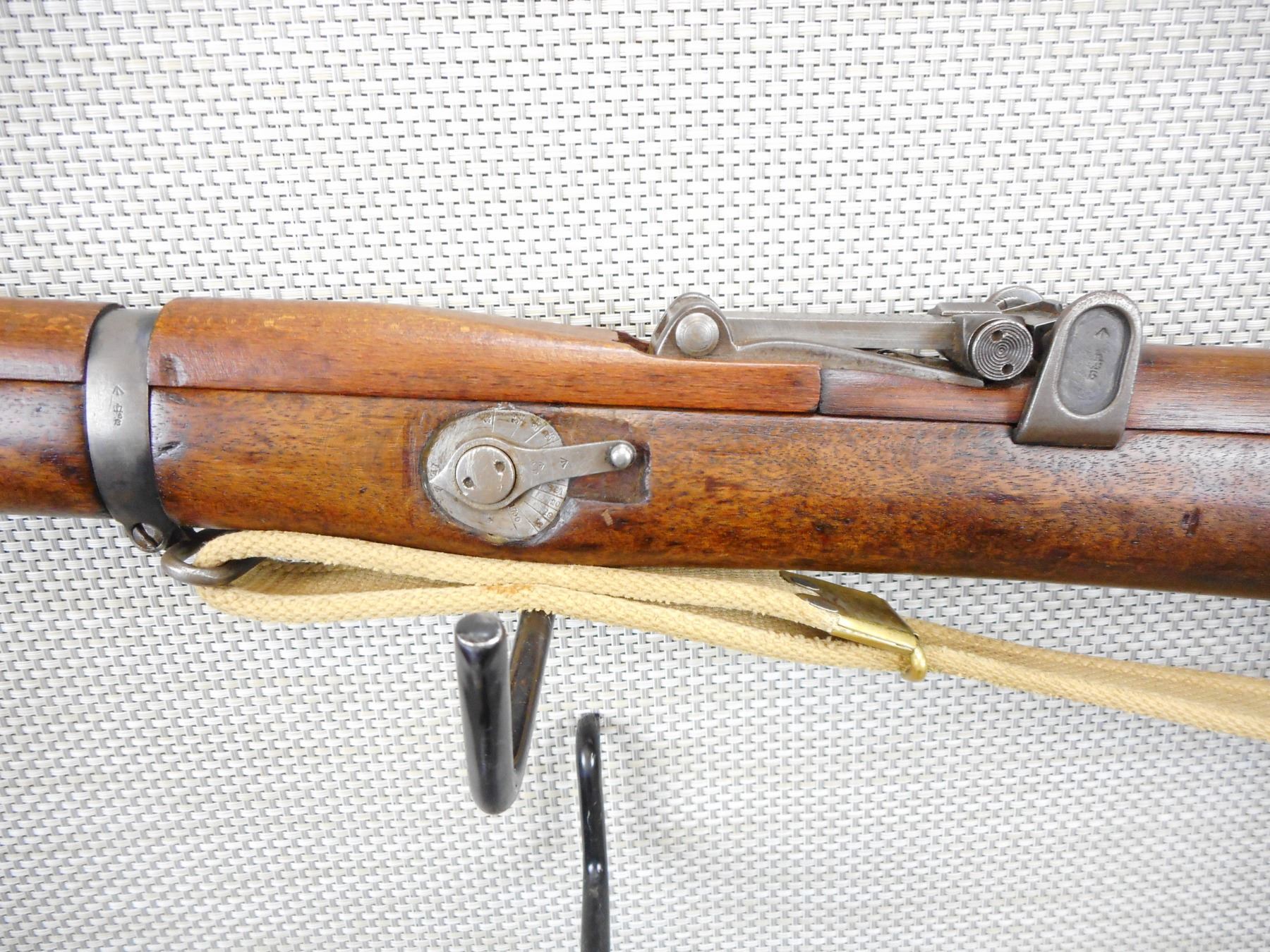 PRE WWI ERA, LEE ENFIELD , MODEL: NO 1 MKIII , CALIBER: 303 BR , COMES WITH MAGAZINE, PRE WWI ERA, DATED 1910, BOLT AND RECEIVER DON'T MATCH BY SERIAL#, RETAINS FULL MILITARY CONFIGURATION, RETAINS RARE VOLLEY SIGHT AND HAS A MAGAZINE CUTOFF, BARLEY CORN FRONT AND ADJUSTABLE REAR SIGHTS, BRASS BUTT PLATE, SLING SWIVELS WITH ORIGINAL CANVAS SLING, MARKED SA ON THE RECEIVER WITH OUT OF SERVICE MARKINGS, STOCK HAS BEEN ARSENAL REPAIRED, SHOWS SOME HANDLING MARKS , SERIAL # L23946 , ACTION: BOLT ACTION RIFLE , BARREL LENGTH: 25" , CONDITION: 6/10 , STOCK # 9105 , CLASS: CANADIAN NON RESTRICTED CLASS
