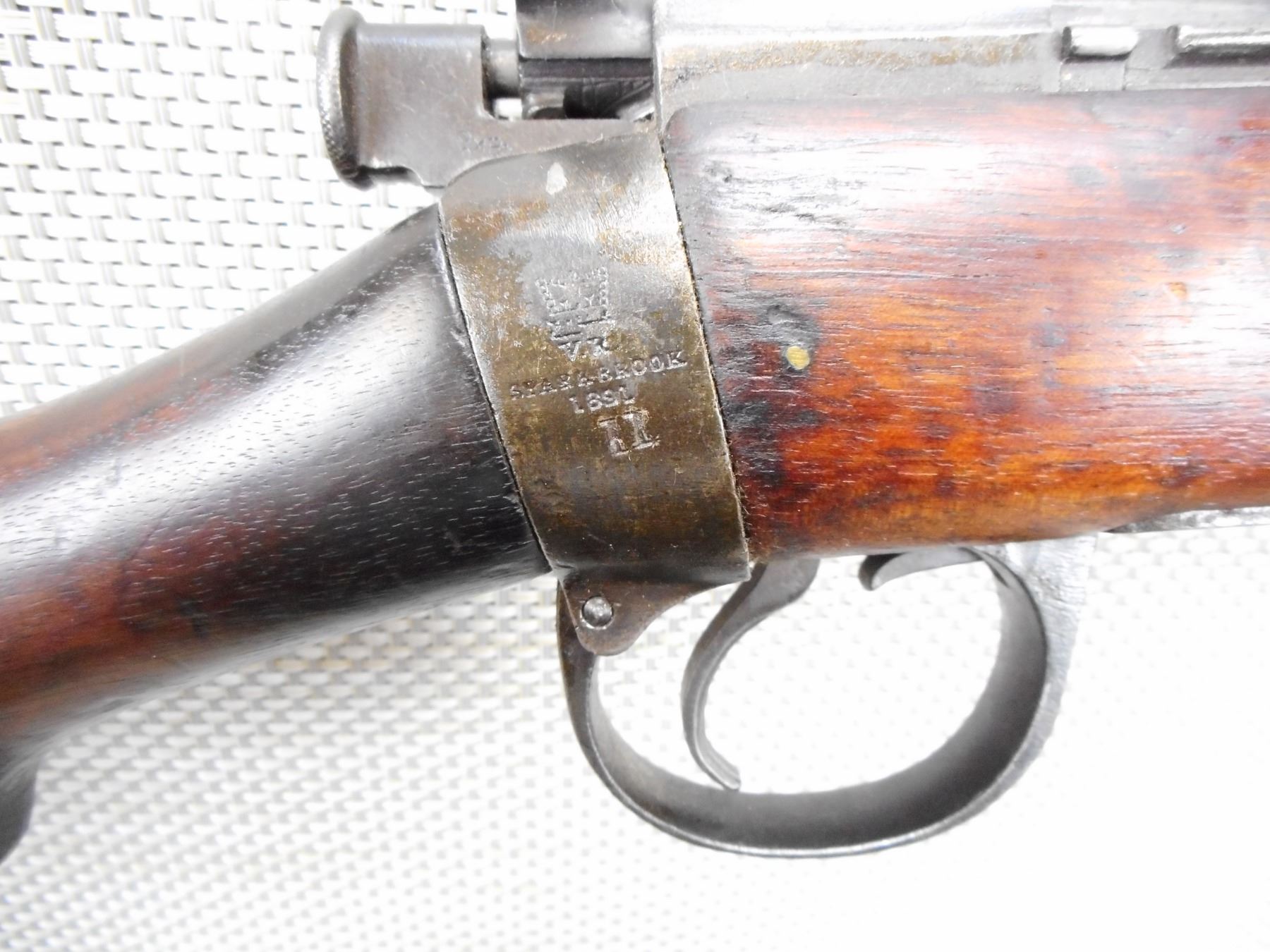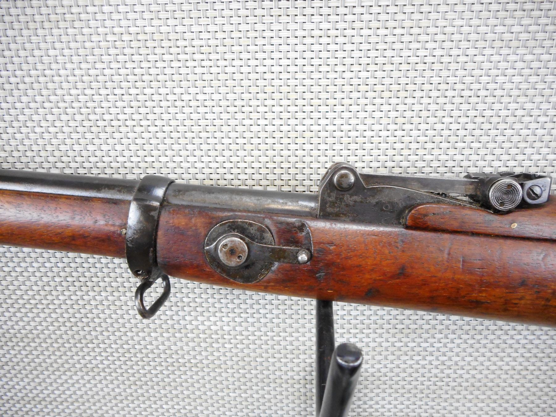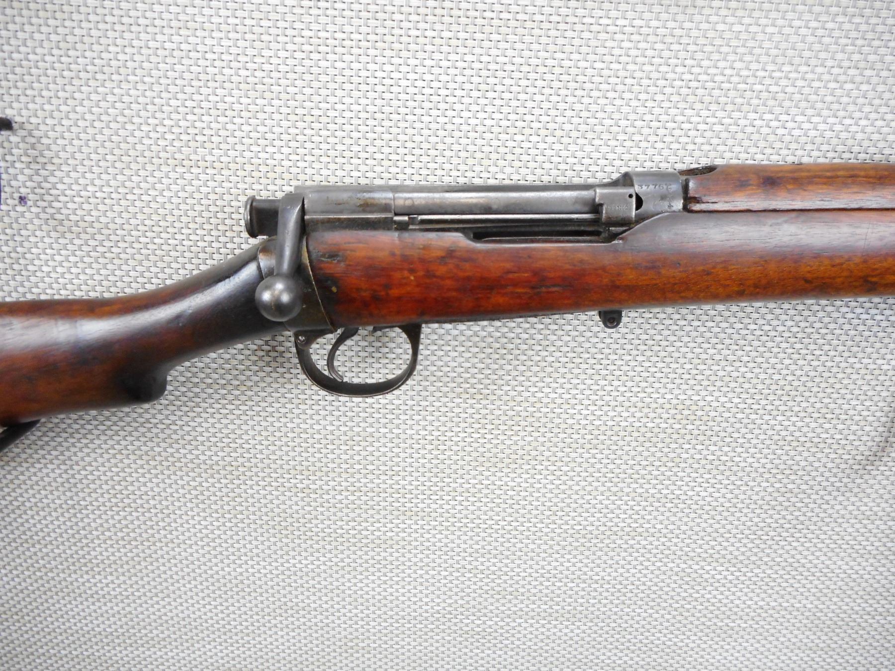 EXTREMLEY RARE, LEE ENFIELD , MODEL: SPARKSBROOK TRAINING RIFLE , CALIBER: 22 LR , DOES NOT COME WITH MAGAZINE ( IT IS NOT REQUIRED TO FIRE THIS IS A SINGLE SHOT) DATED 1891, BARLEY CORN FRONT AND ADJUSTABLE REAR SIGHT, BOLT AND RECEIVER MATCH BY SERIAL #, BORE IS VERY GOOD, ORIGINAL VOLLY SIGHTS, OUT OF SERVICE BRD ARROW MARKS, SHOWS SOME HANDLING MARKS, SLING SWIVEL LOOPS, BRASS BUTT PLATE , SERIAL # 3776 , ACTION: BOLT ACTION RIFLE , BARREL LENGTH: 25" , CONDITION: 6/10 , STOCK # 9107 , CLASS: CANADIAN NON RESTRICTED CLASS