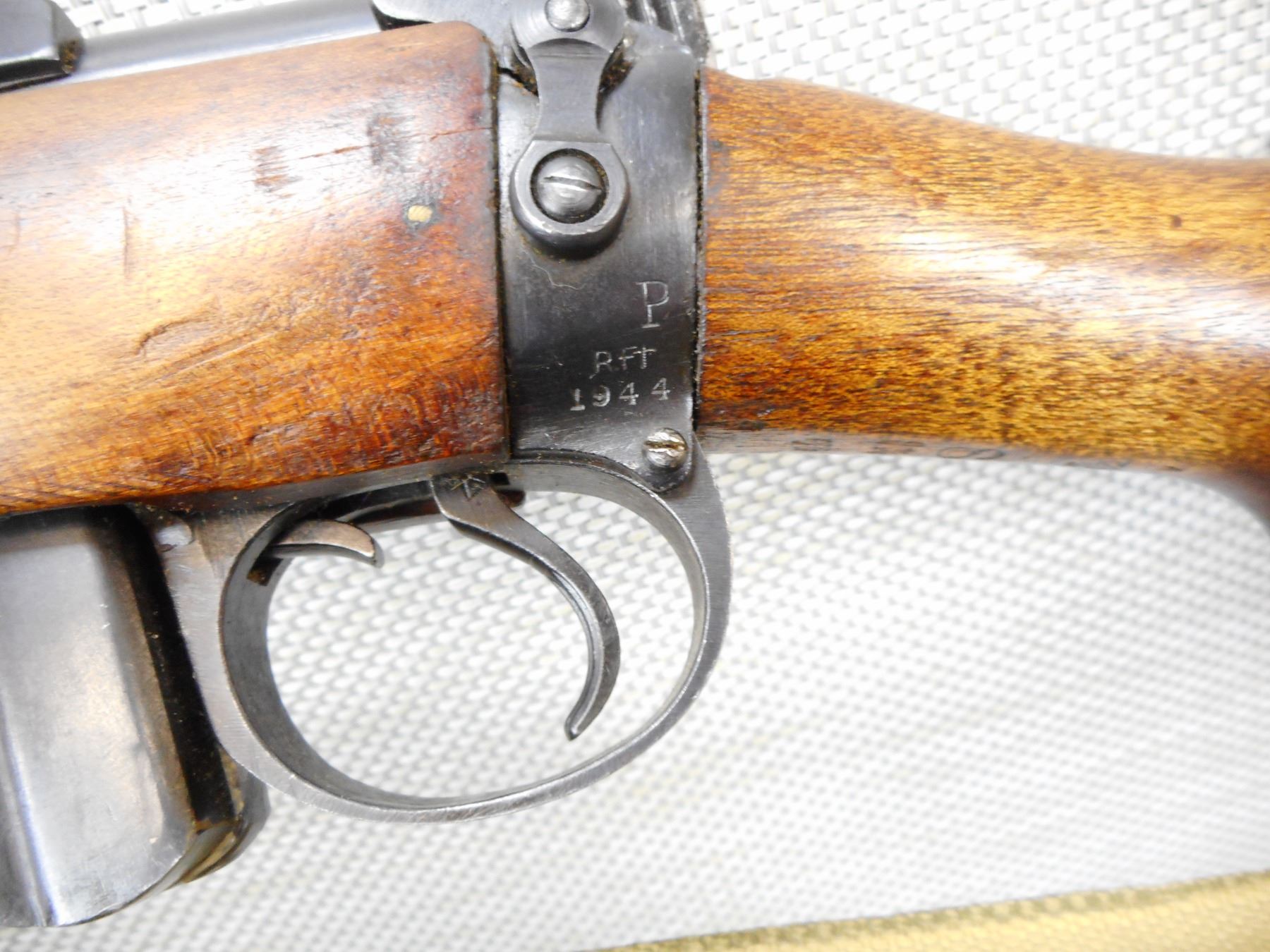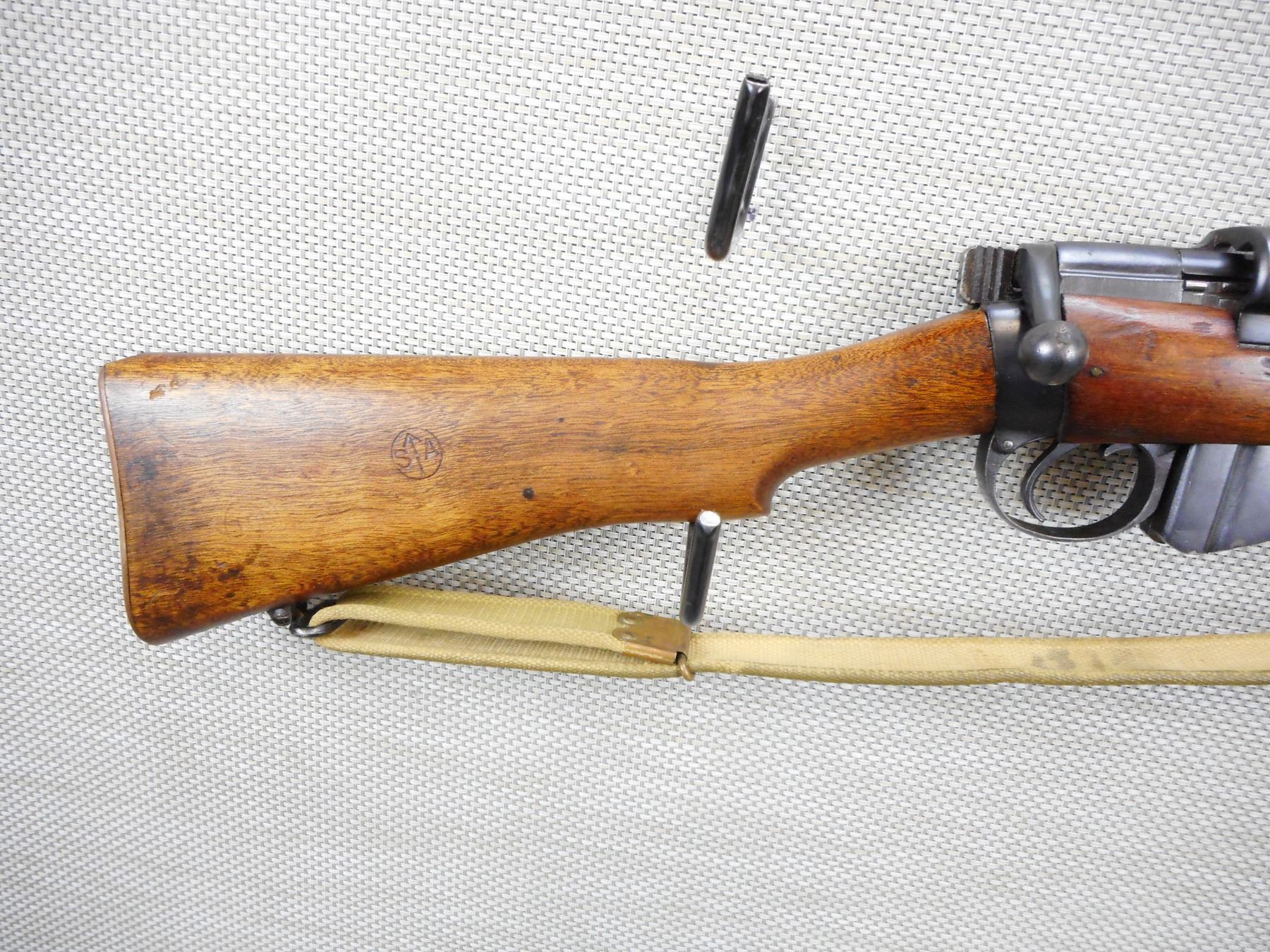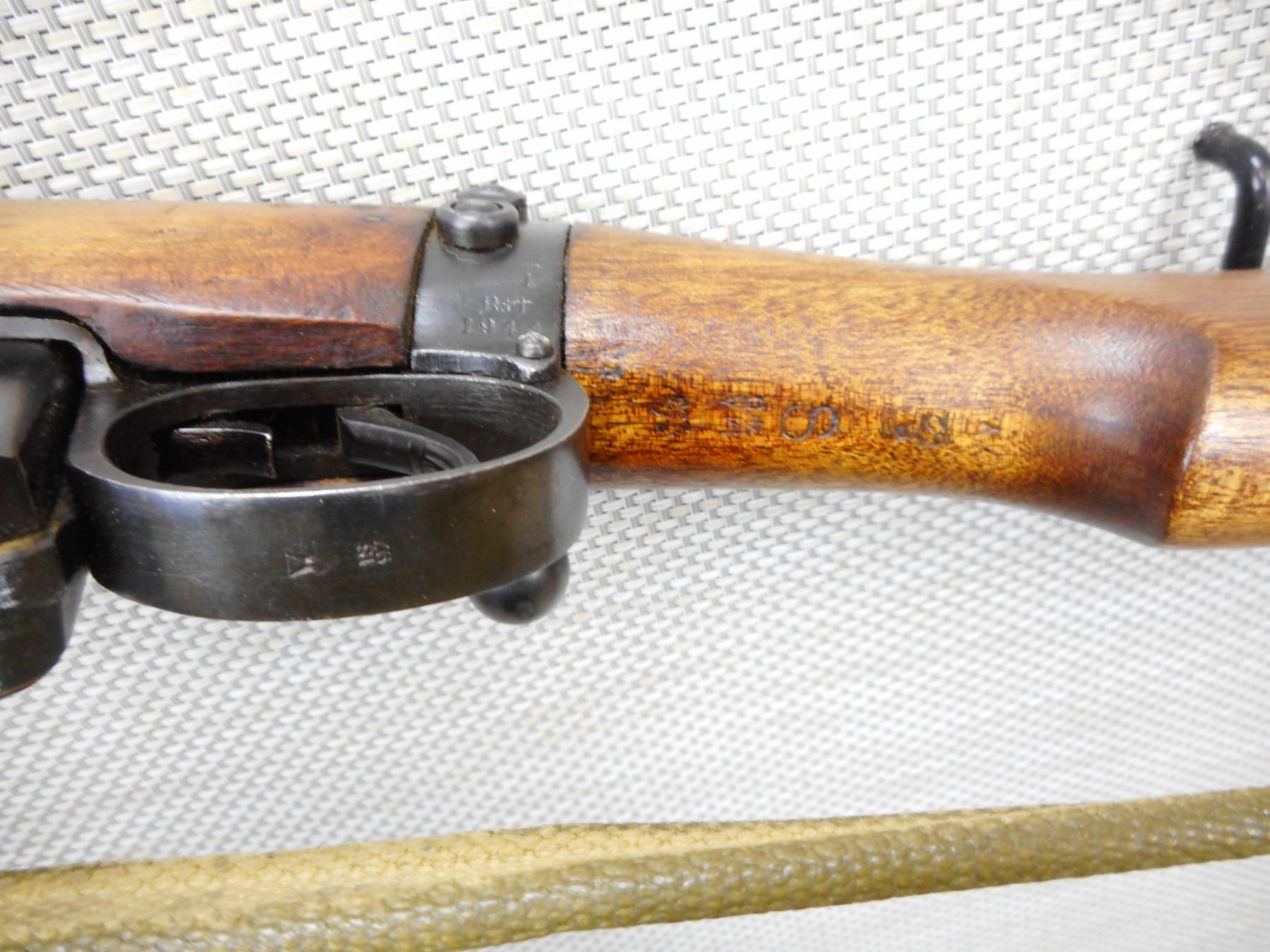 WWII ERA, LEE ENFIELD , MODEL: NO1 MKIII ( MARKINGS REMOVED) , CALIBER: 303 BR , COMES WITH MAGAZINE, DATED 1944 WWII ERA, BOLT AND RECEIVER MATCH BY SERIAL #, VERY GOOD BORE, BARLEY CORN FRONT AND ADJUSTABLE REAR SIGHTS, SLING SWIVELS WITH ORIGINAL CANVAS SLING, BRASS BUTT PLATE, NUMEROUS REGIMENTAL MARKINGS ON THE STOCK , SERIAL # 33127R , ACTION: BOLT ACTION RIFLE , BARREL LENGTH: 25" , CONDITION: 7/10 , STOCK # 9108 , CLASS: CANADIAN NON RESTRICTED CLASS
