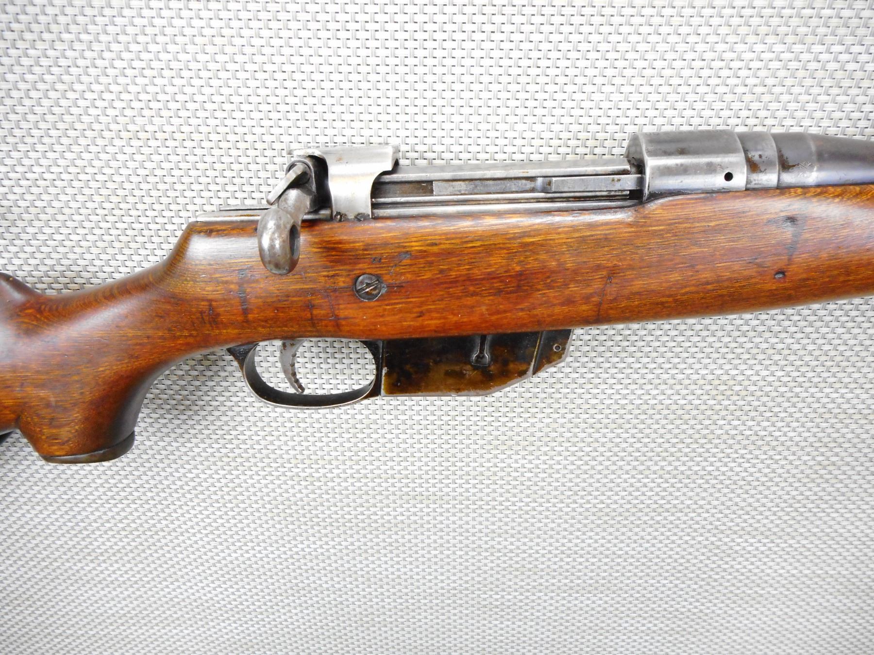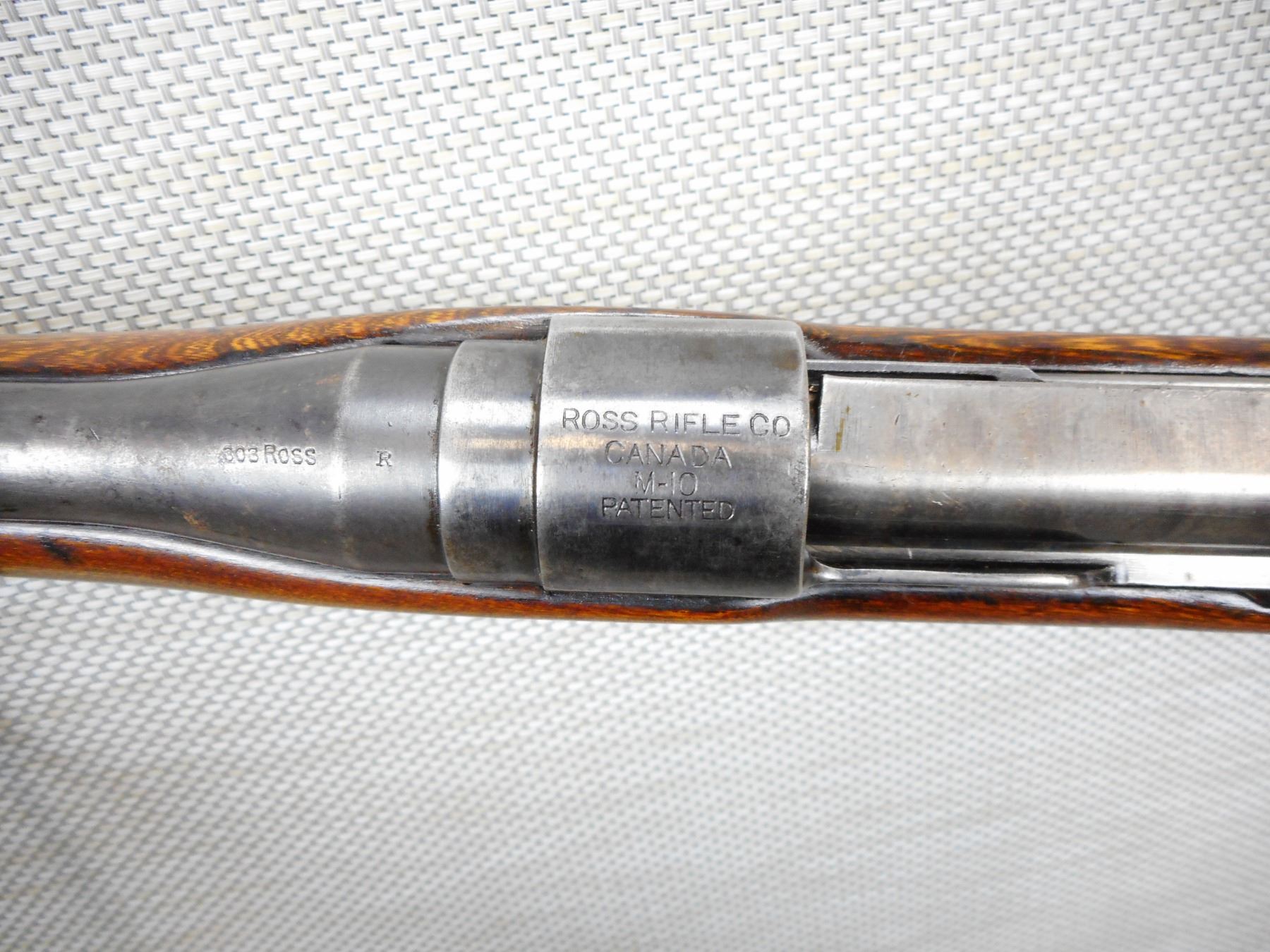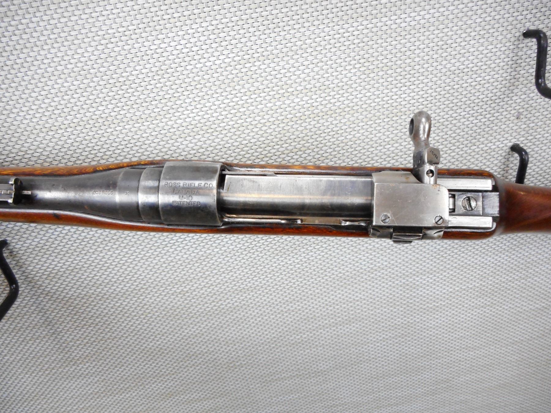 ROSS , MODEL: M10 SPORTER , CALIBER: 303 BR , BORE IS GOOD, BLADE FRONT AND ADJUSTABLE REAR SIGHT, MISSING THE ORIGINAL PEEP SIGHTS, SHOWS SOME HANDLING MARKS, SLING SWIVEL LOOPS, REPLACEMENT WINCHESTER BUTT PLATE THAT DOESN'T FIT WELL WITH WOOD FILLER IN GAP , SERIAL # N/A , ACTION: BOLT ACTION RIFLE , BARREL LENGTH: 27" , CONDITION: 5/10 , STOCK # 9111 , CLASS: CANADIAN NON RESTRICTED CLASS