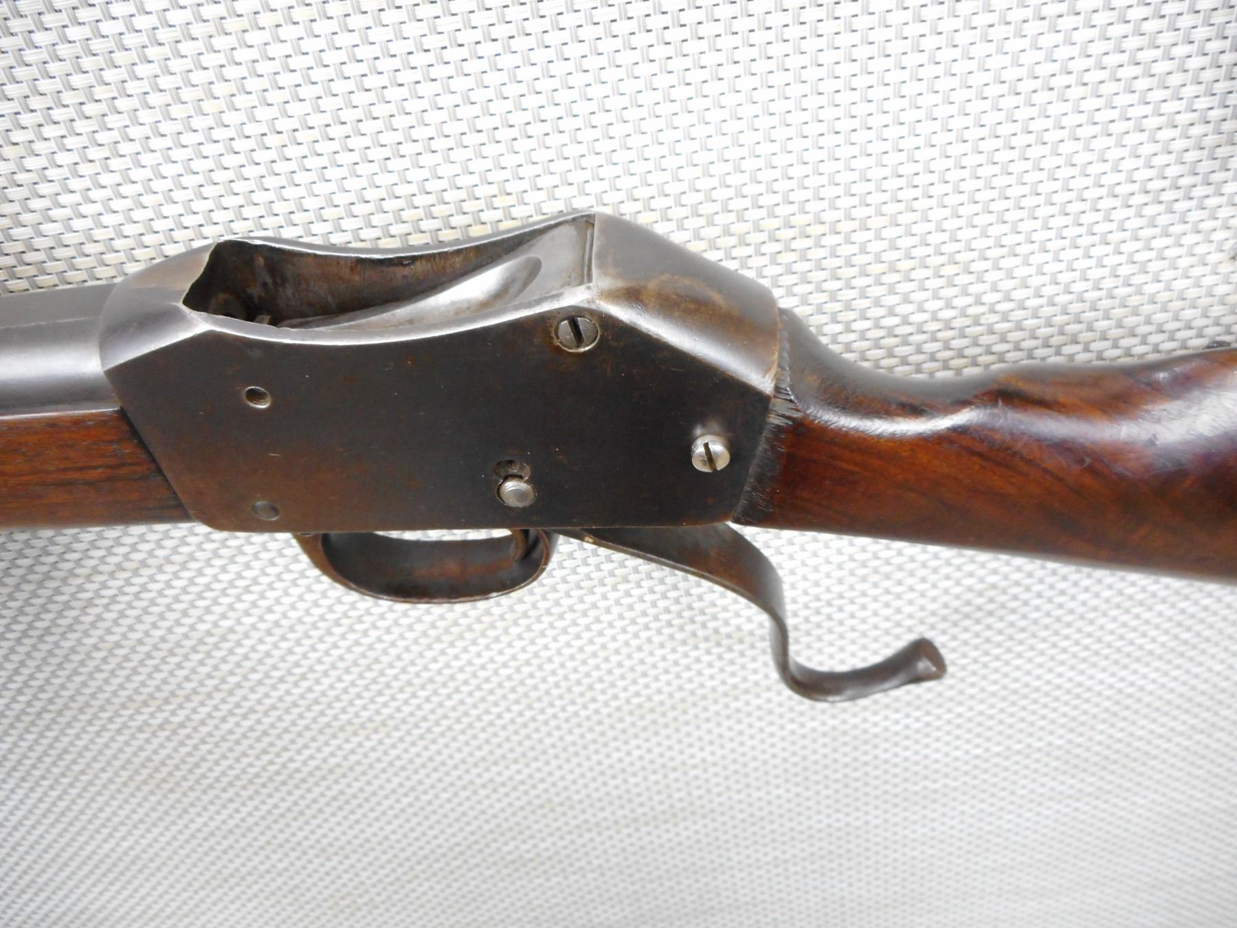 MARTINI ENFIELD , MODEL: MARTINI SINGLE SHOT SPORTER , CALIBER: 303 BR , BORE IS GOOD, BLADE FRONT AND ADJUSTABLE REAR SIGHT, THE REAR SIGHT IS A HERLAND RIFLE SIGHT FROM GLASGOW NOVA SCOTIA WHICH IS ADJUSTABLE FOR ELEVATION AND WINDAGE, SHOWS SOME HANDLING MARKS, RECEIVER HAS BEEN DRILLED FOR SCOPE MOUNT, BUTT STOCK HAS NUMEROUS CHIPS AT THE WRIST, STEEL BUTT PLATE , SERIAL # 721 , ACTION: FALLING BLOCK SINGLE SHOT , BARREL LENGTH: 26" , CONDITION: 4/10 , STOCK # 9114 , CLASS: CANADIAN NON RESTRICTED CLASS
